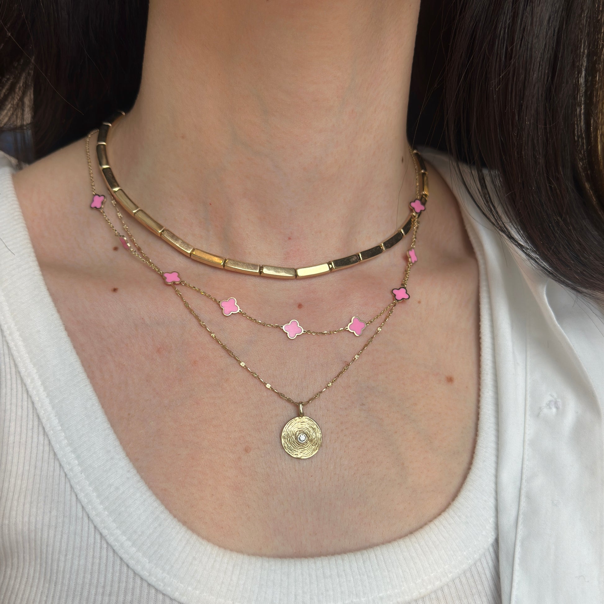 14KT Yellow Gold 7mm Pink Enamel Clover Station Cable Chain Necklace