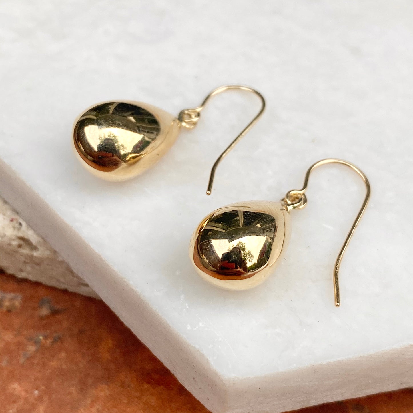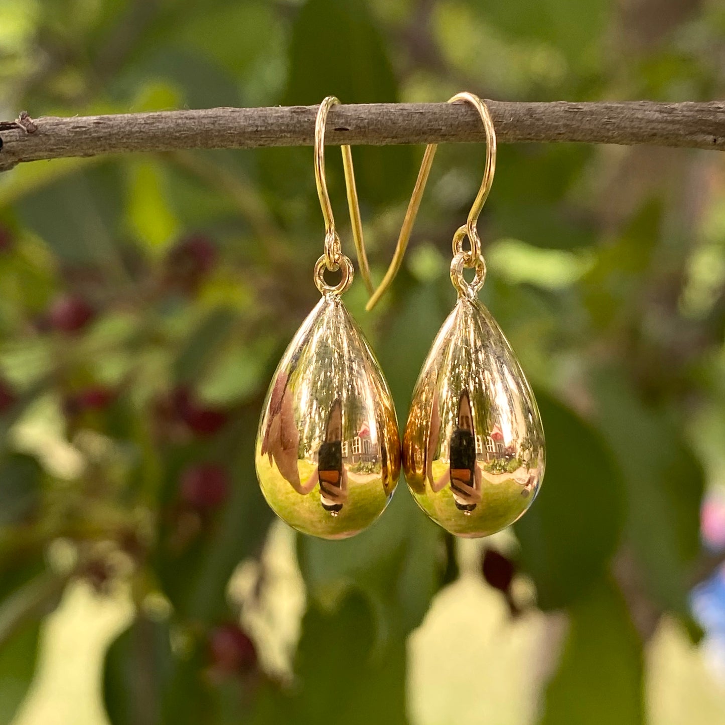 High polished 14KT yellow gold ear wires with 3D teardrop/ pear-shape dangles. Easily dress them up or down! The hollow bead makes them comfortable for everyday wear!