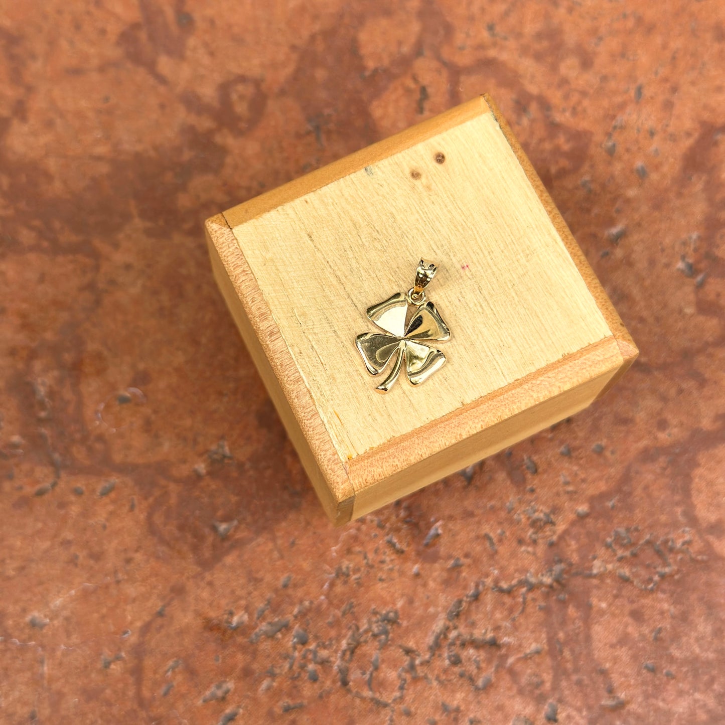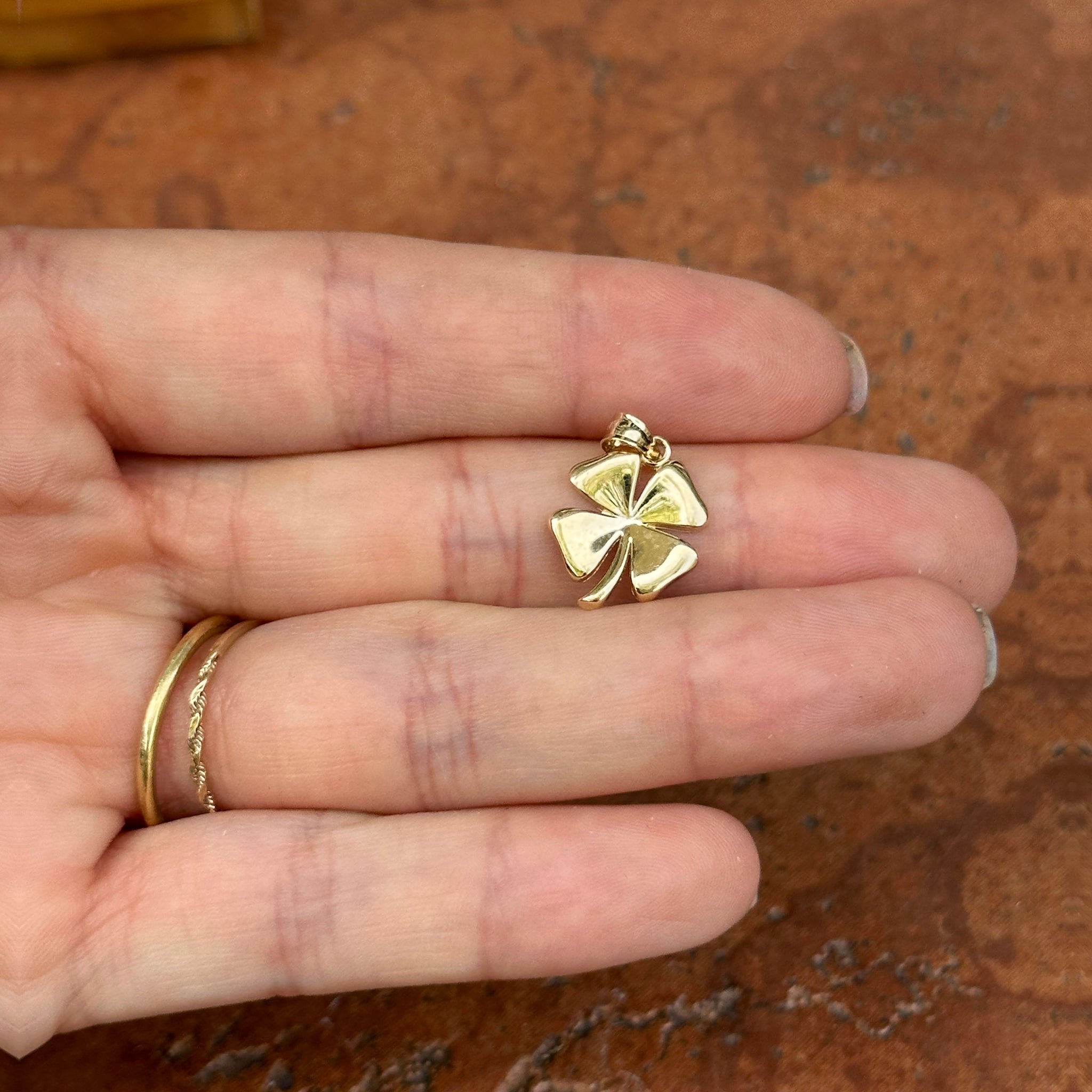 14KT yellow gold 4-leaf clover pendant lucky charm. Lucky gold charm with high polished finish and curves like a clover leaf.