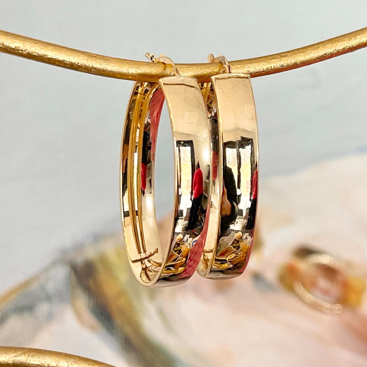 14KT yellow gold polished oval hoop earrings. Really nice, large, statement hoop earrings with high polish.