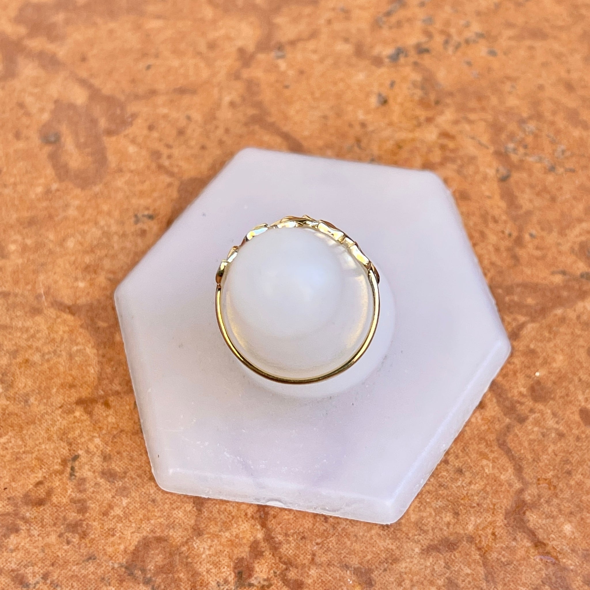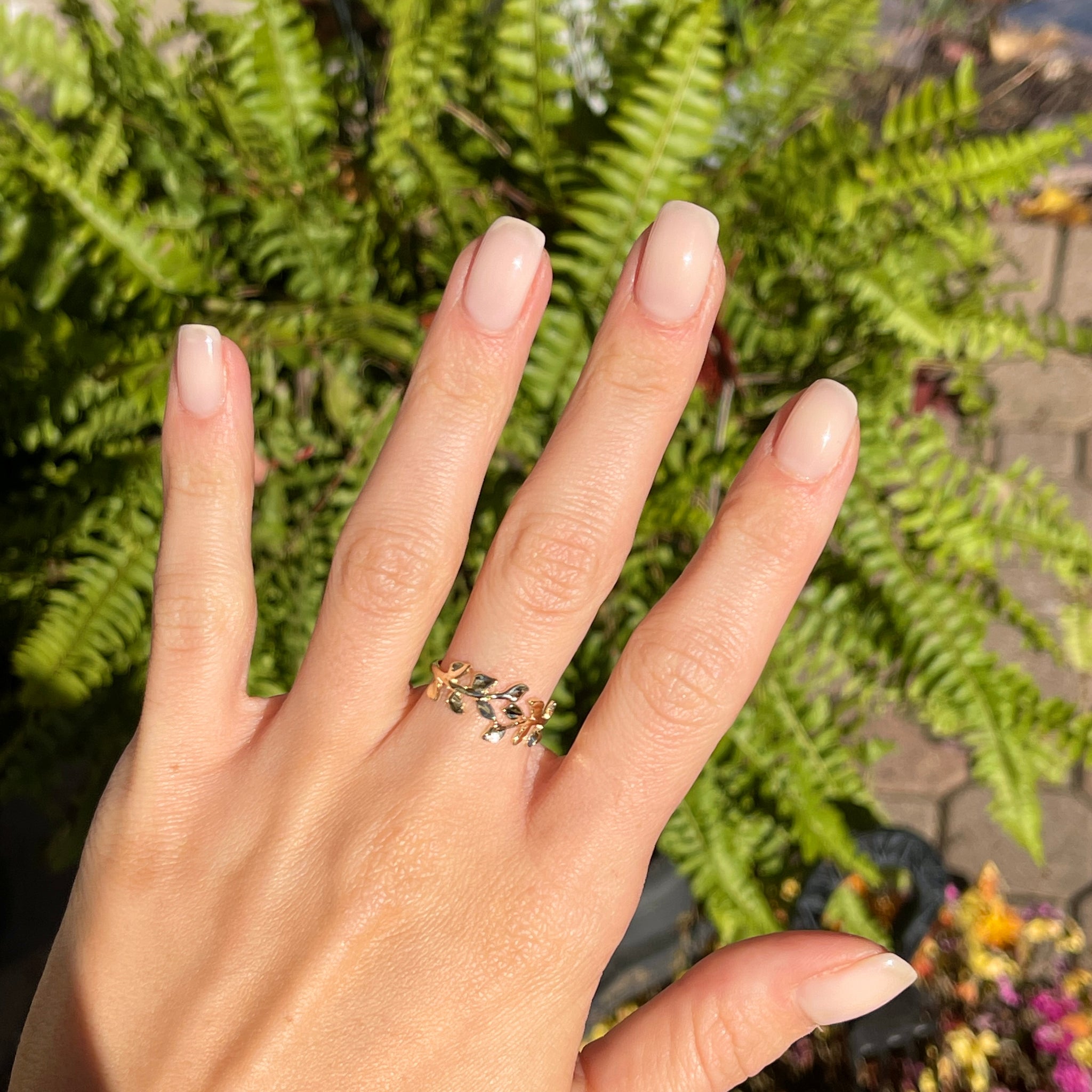 Unique + boho 14KT yellow gold ring with leaf/ floral design pattern. The leaf pattern goes around half the ring (the front half which shows on the finger).