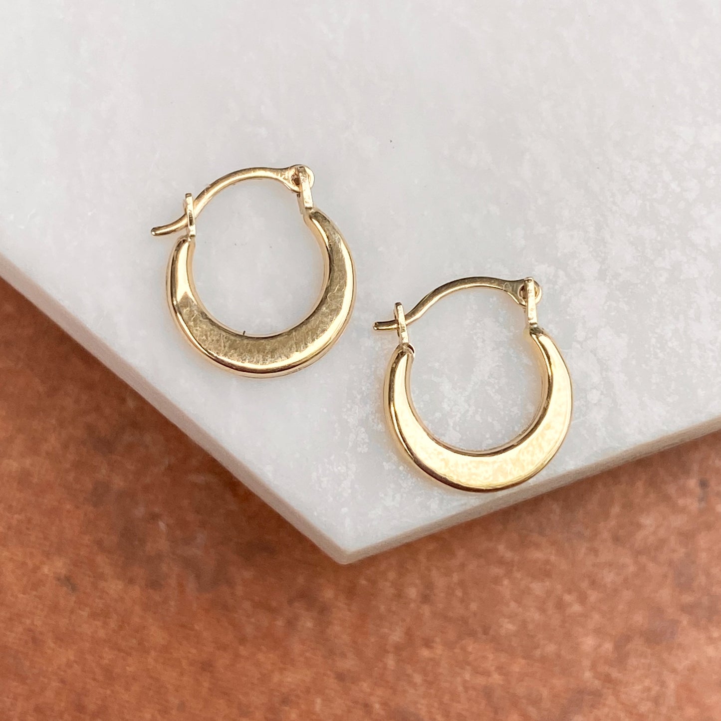 Polished 14KT yellow gold hollow, rounded hoop earrings. These teeny tiny hoops earrings are perfect for someone looking for a mini hoop style.