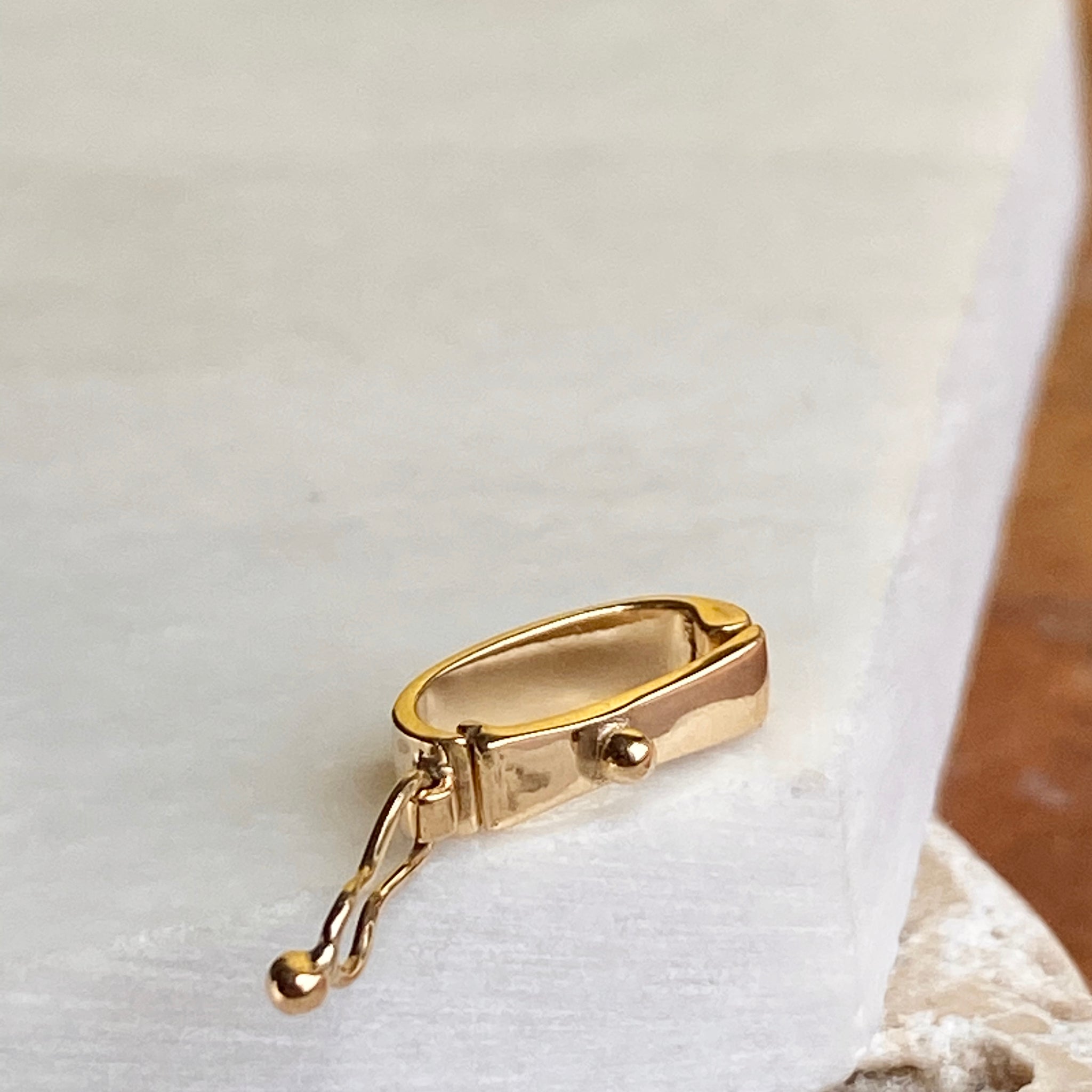 14KT yellow gold pendant/enhancer/slide/shortener. This item allows you to add your own pendants that have smaller bails onto necklaces such as wide Herringbones, Omegas & pearls/beads, that usually you cannot wear those pendants with. Works best with pendants that have a "O" ring style bail. It also can serve as a shortener/gatherer for pearls or beads, or when a clasp breaks on a necklace, it allows you to wear it, by attaching this piece as a clasp. A must have for any jewelry wardrobe. Make use of all your jewelry with this piece!