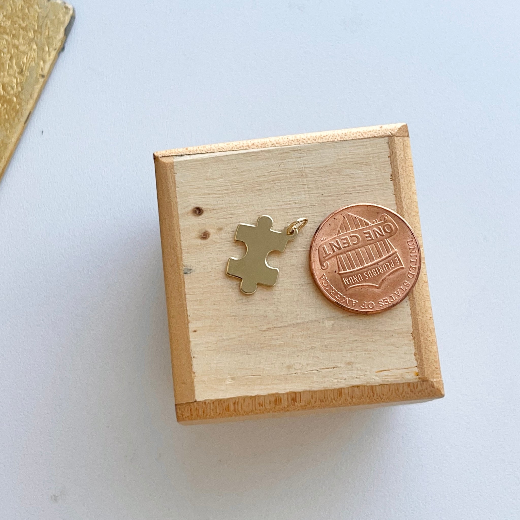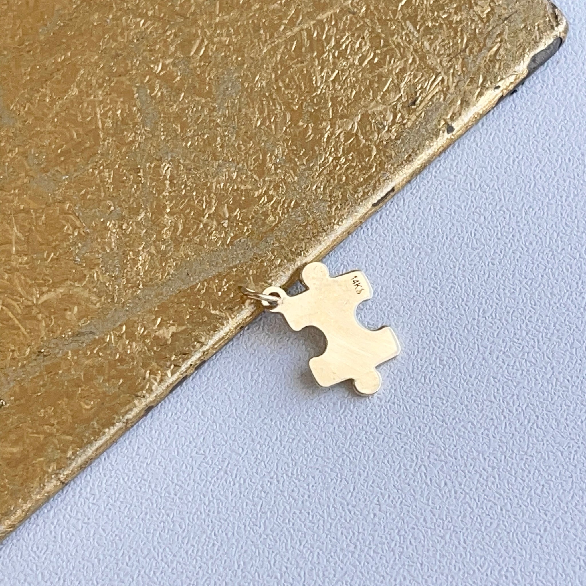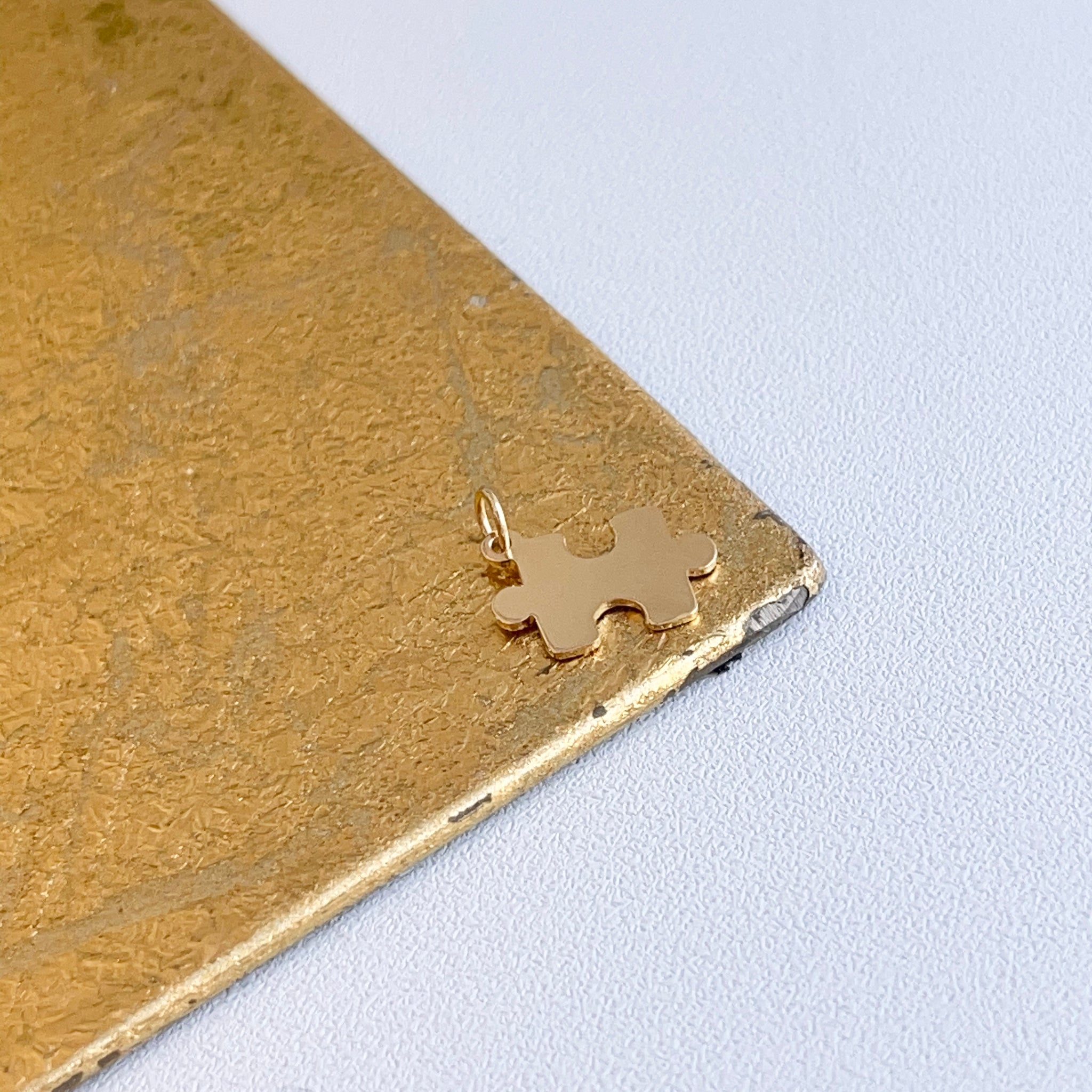 14KT yellow gold shiny-finish, puzzle piece pendant charm. Makes a great gift for a partner, friend, or your "missing puzzle piece".