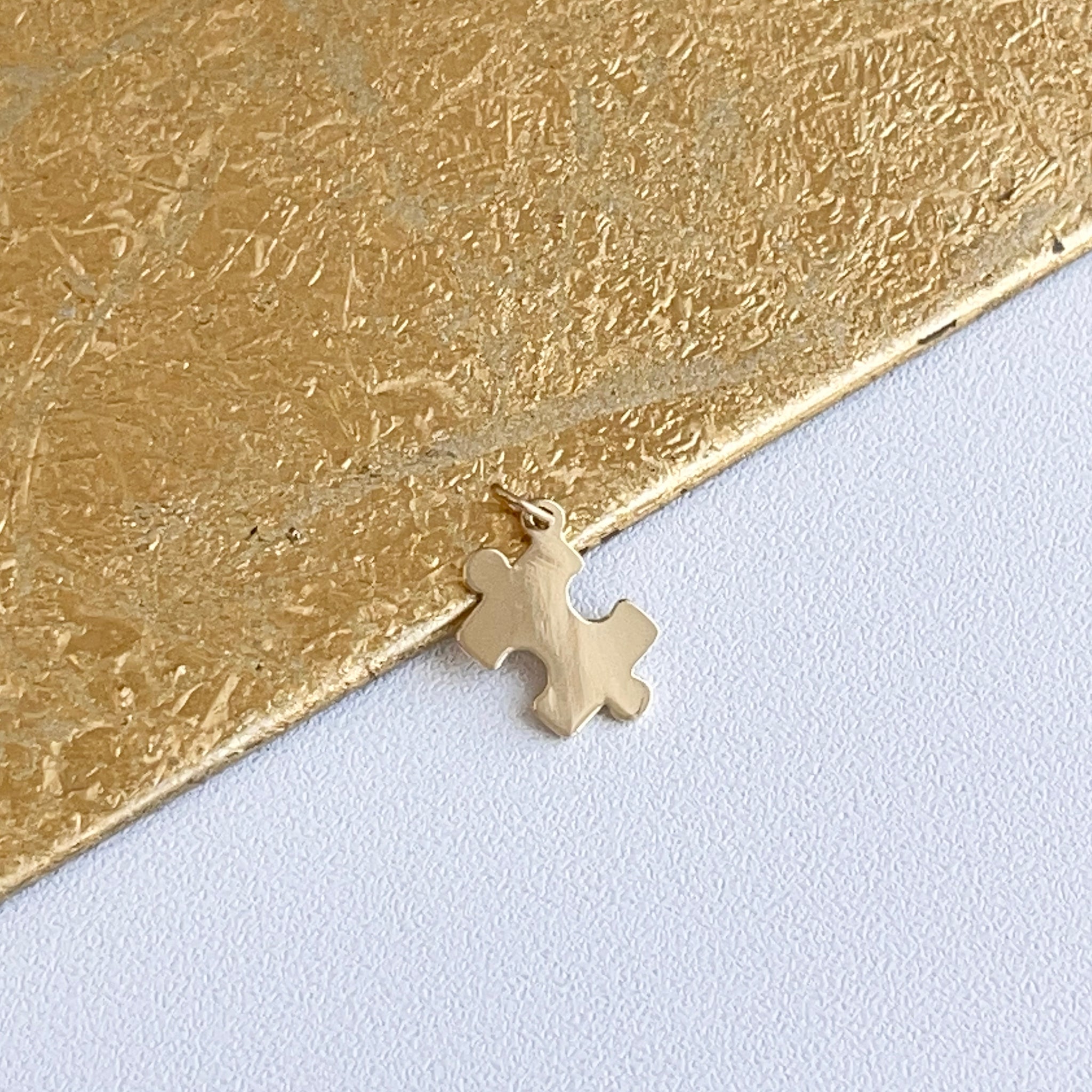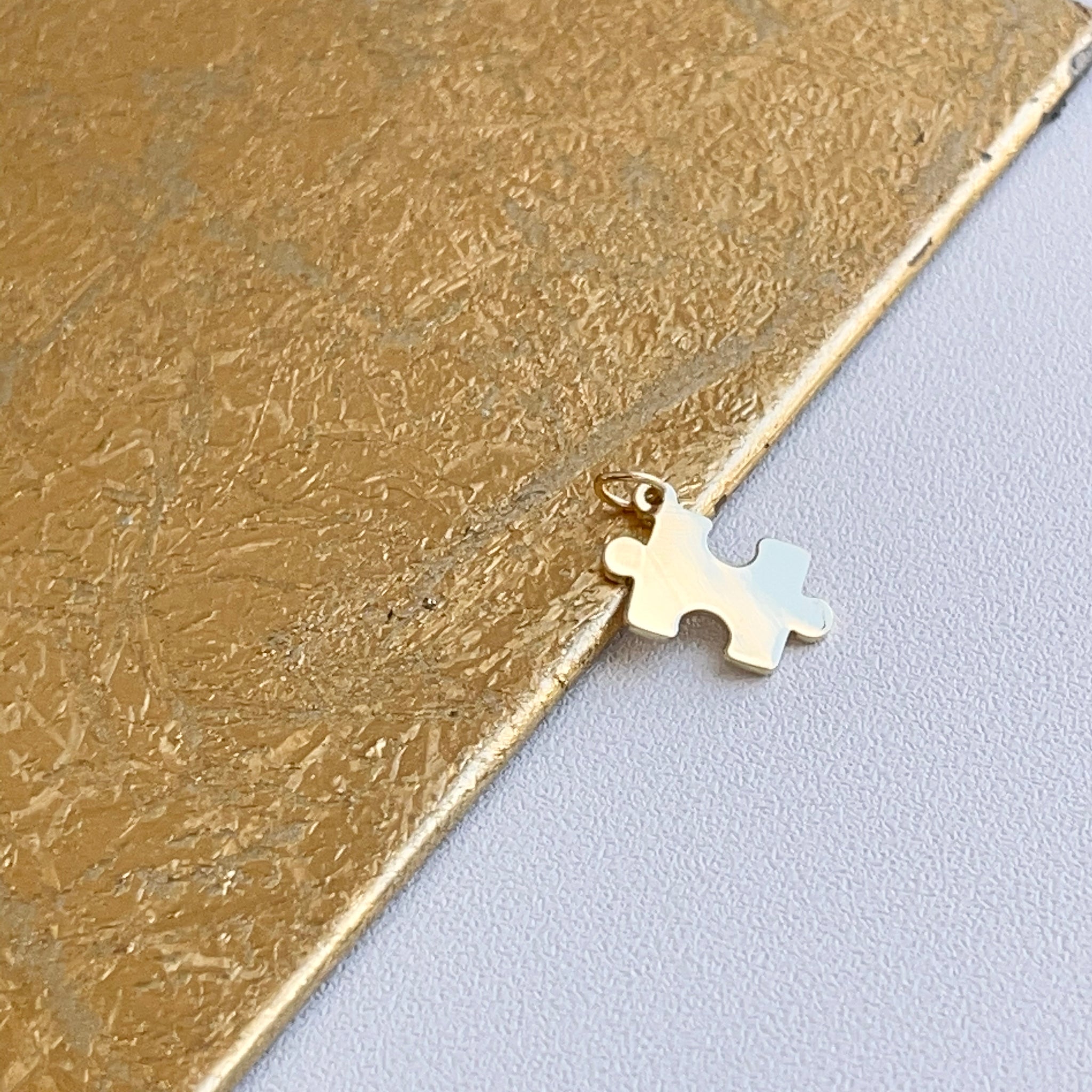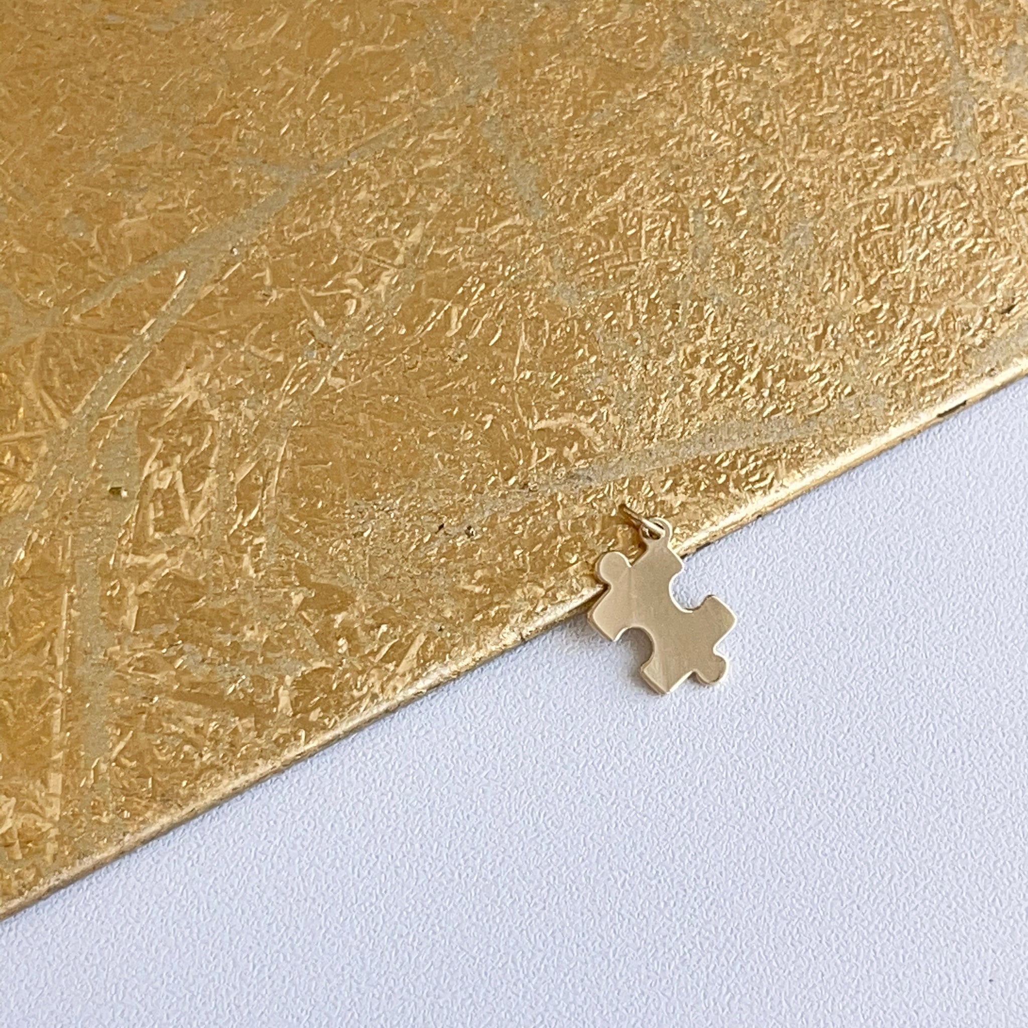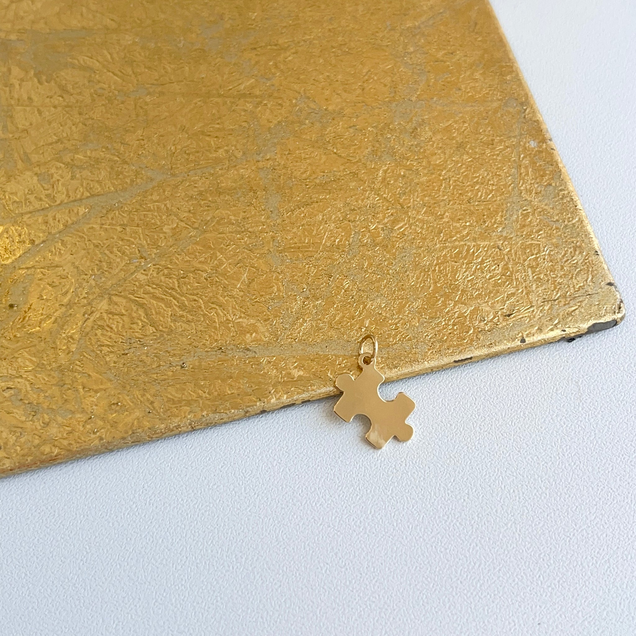 14KT yellow gold shiny-finish, puzzle piece pendant charm. Makes a great gift for a partner, friend, or your "missing puzzle piece".