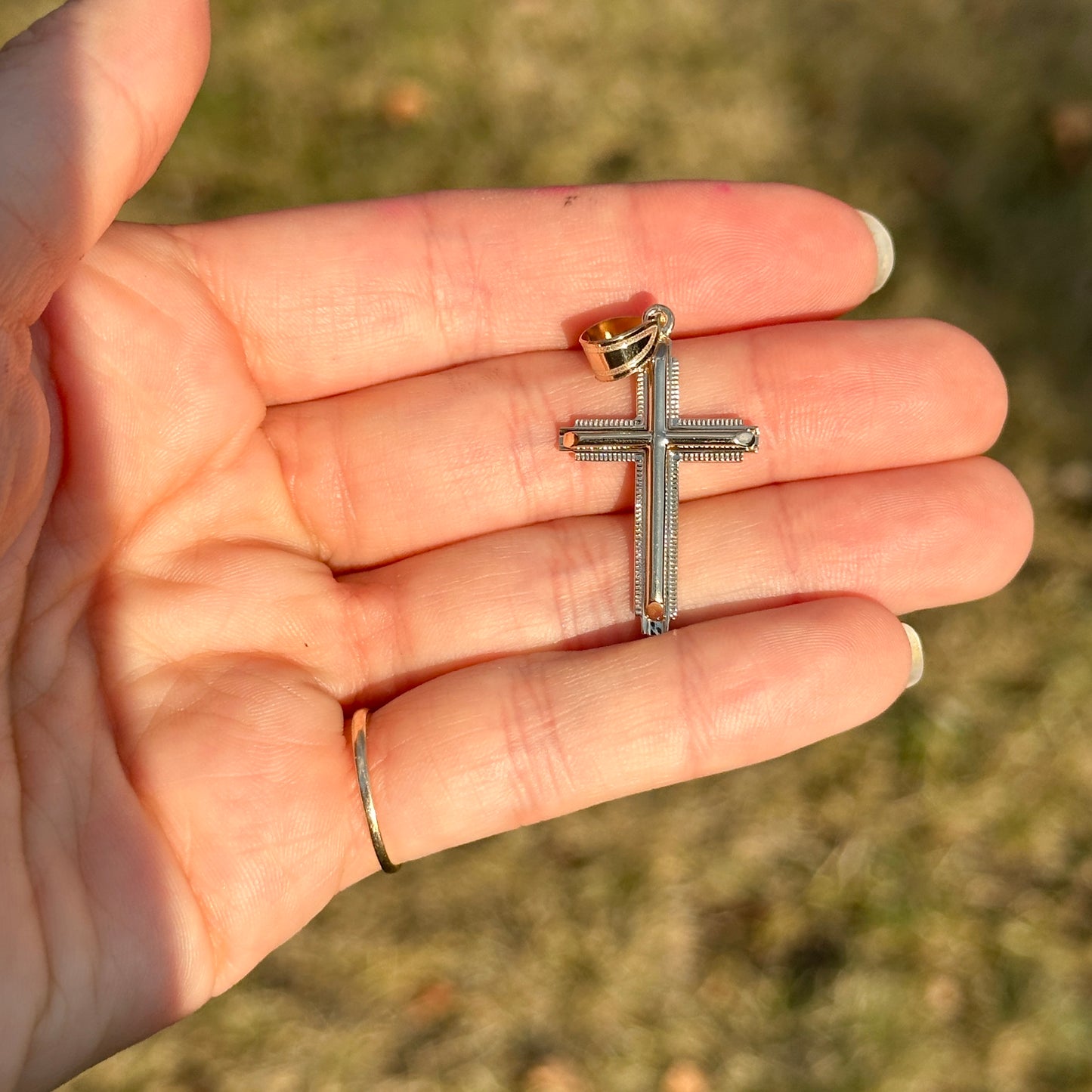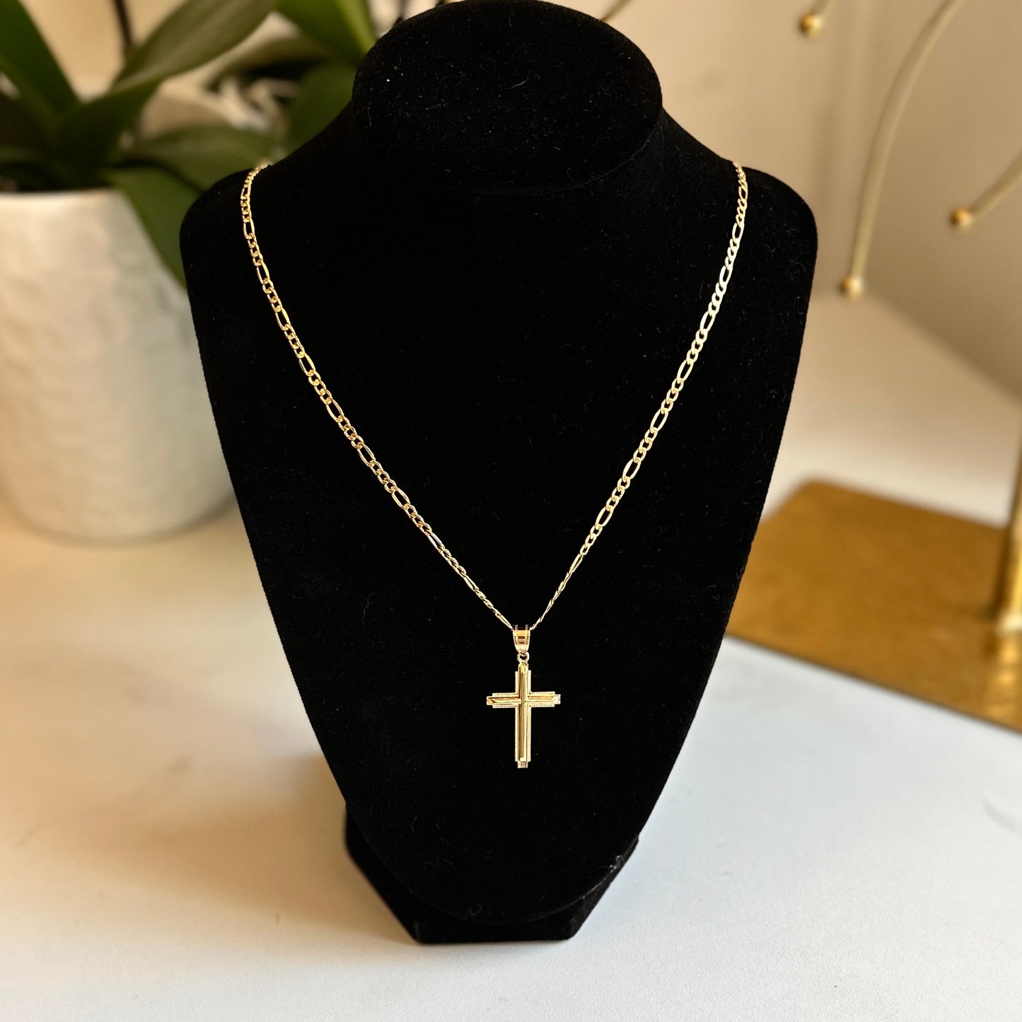 14KT yellow gold raised cross pendant with textured edge detailing.