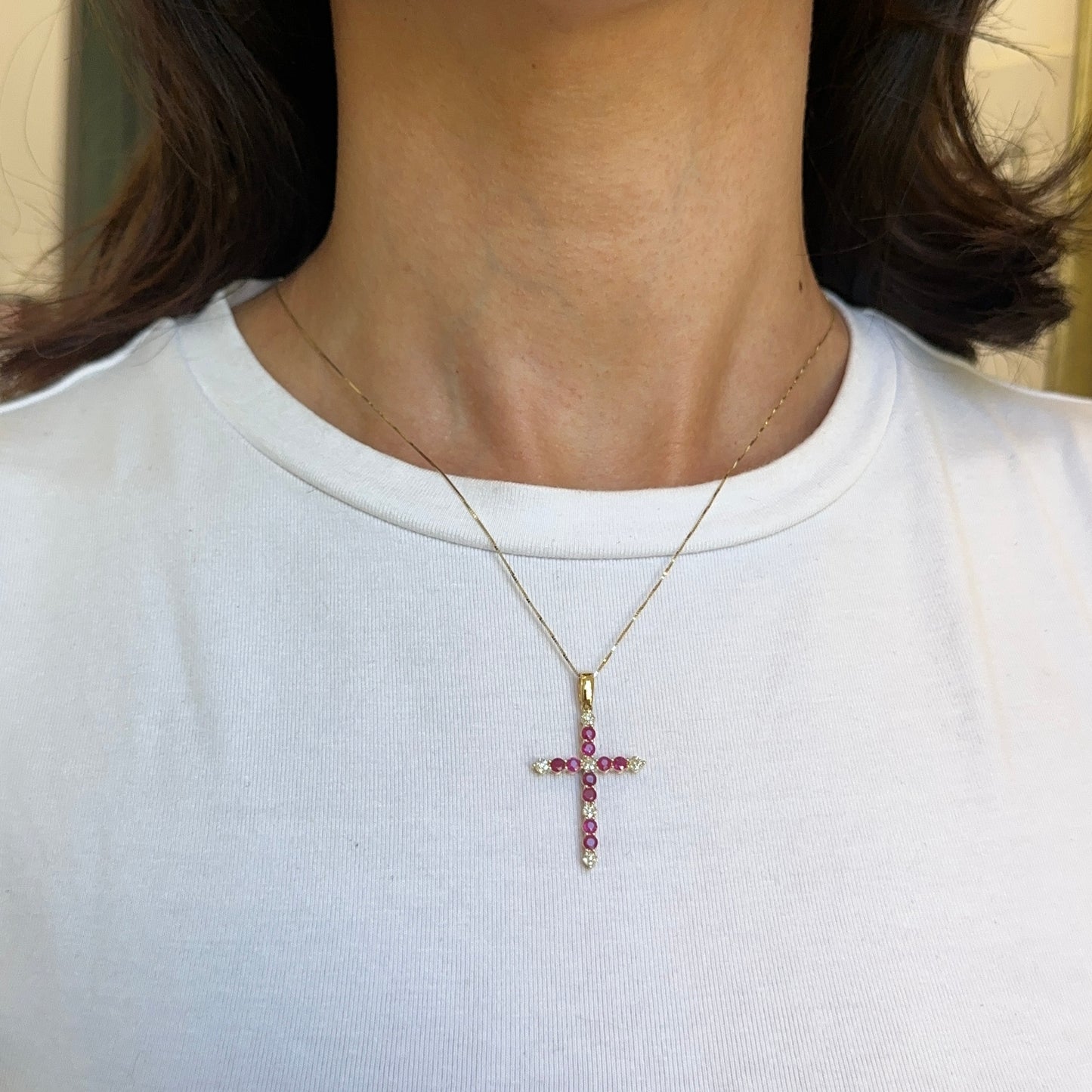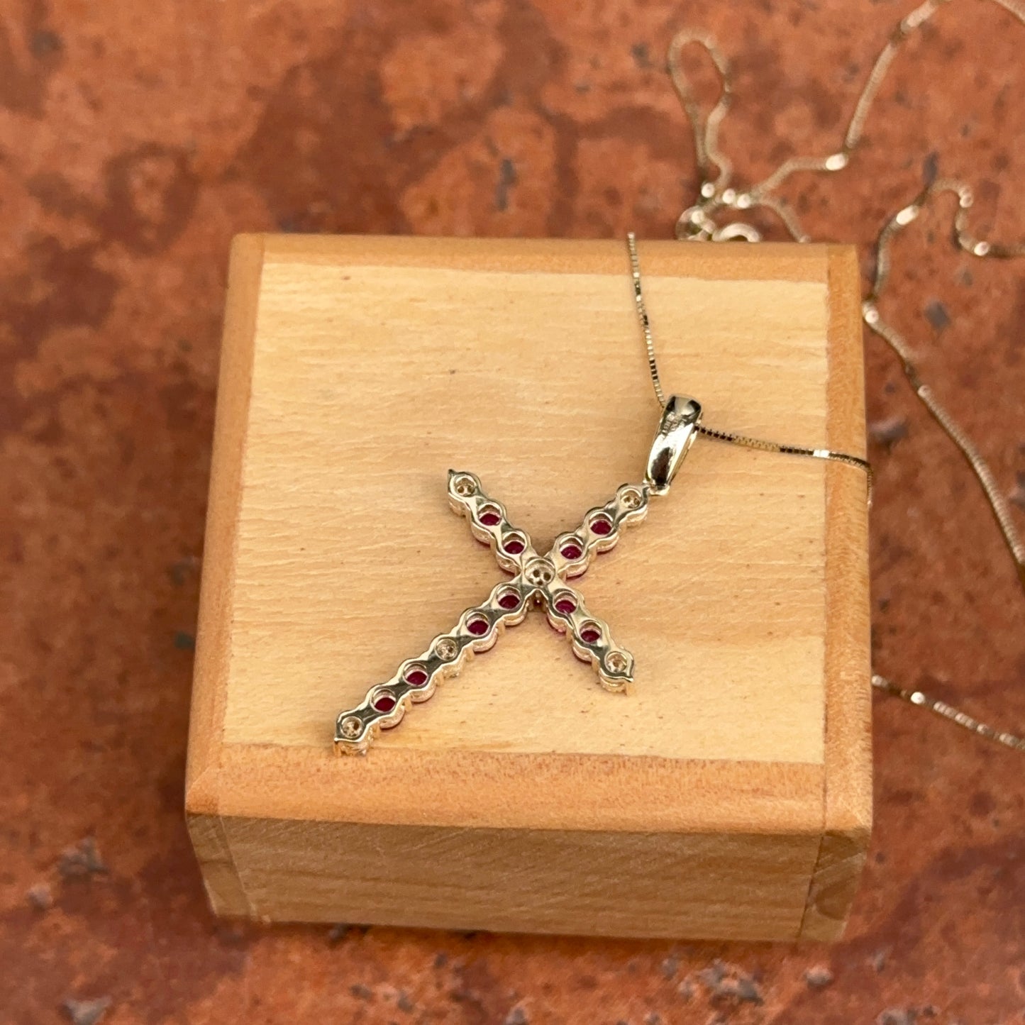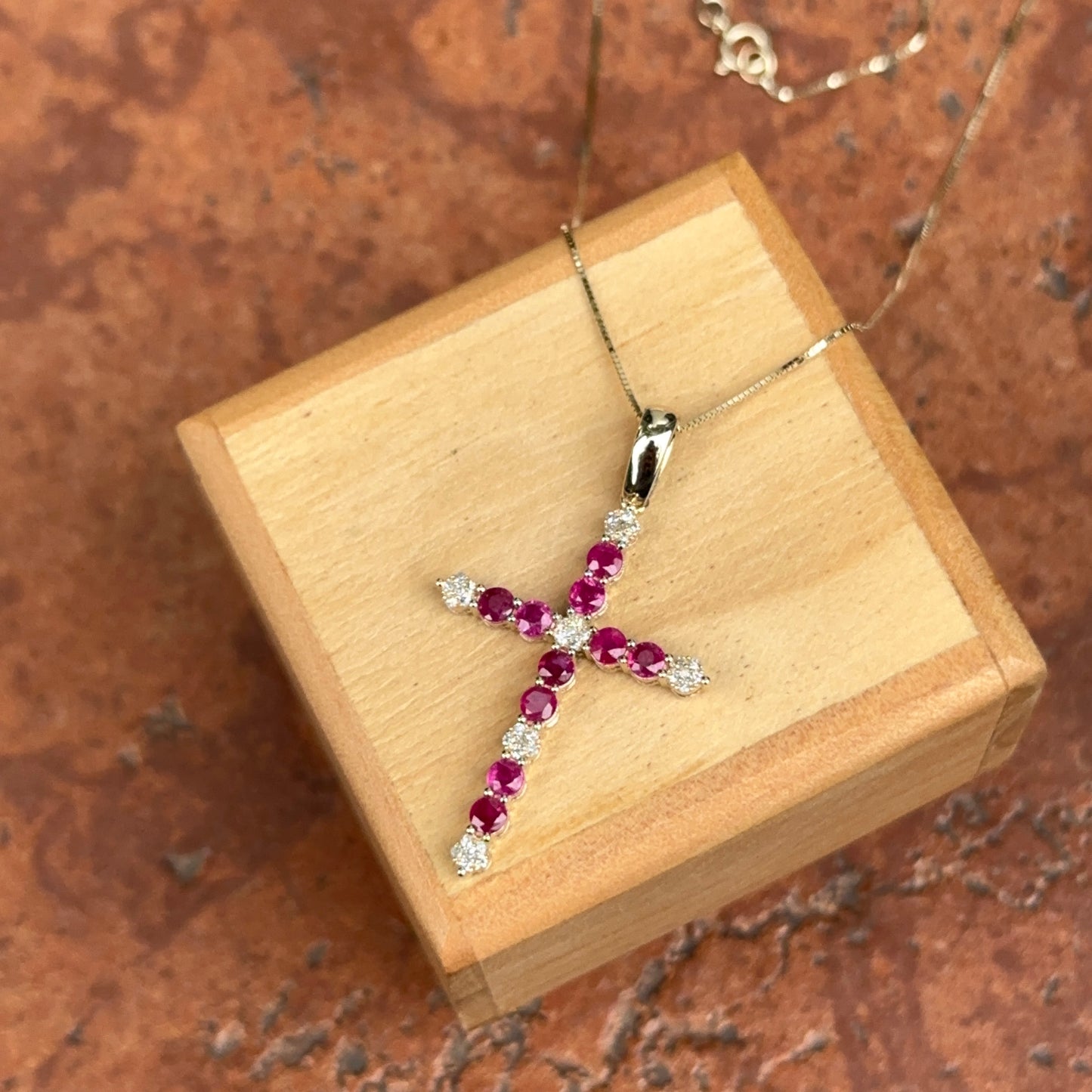 14KT Yellow Gold Red Ruby + Diamond Cross Pendant Necklace