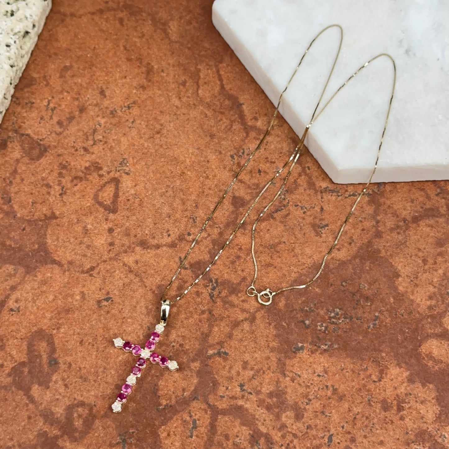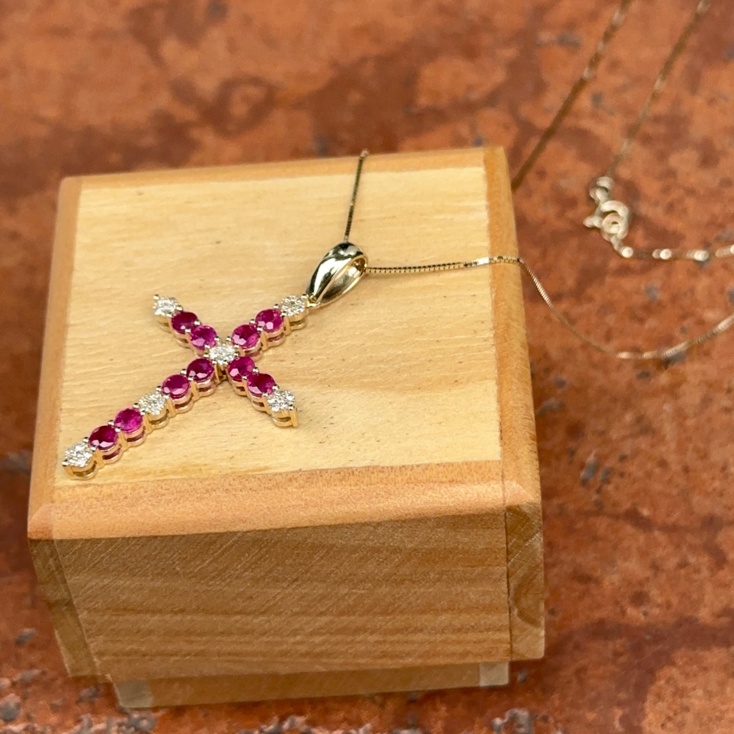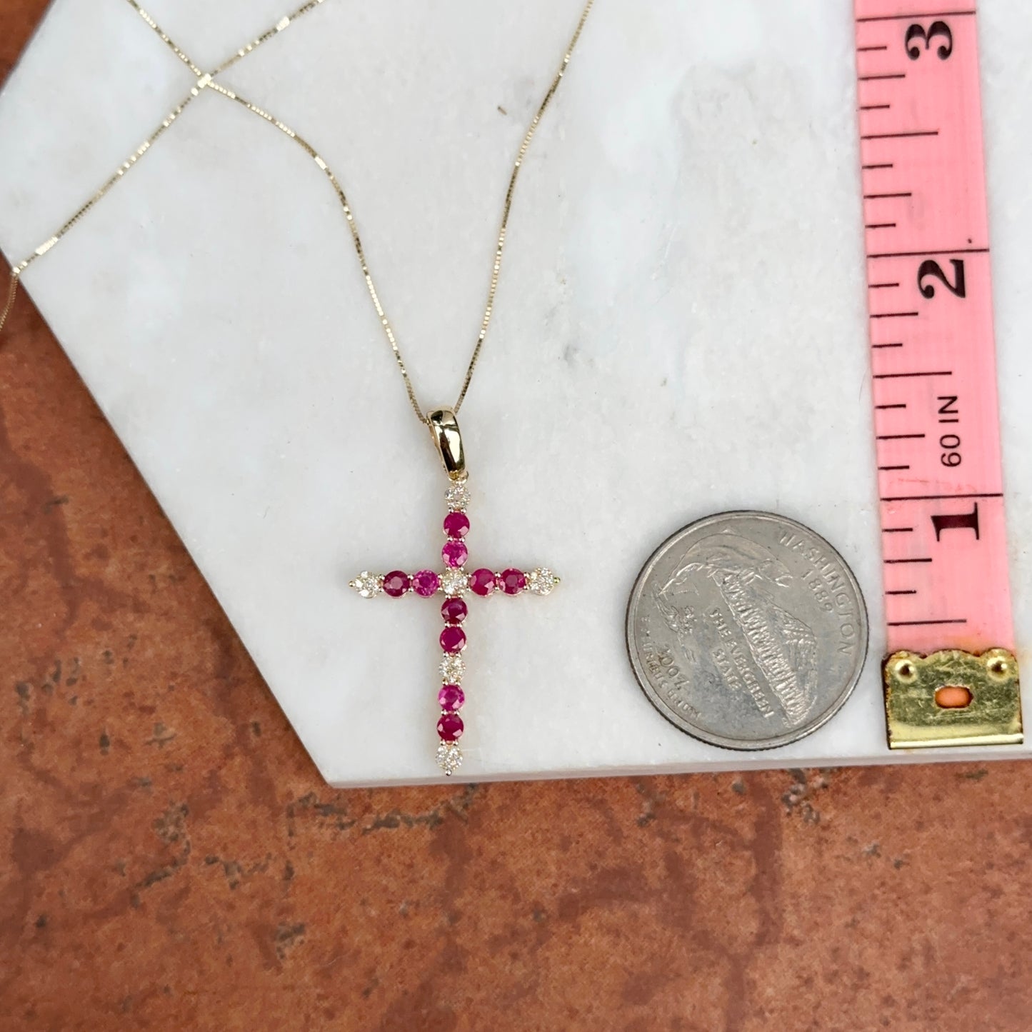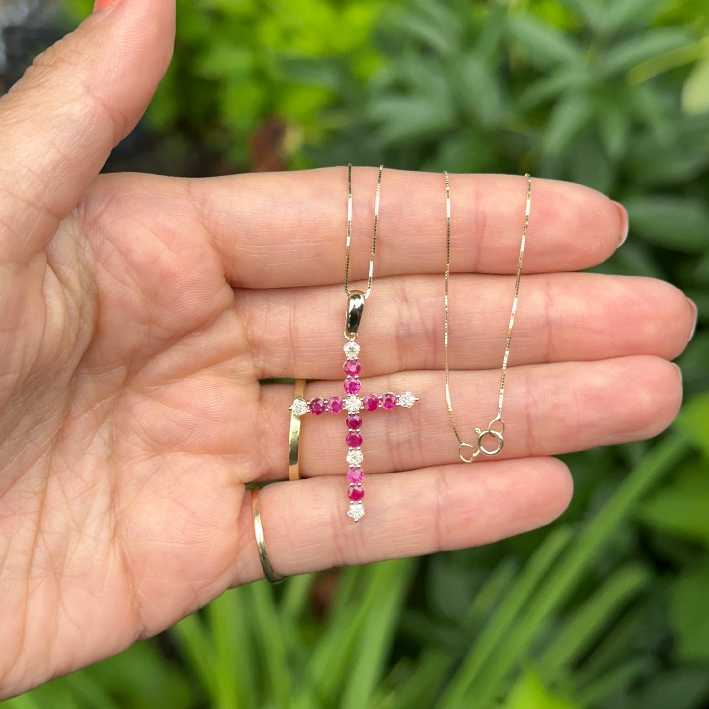14KT Yellow Gold Red Ruby + Diamond Cross Pendant Necklace