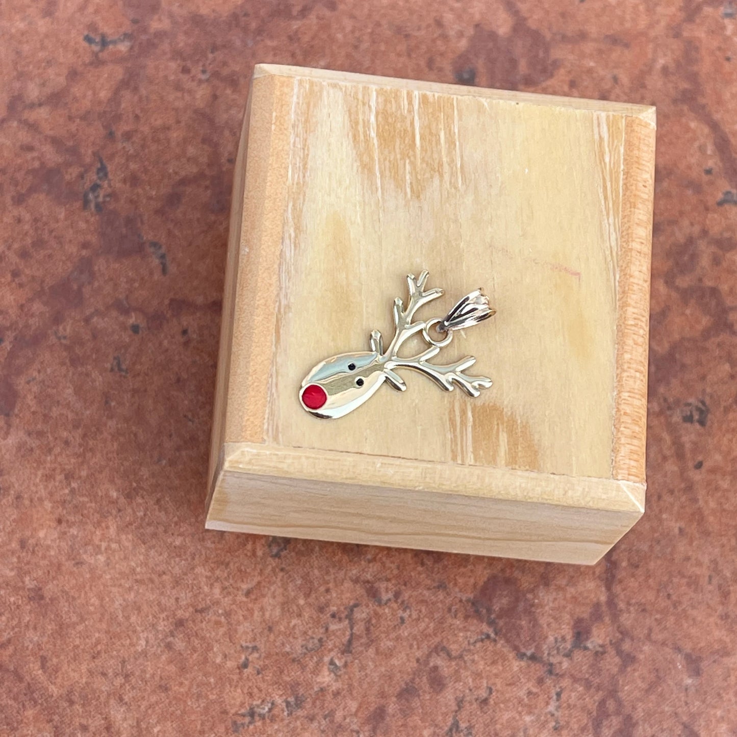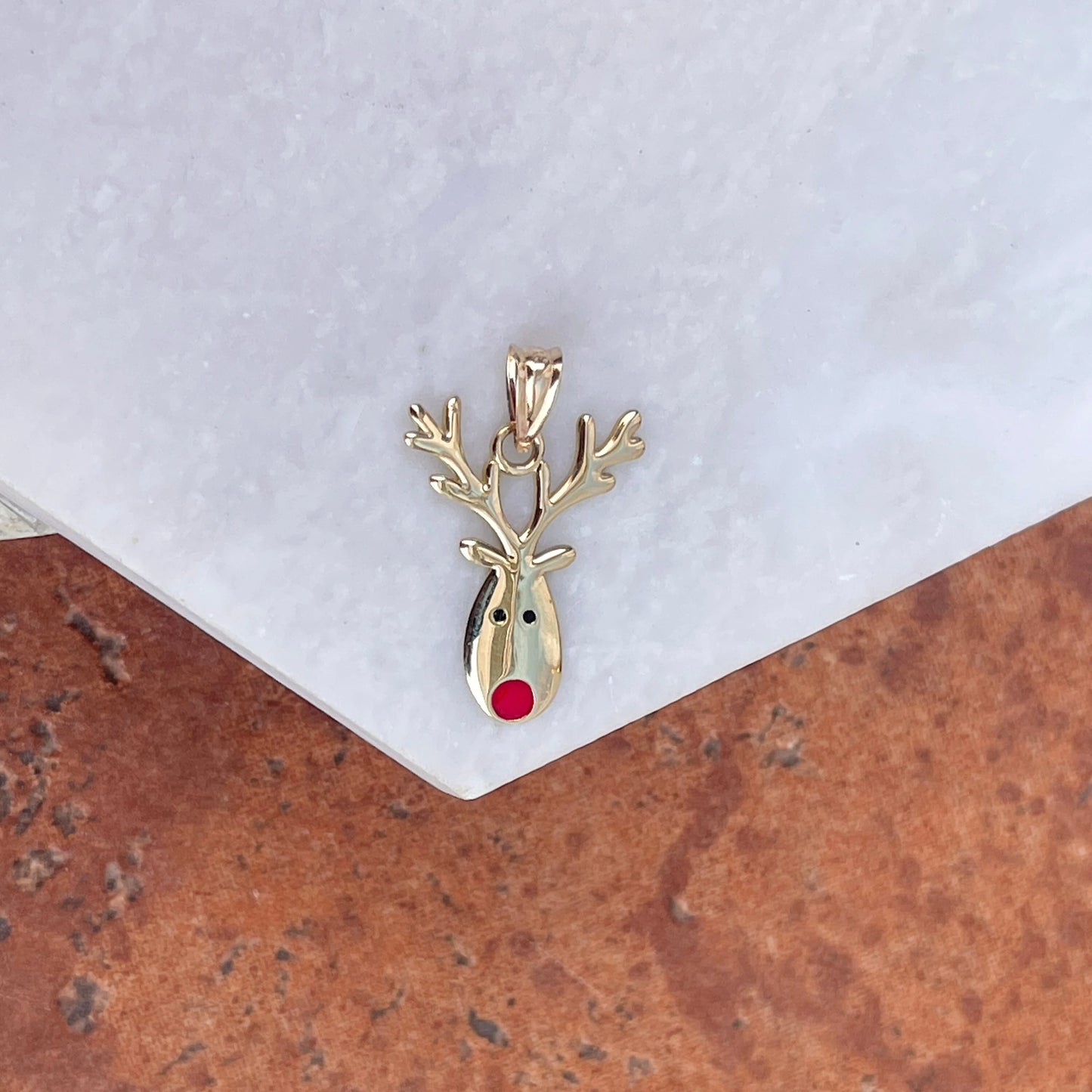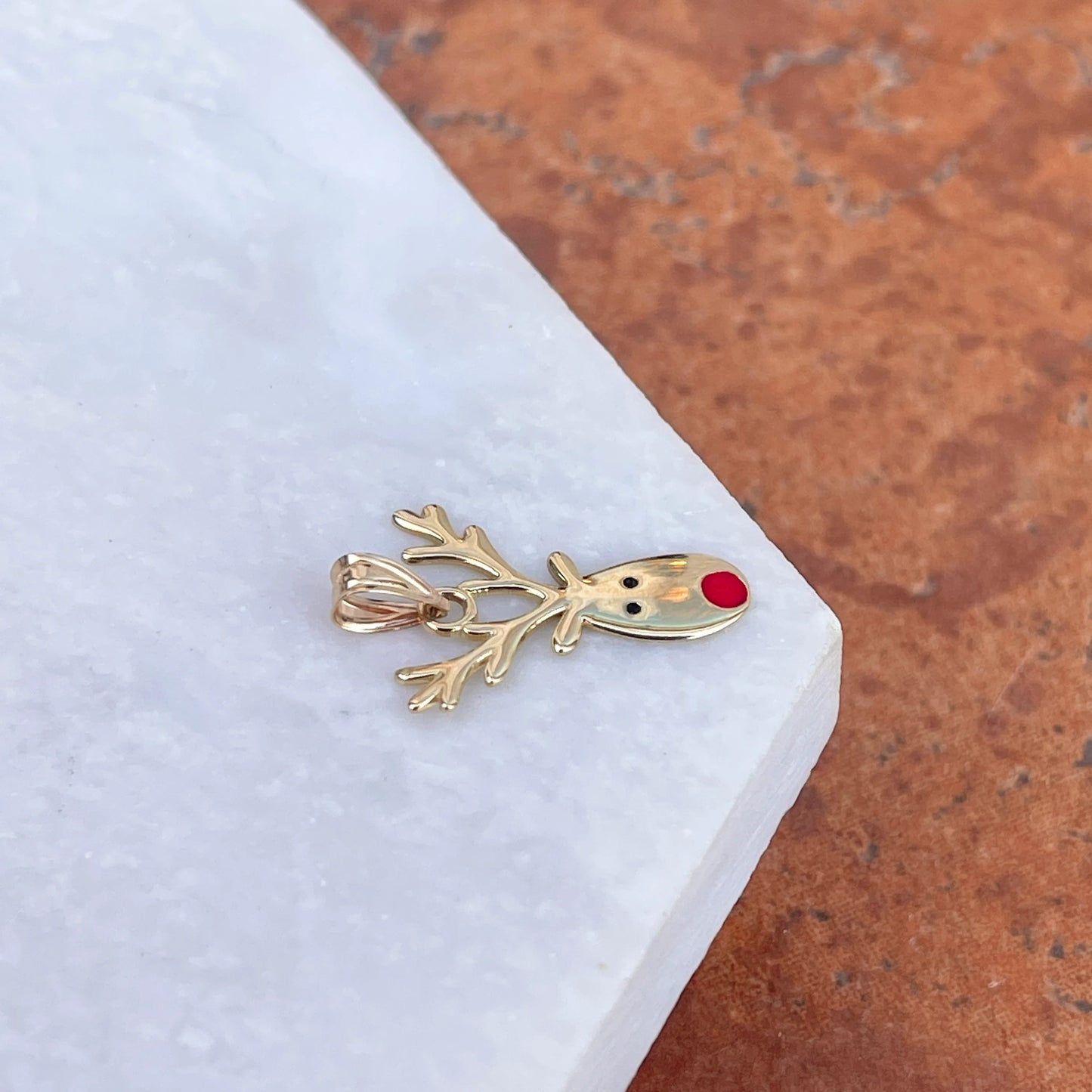 14KT Yellow Gold Reindeer Red Enamel Nose Flat Pendant Charm