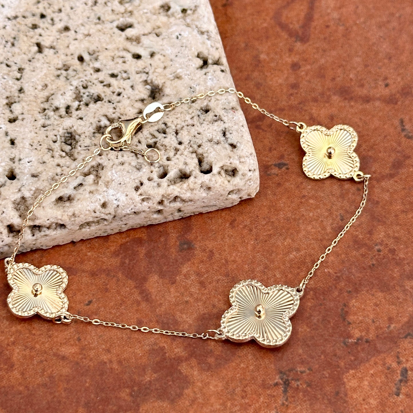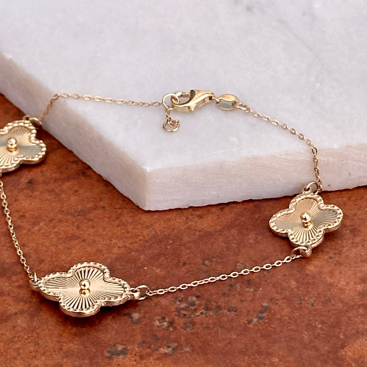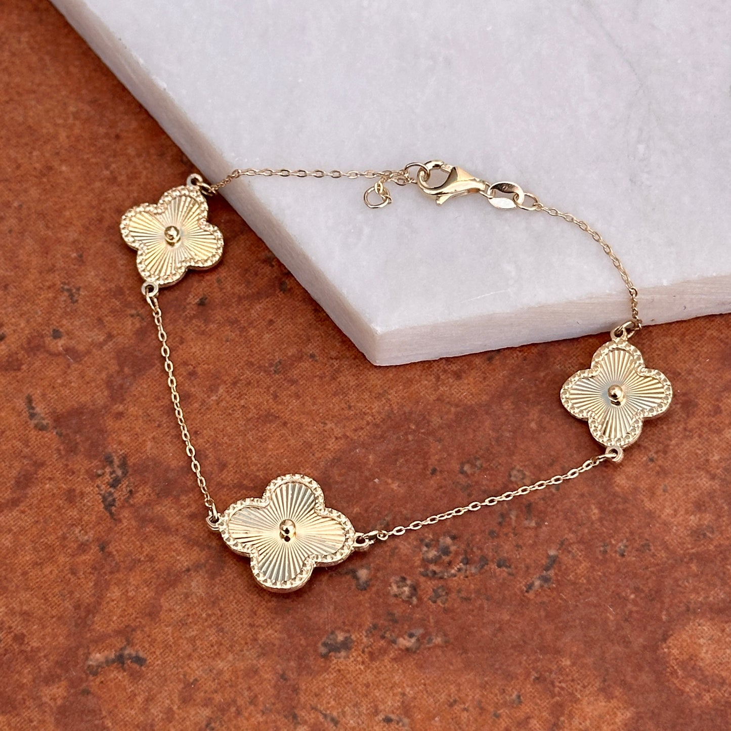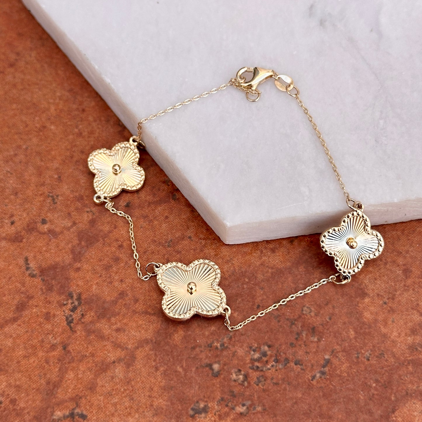 14KT Yellow Gold Ribbed Detail Clover Station Bracelet