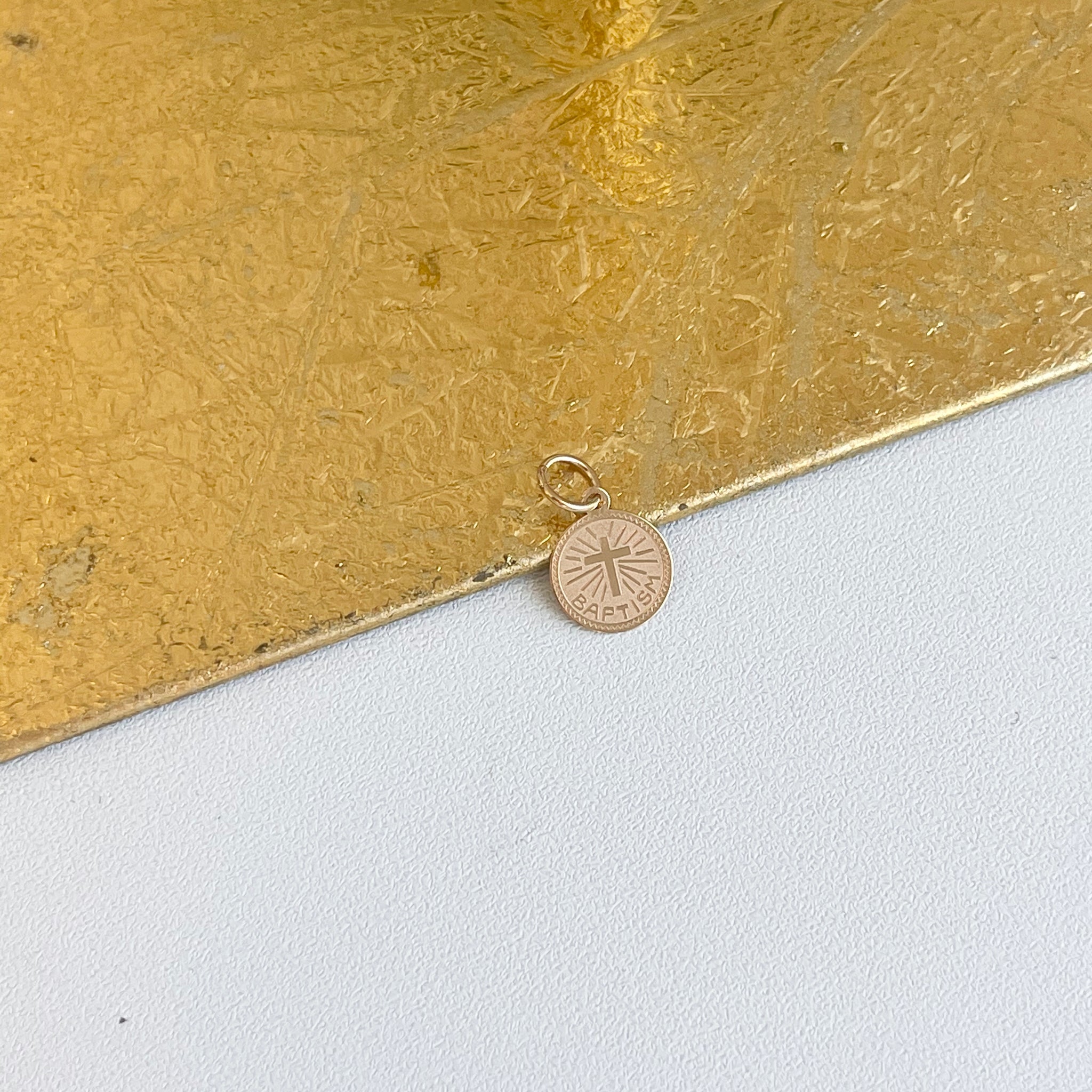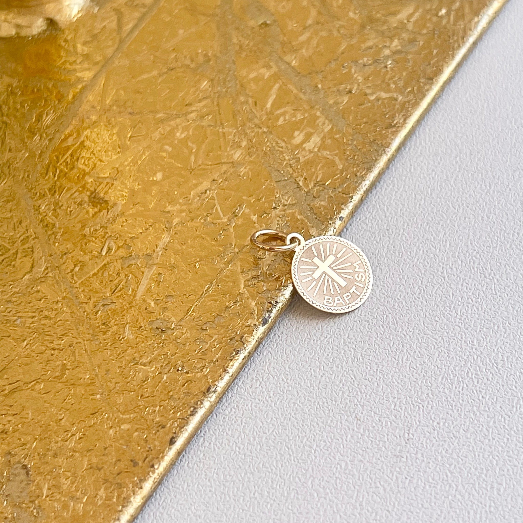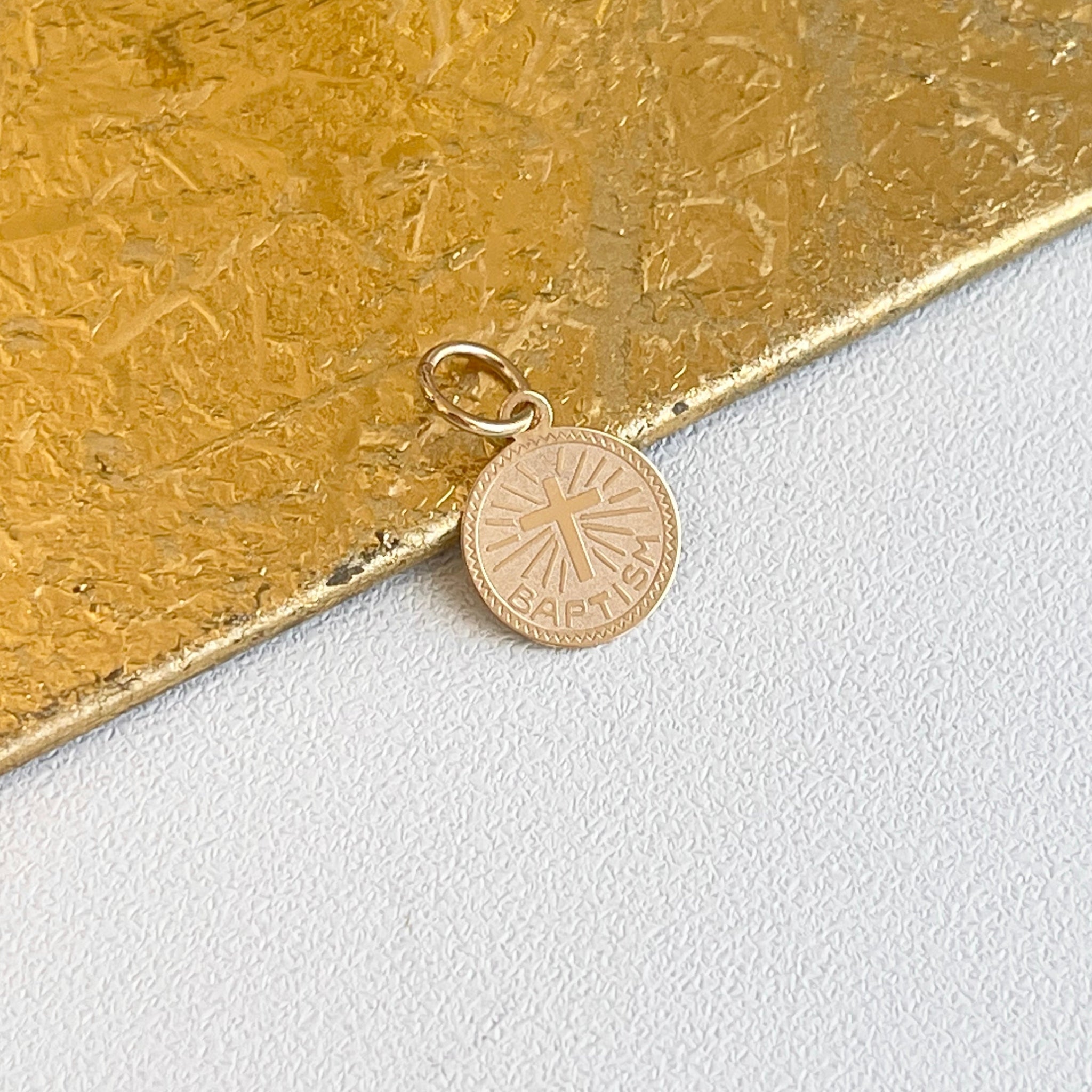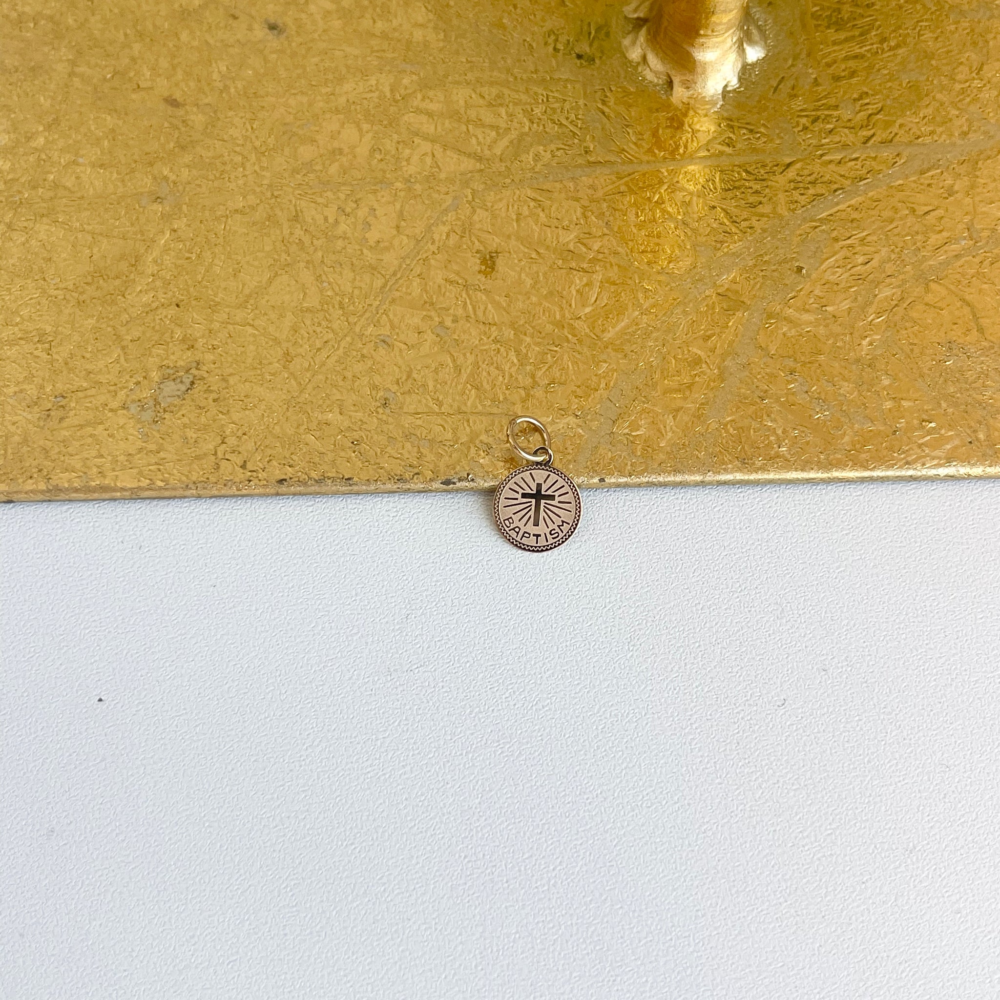 14K yellow gold small, round, baptism with cross pendant charm. Beautiful, small pendant charm perfect for Baptism gifts!