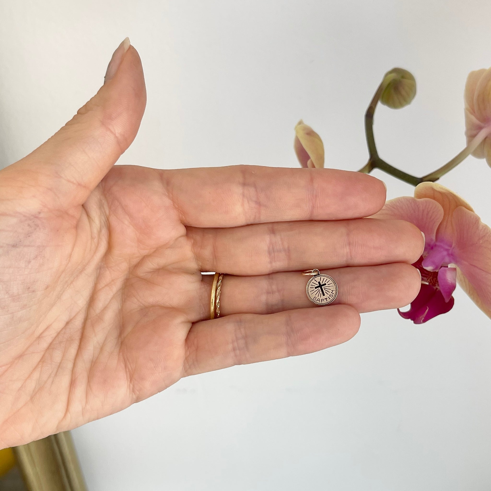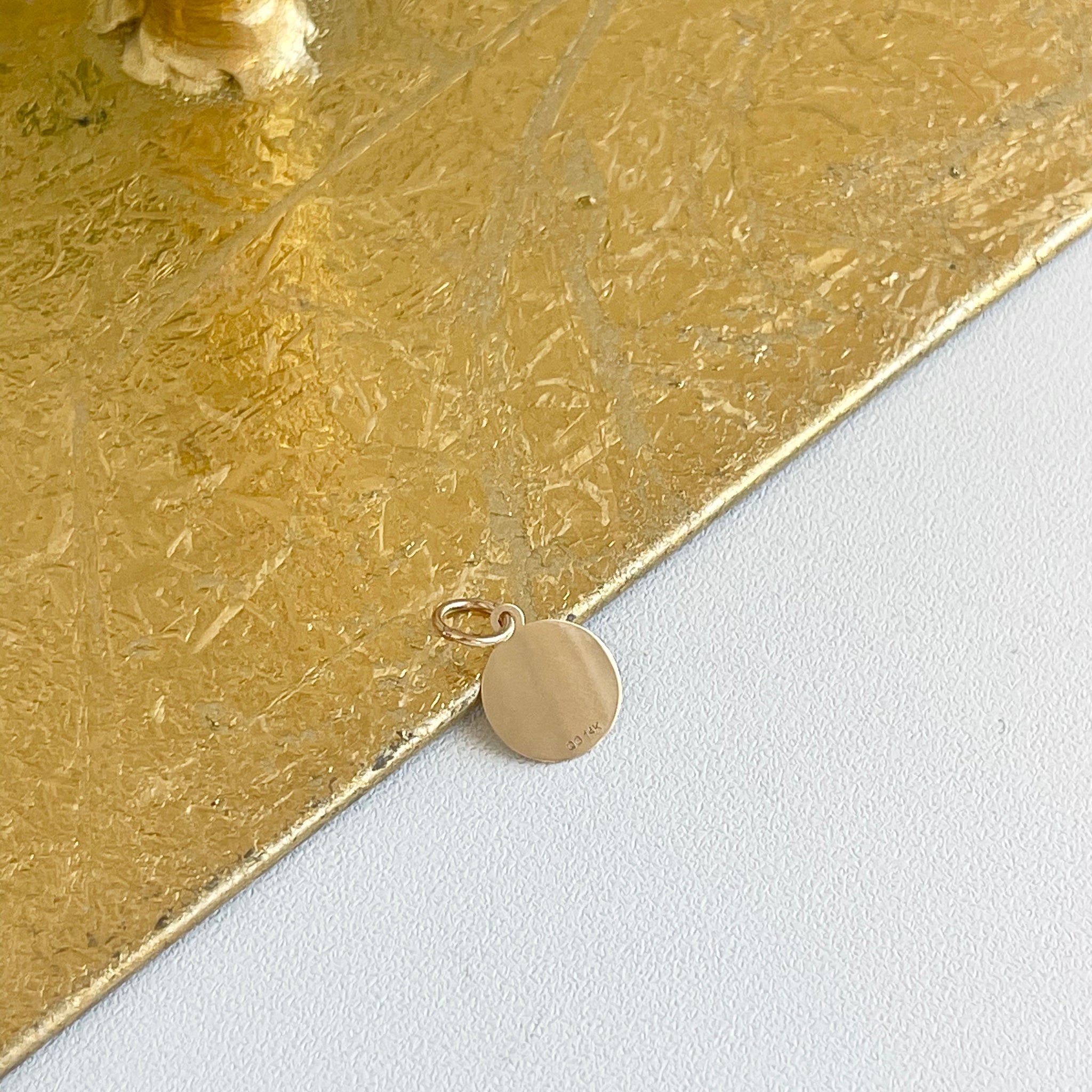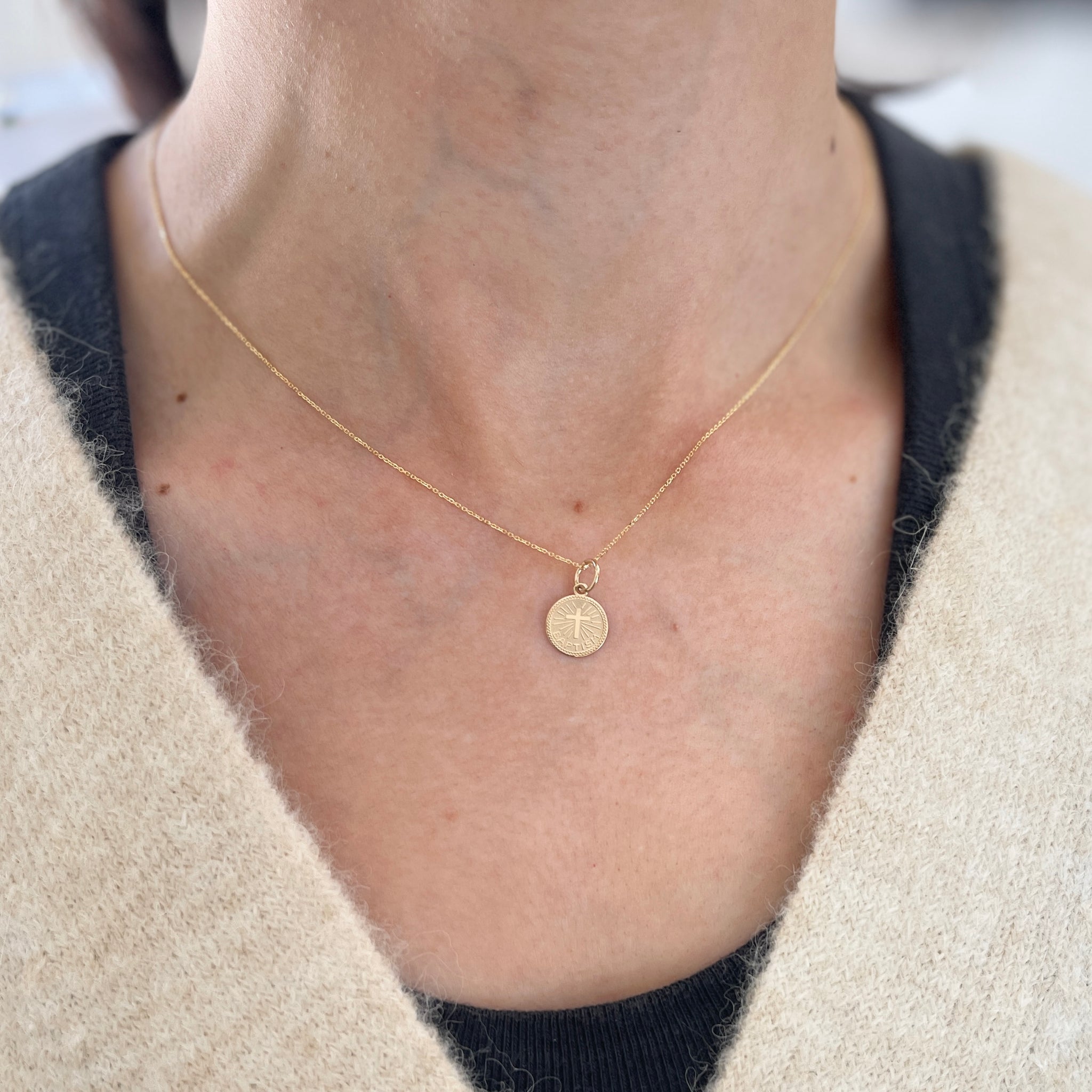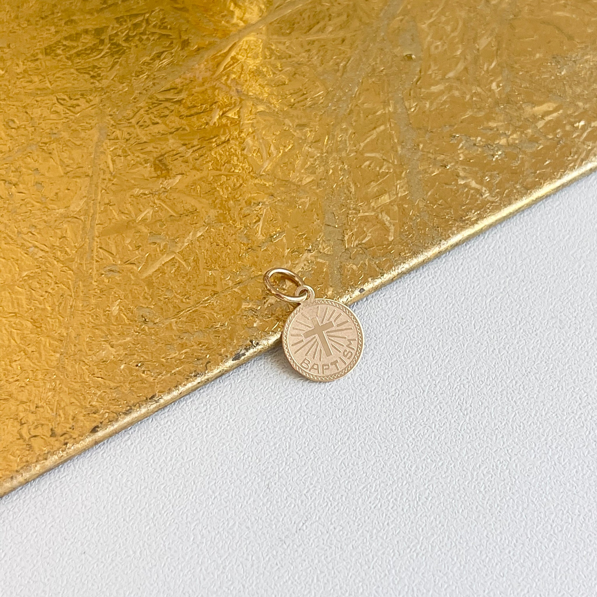 14K yellow gold small, round, baptism with cross pendant charm. Beautiful, small pendant charm perfect for Baptism gifts!
