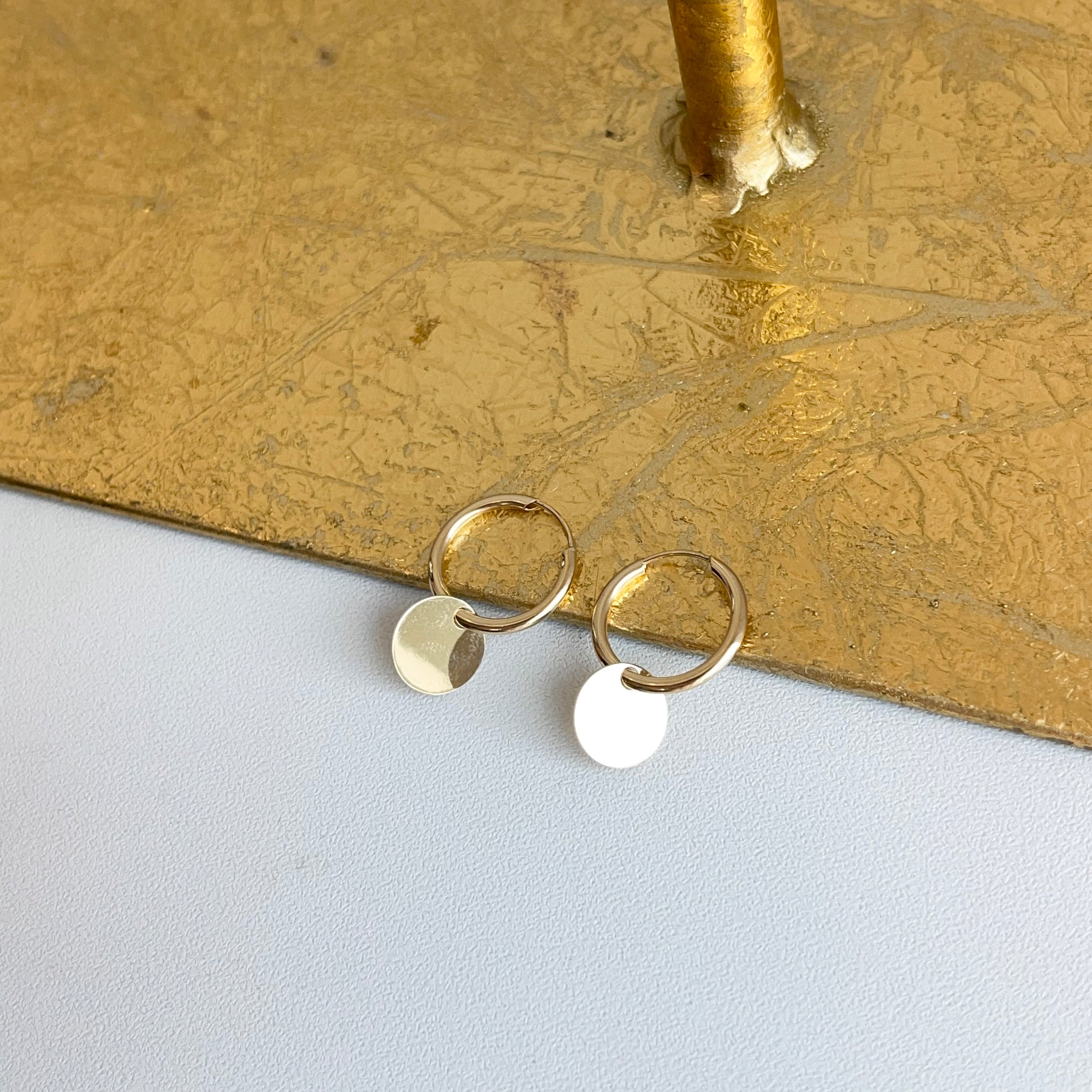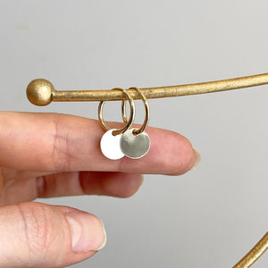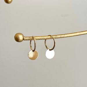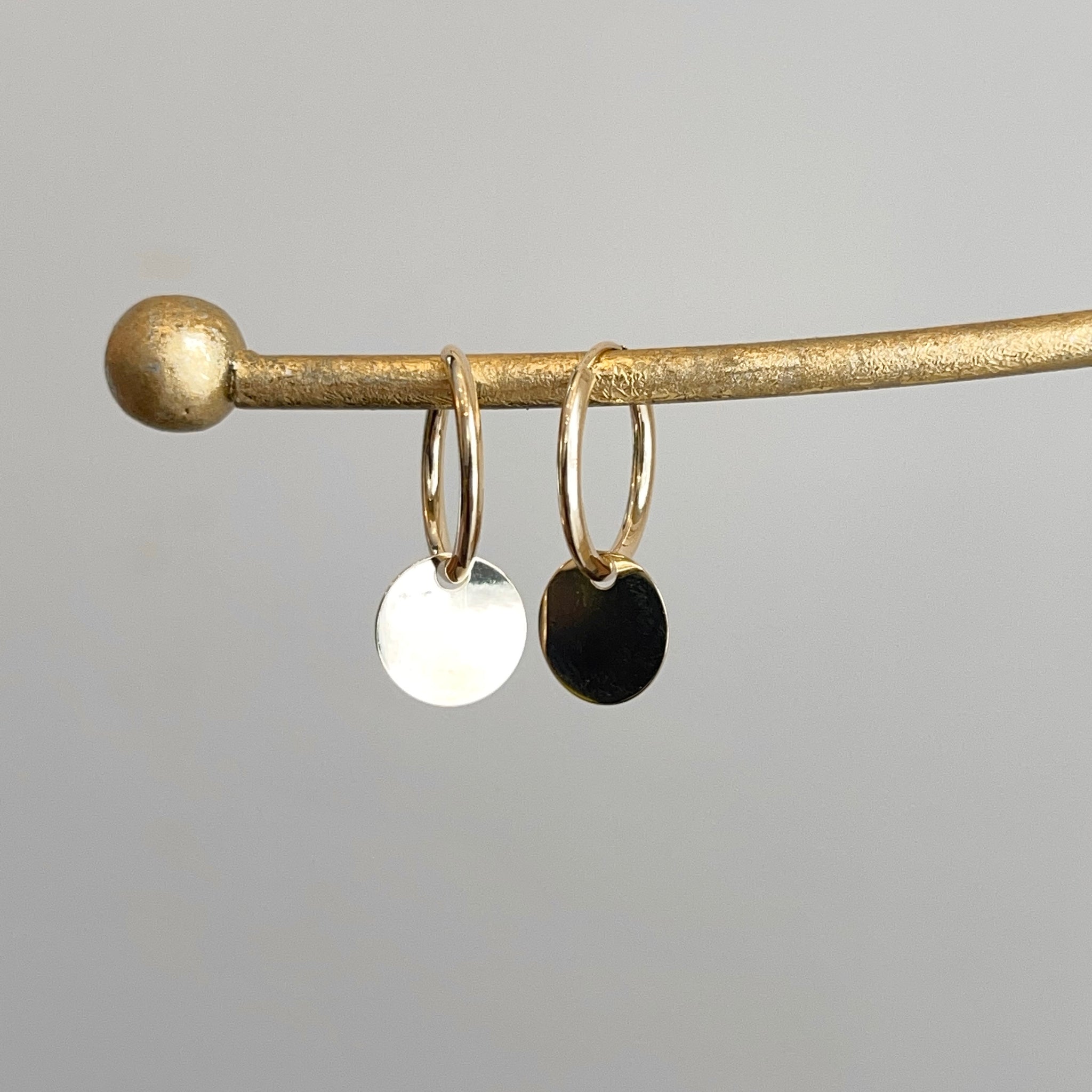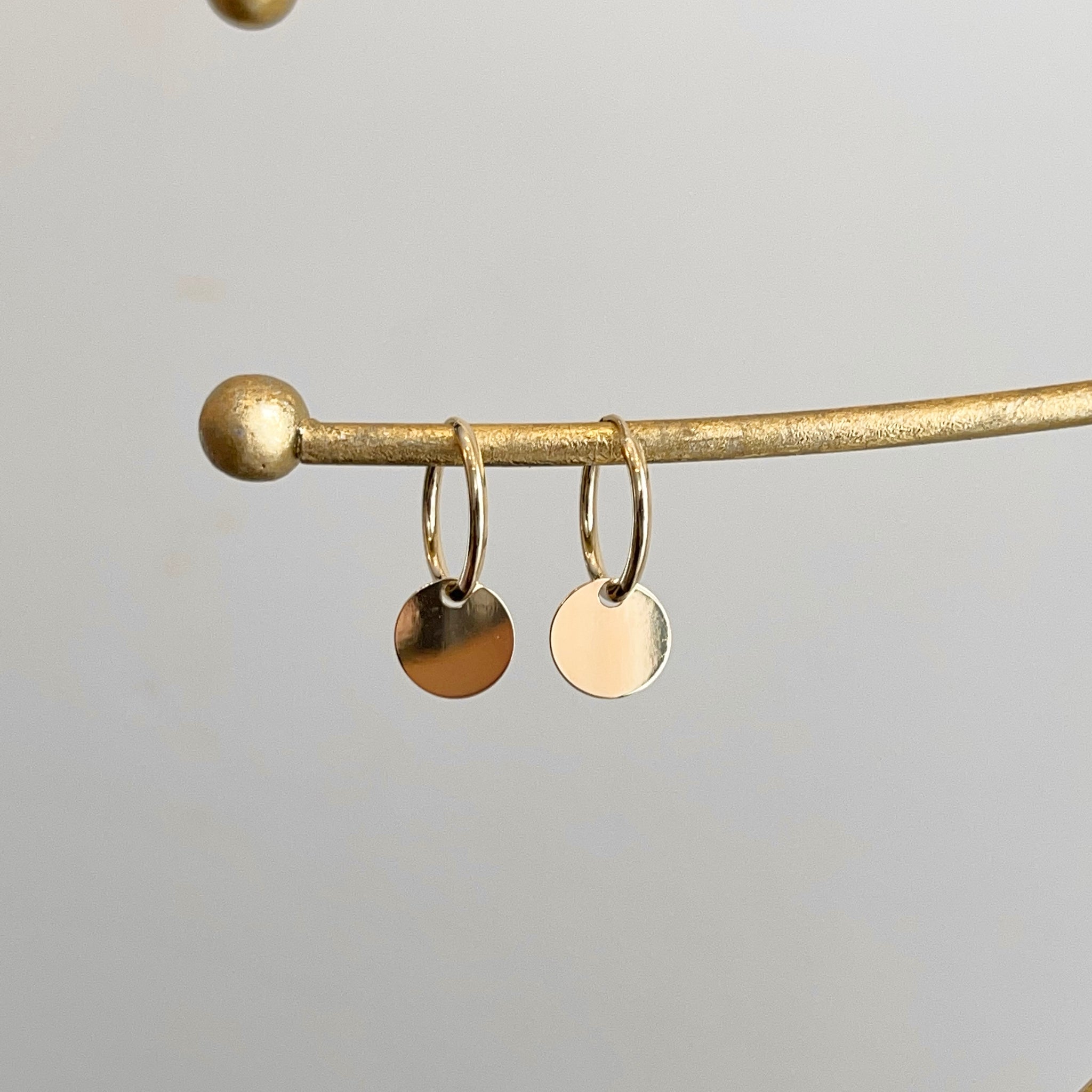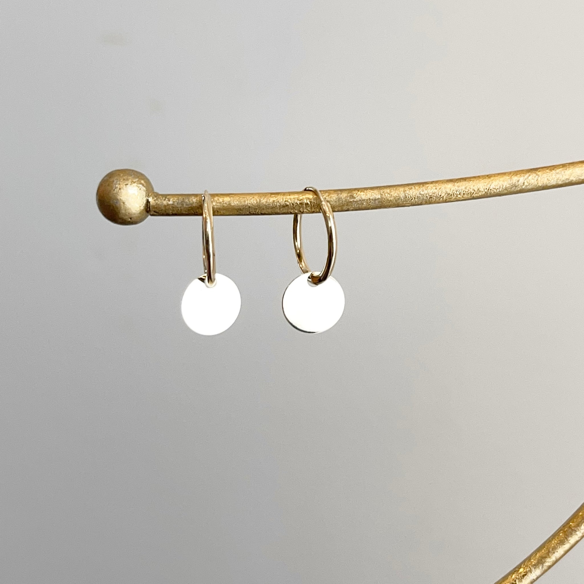 14KT yellow gold endless hoop earrings with circle disc charm. Disc charms slide along the hoop earrings + you can take the charms off and put on other hoops as well!