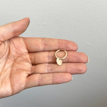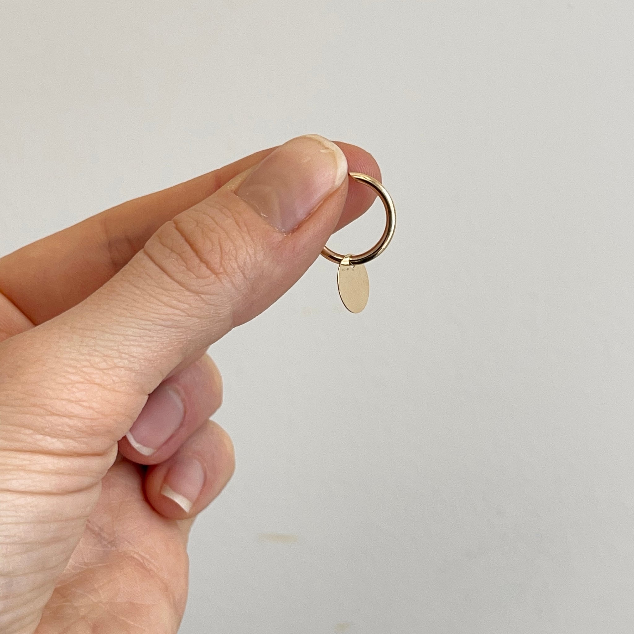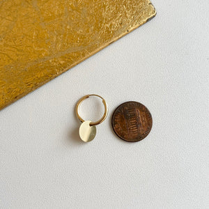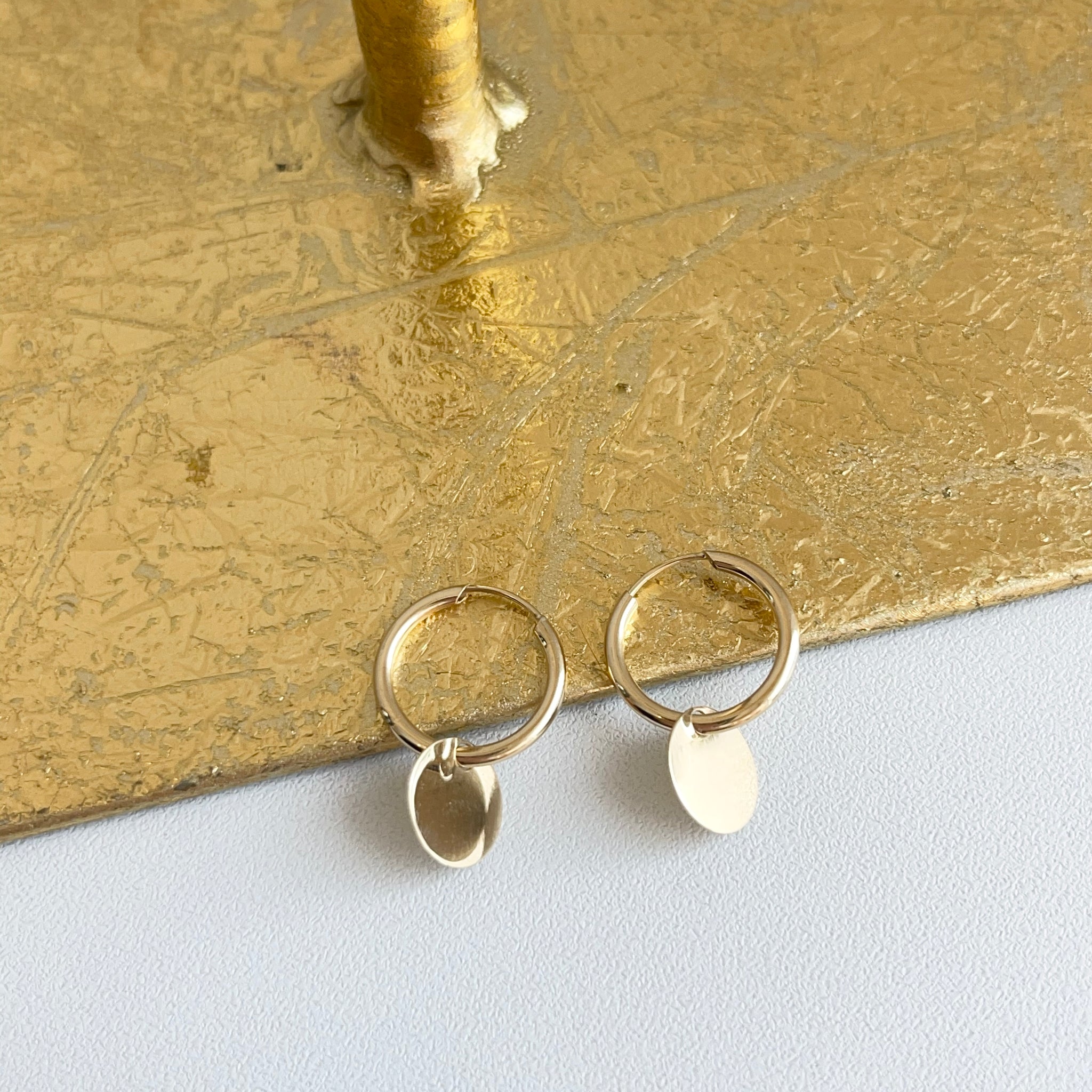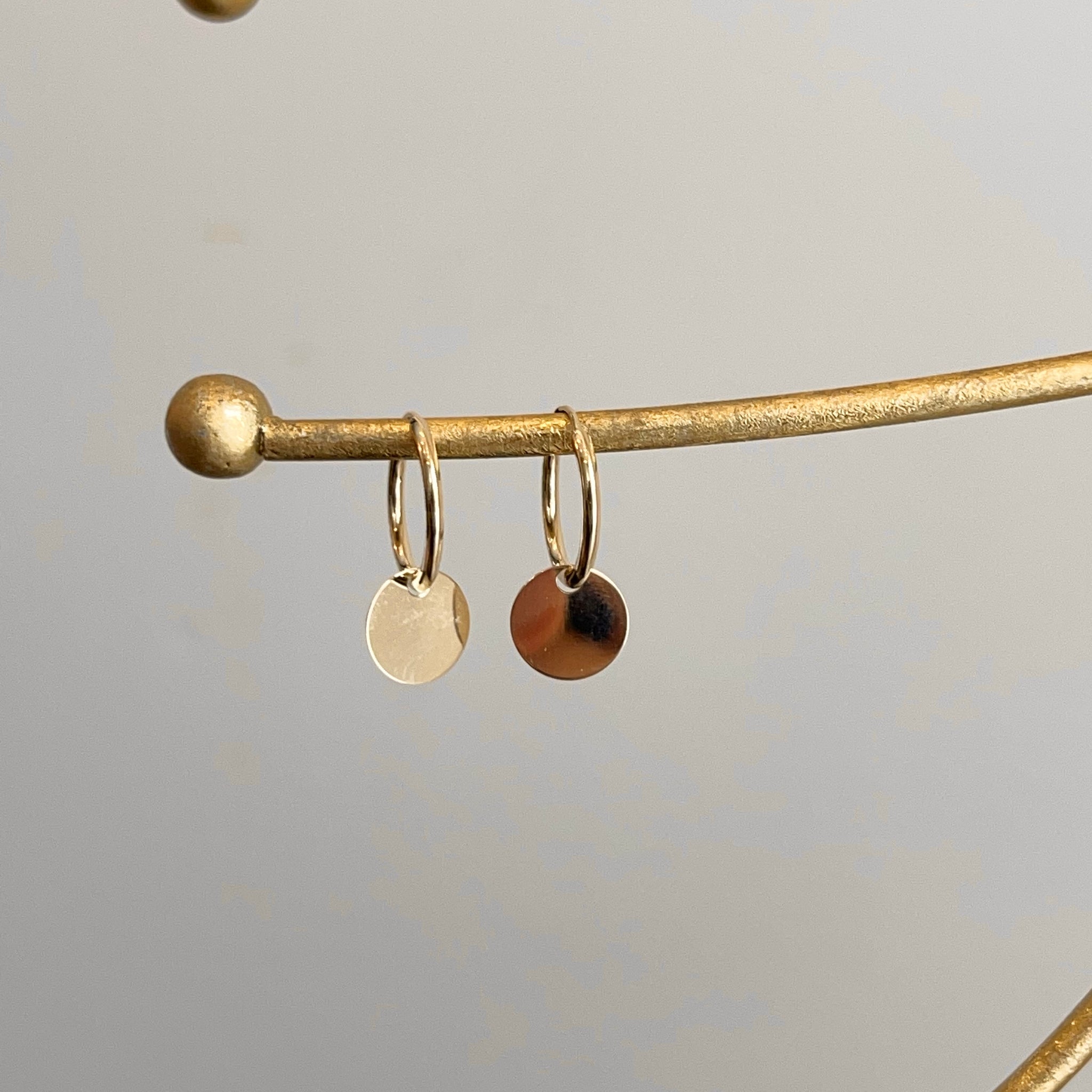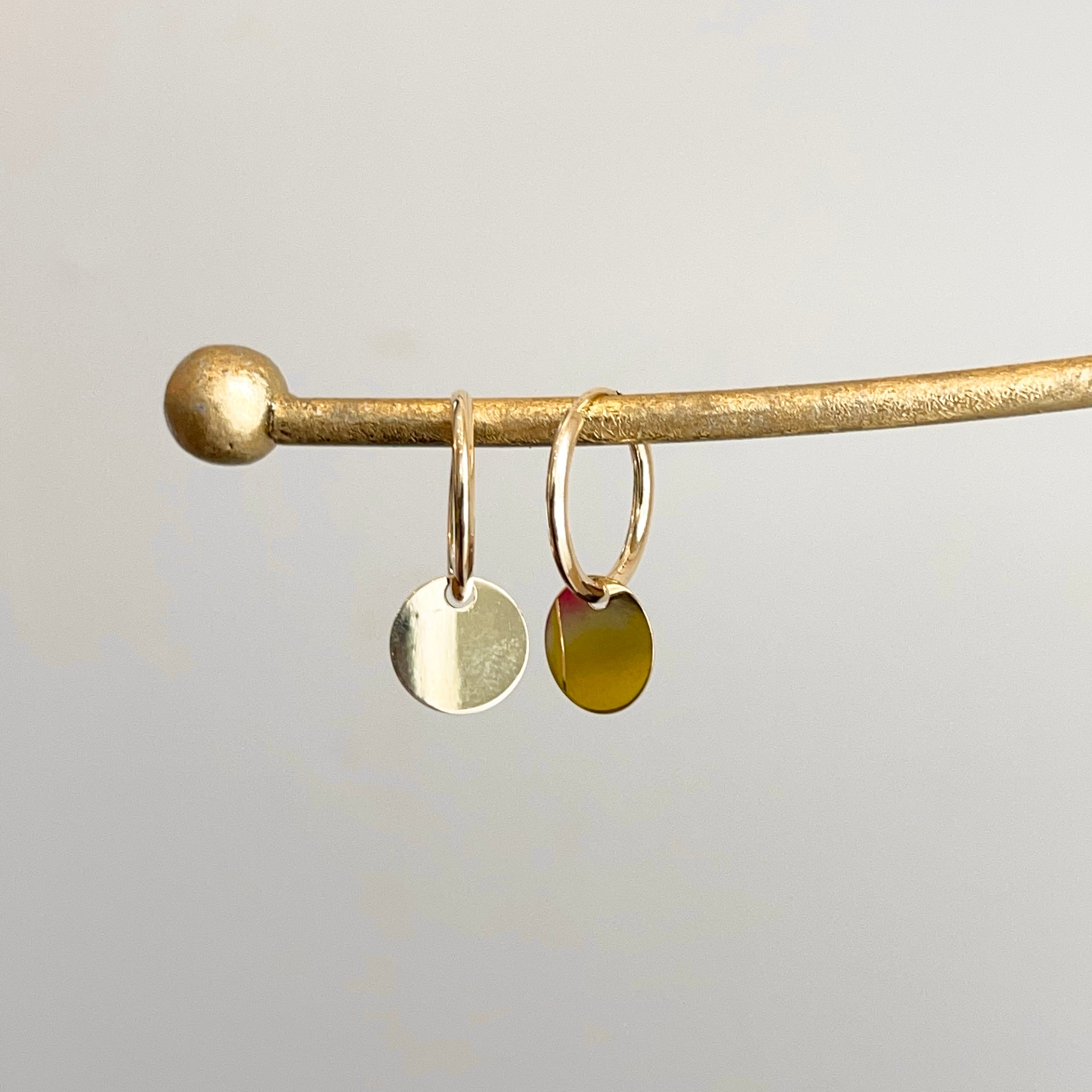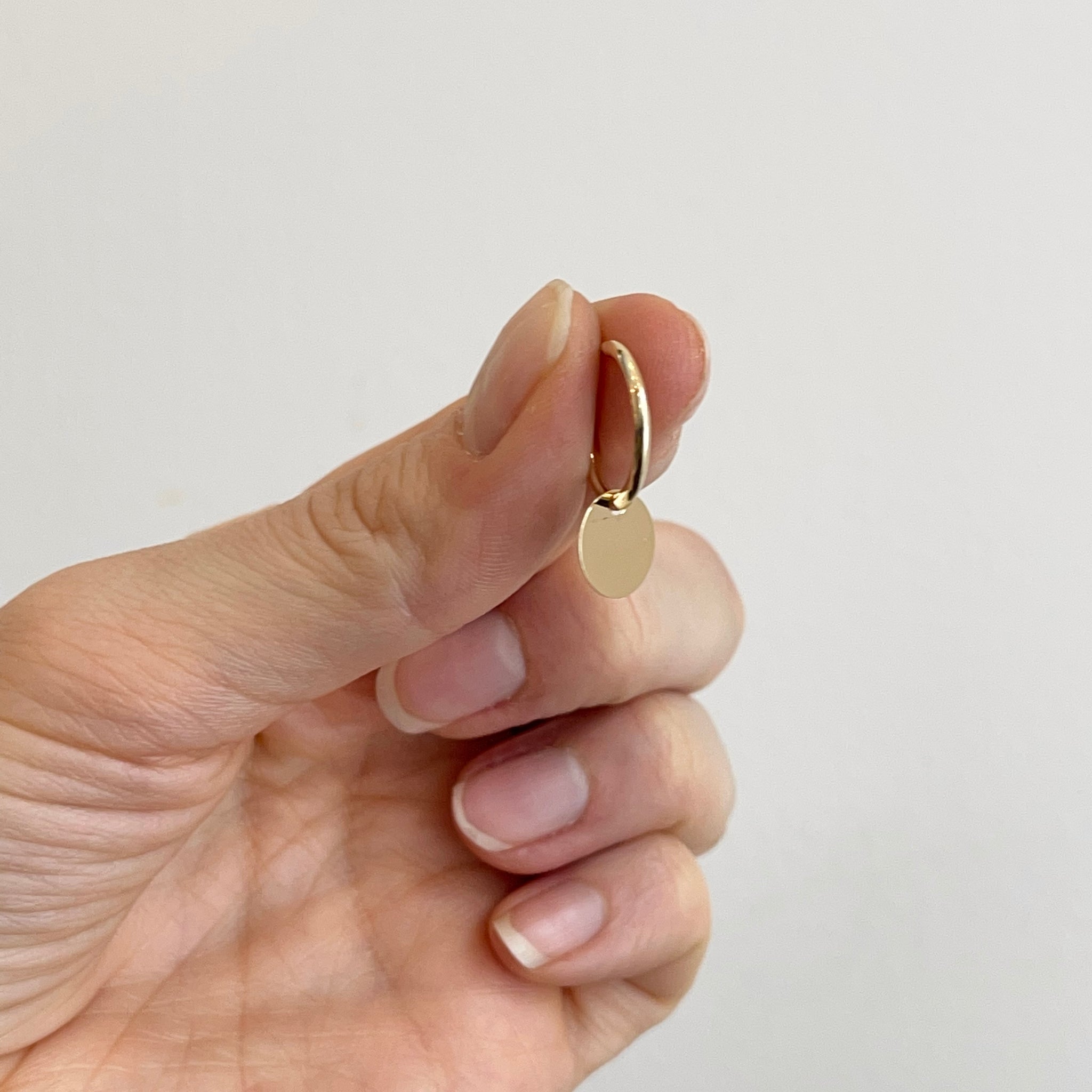14KT yellow gold endless hoop earrings with circle disc charm. Disc charms slide along the hoop earrings + you can take the charms off and put on other hoops as well!