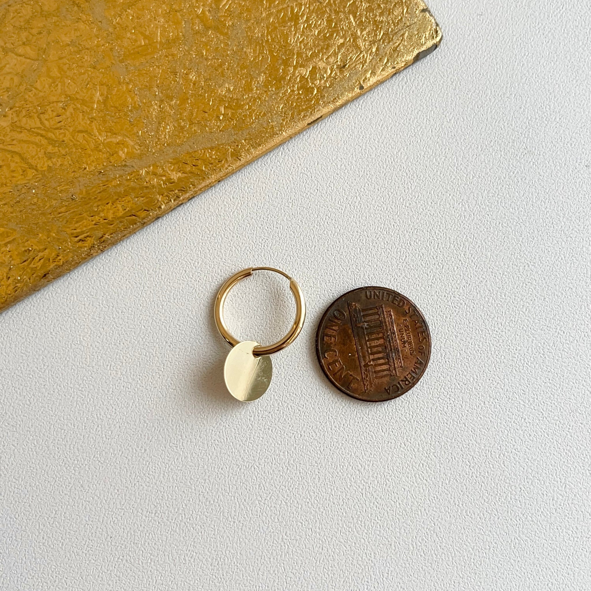14KT Yellow Gold Round Disc Charm Endless Hoop Earrings 15mm