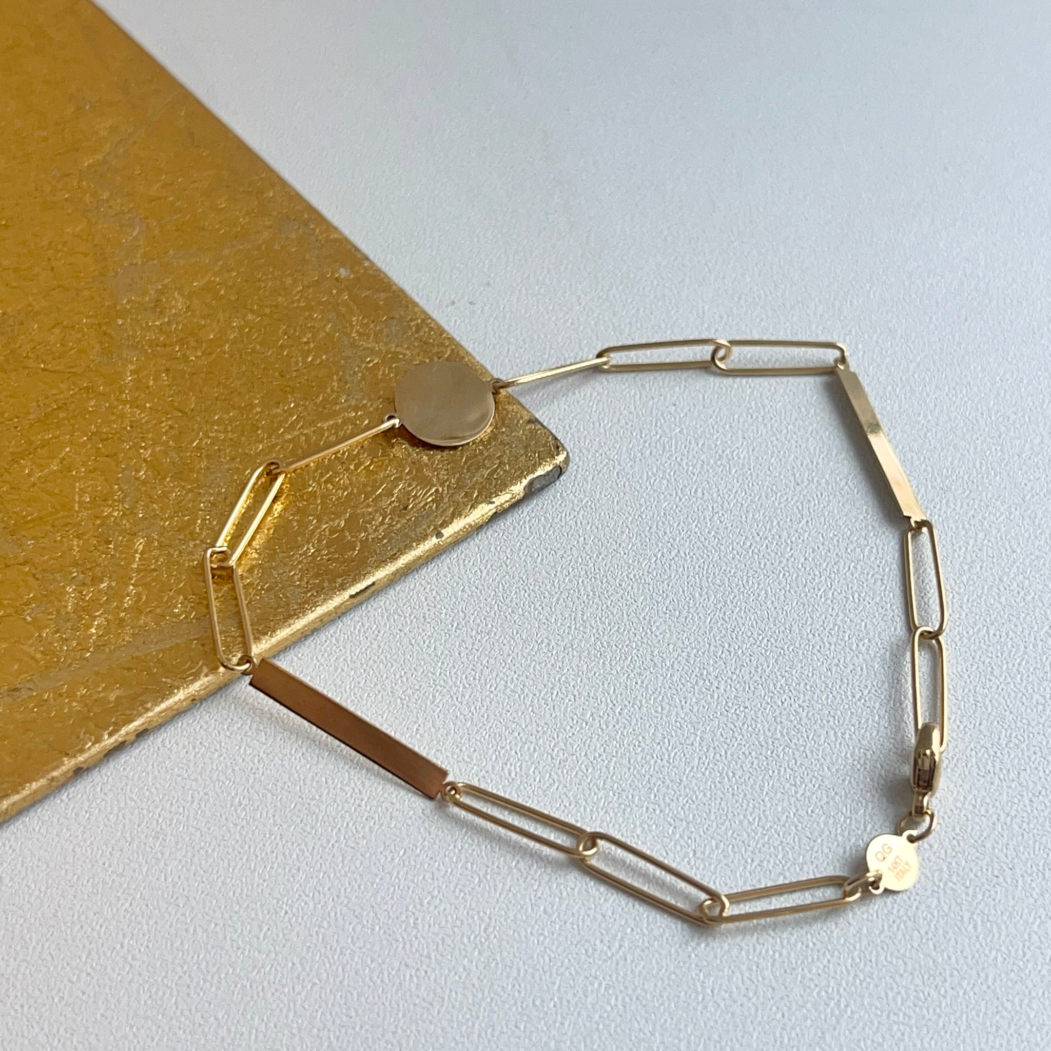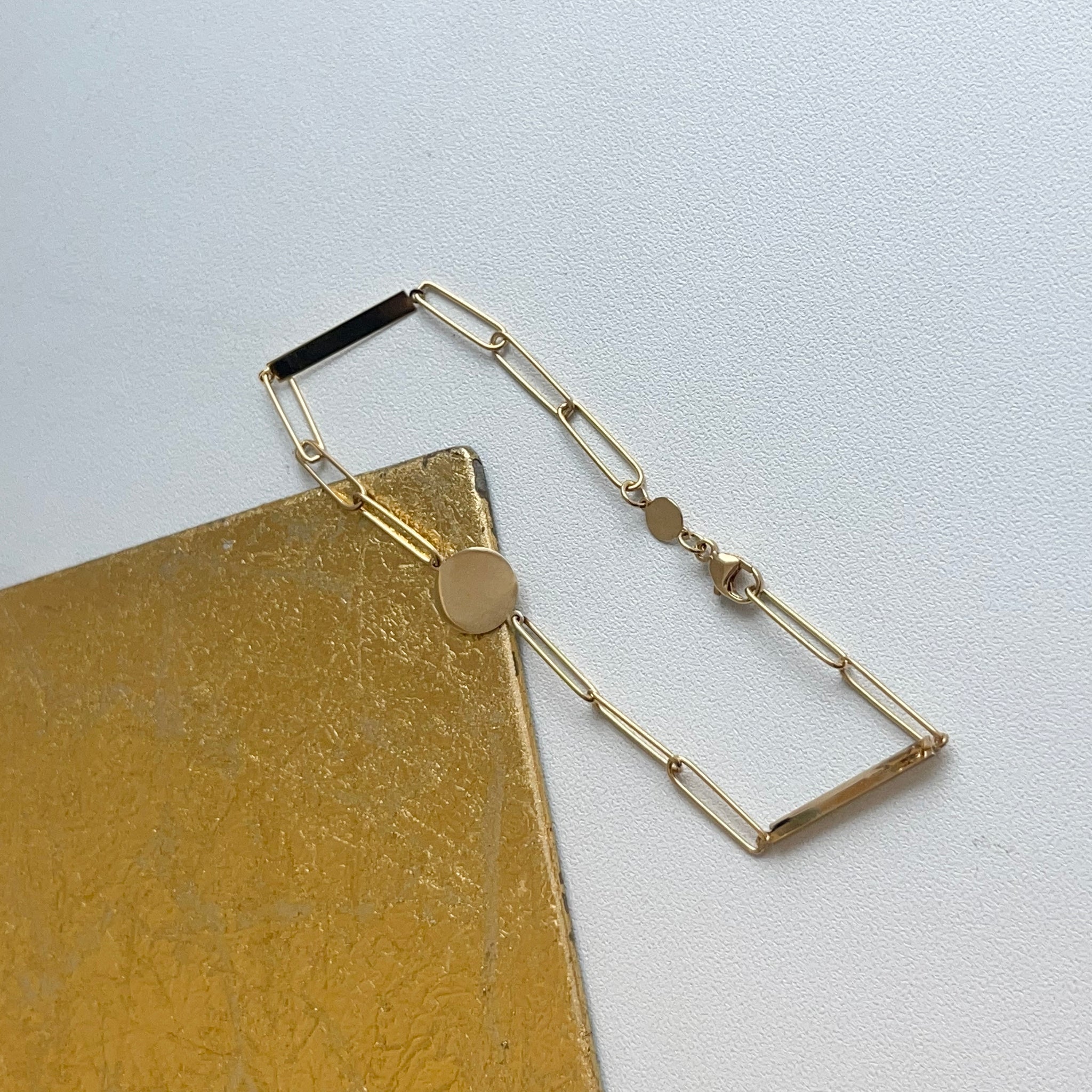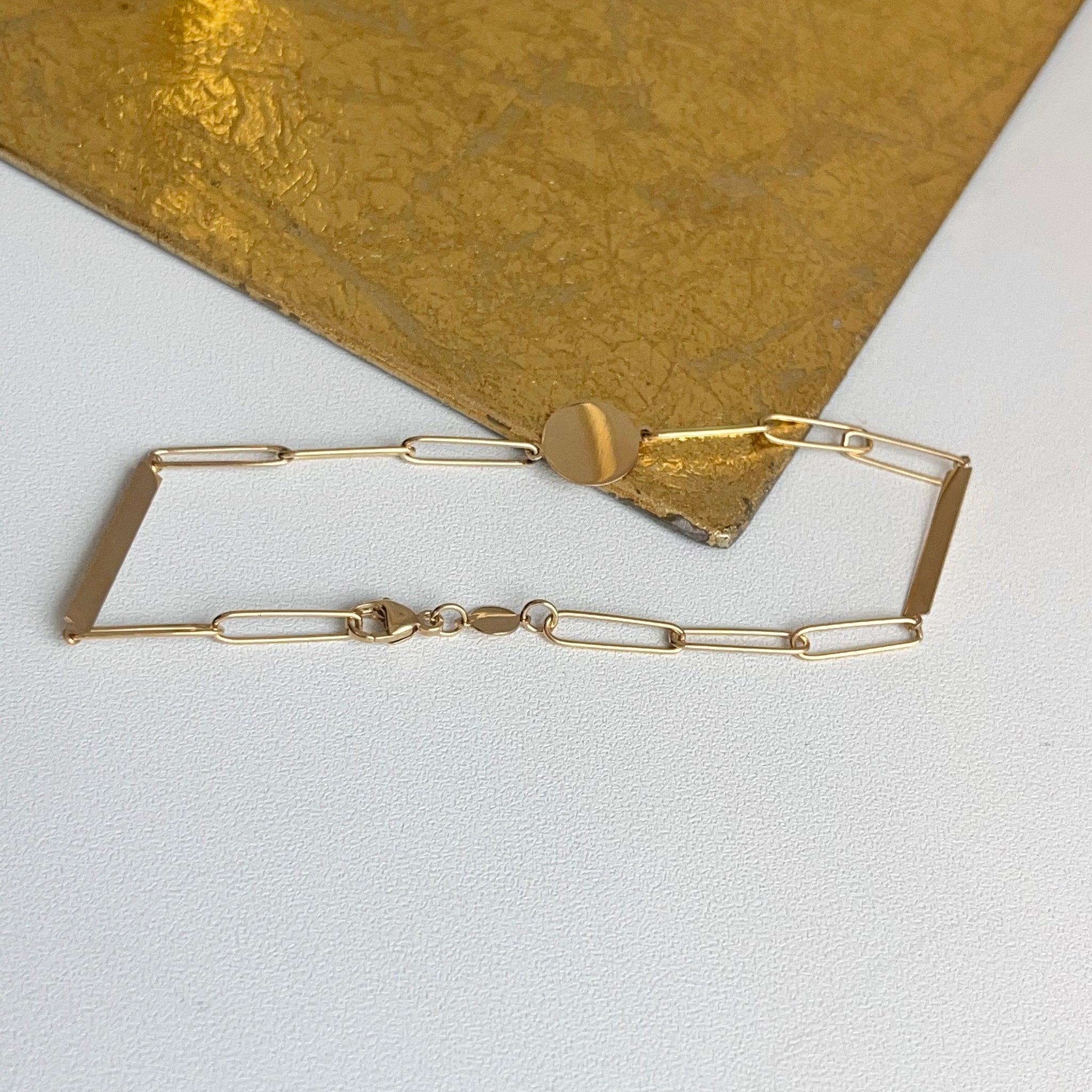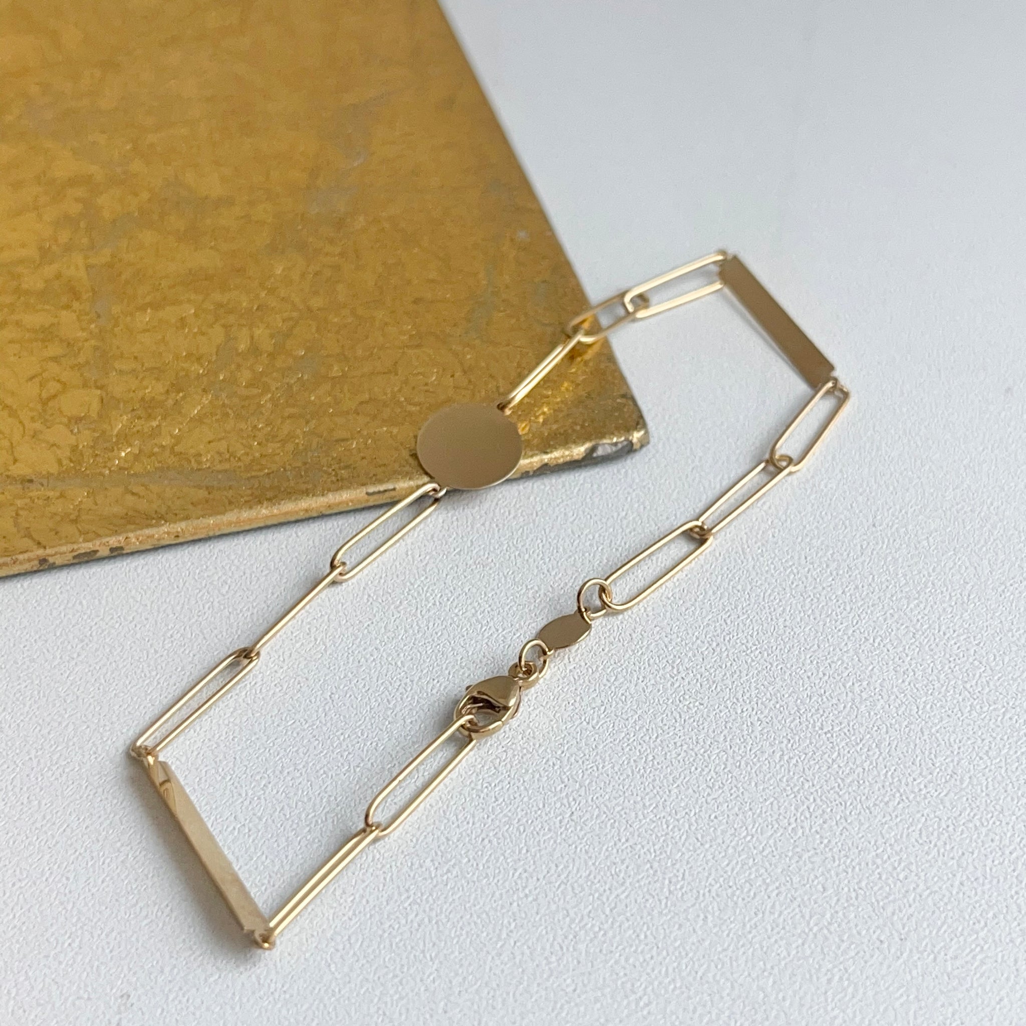 14KT yellow gold flat, round, disc station paper clip chain link Bracelet. Features a round disc in the center of the chain and two, long, rectangular discs on each side.