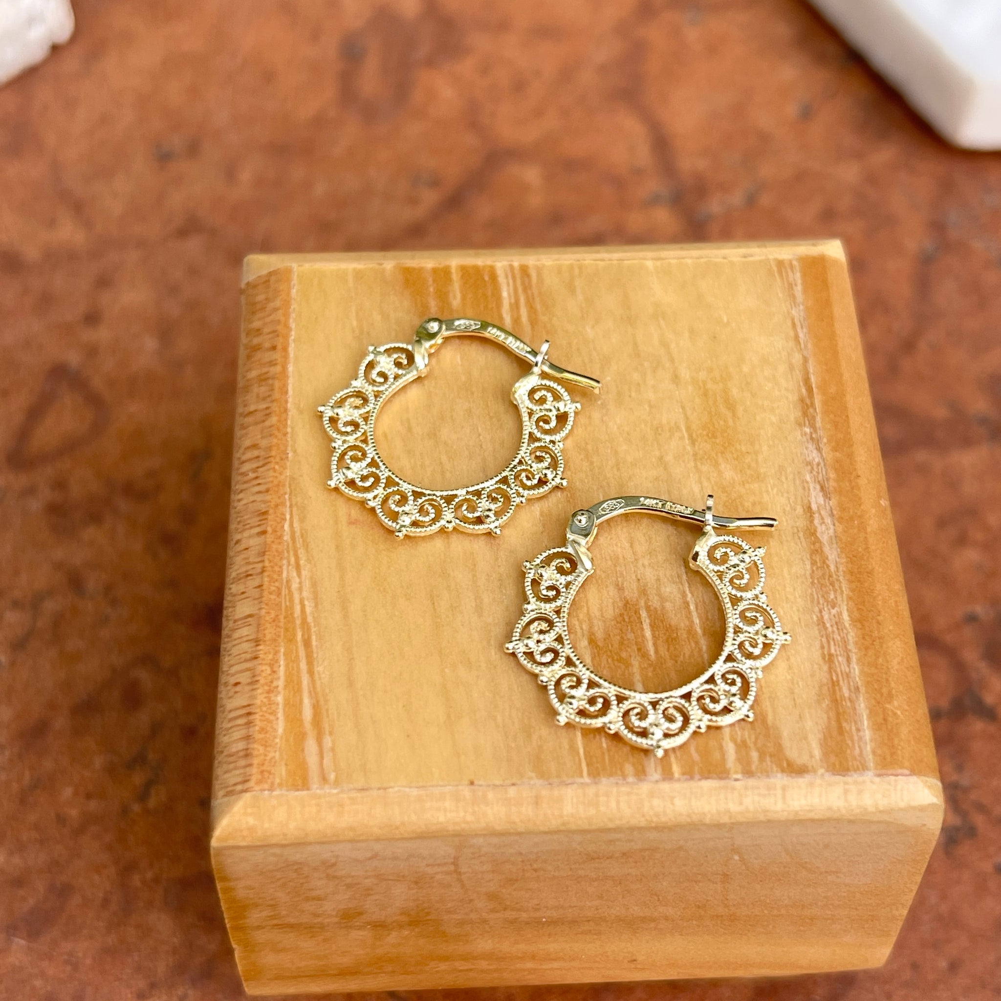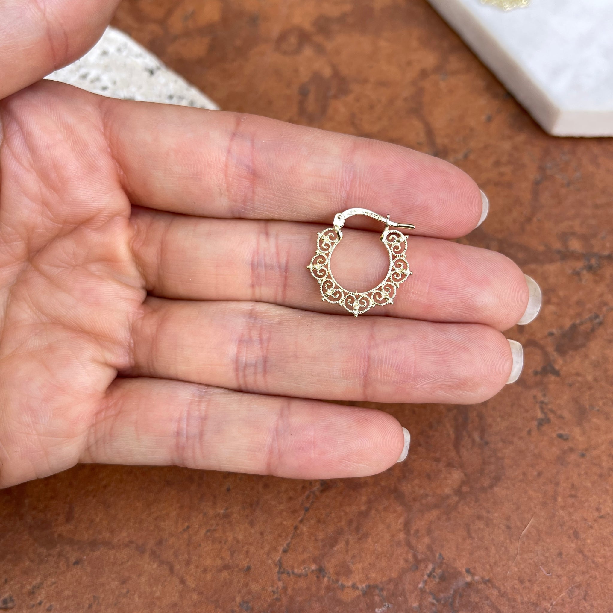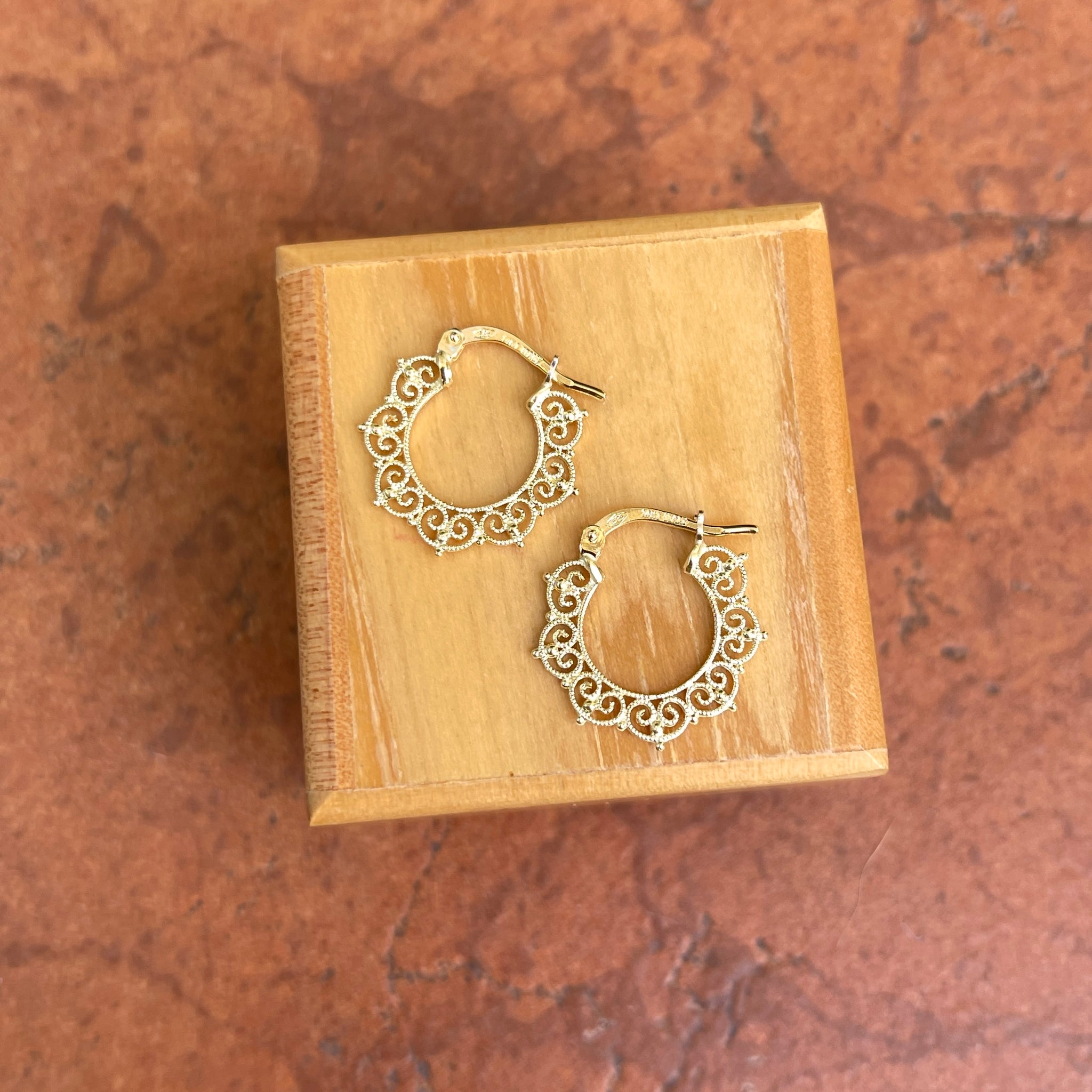 14KT yellow gold open filigree design hoop earrings. Small size hoops + dainty in detail!
