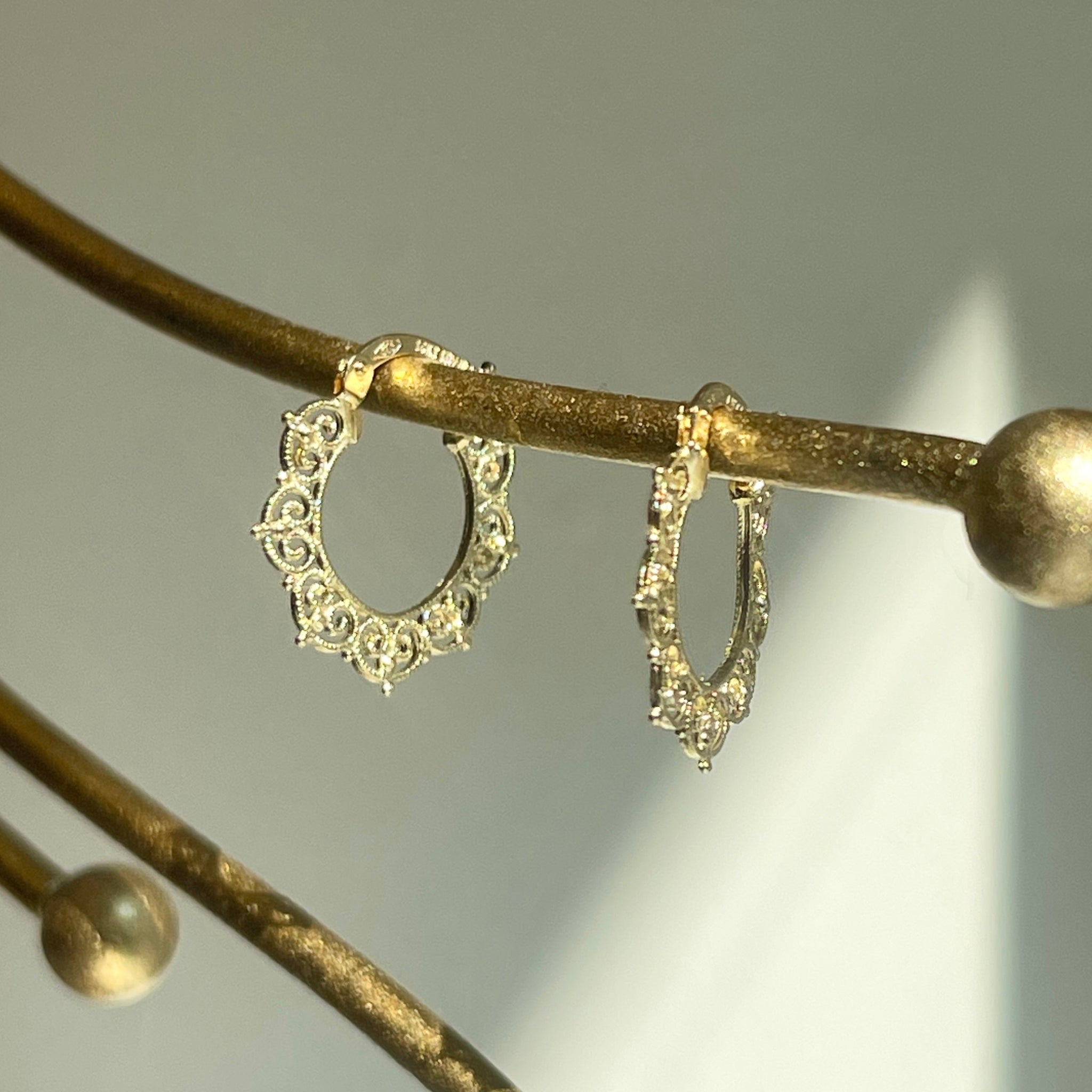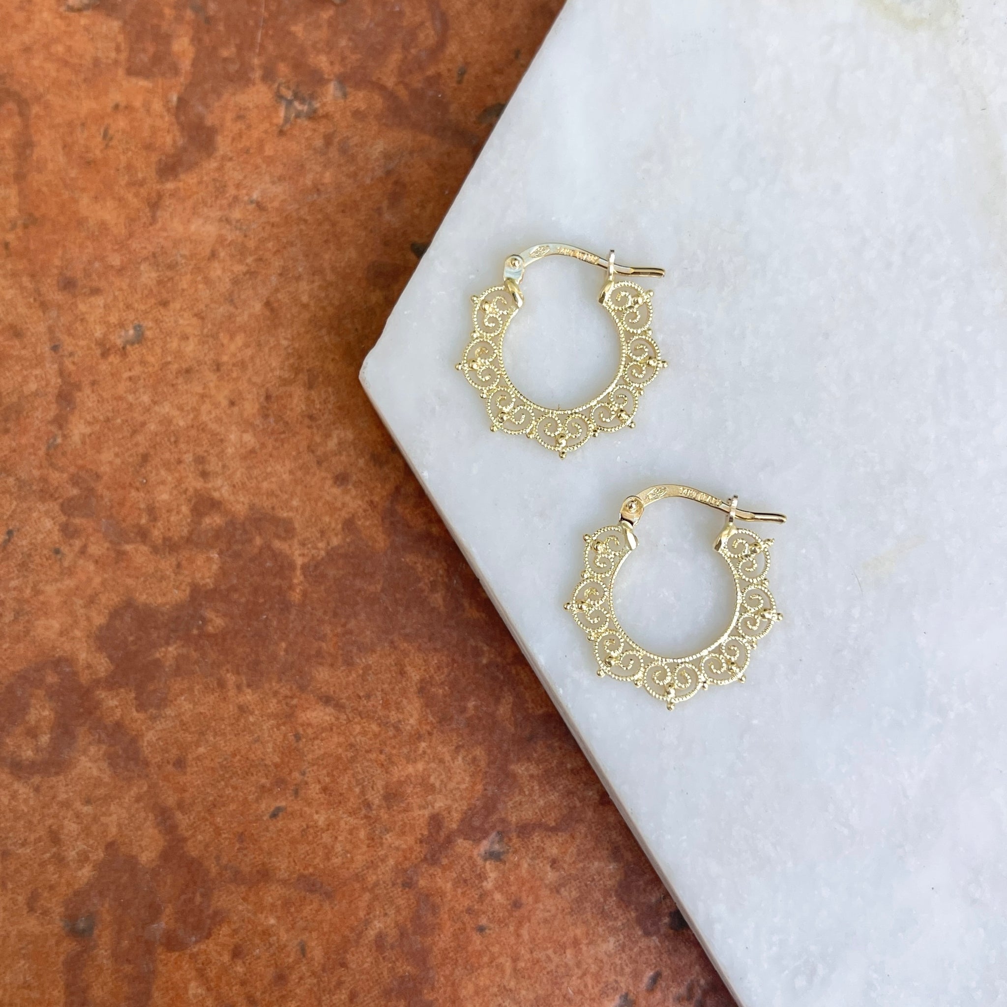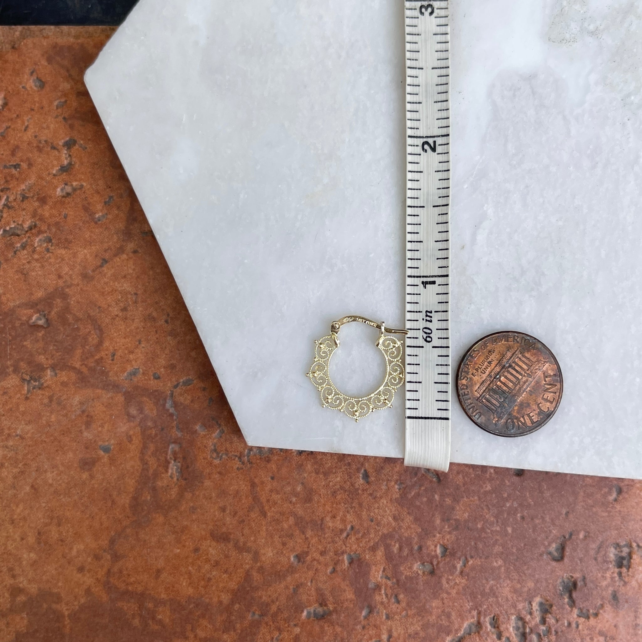 14KT yellow gold open filigree design hoop earrings. Small size hoops + dainty in detail!