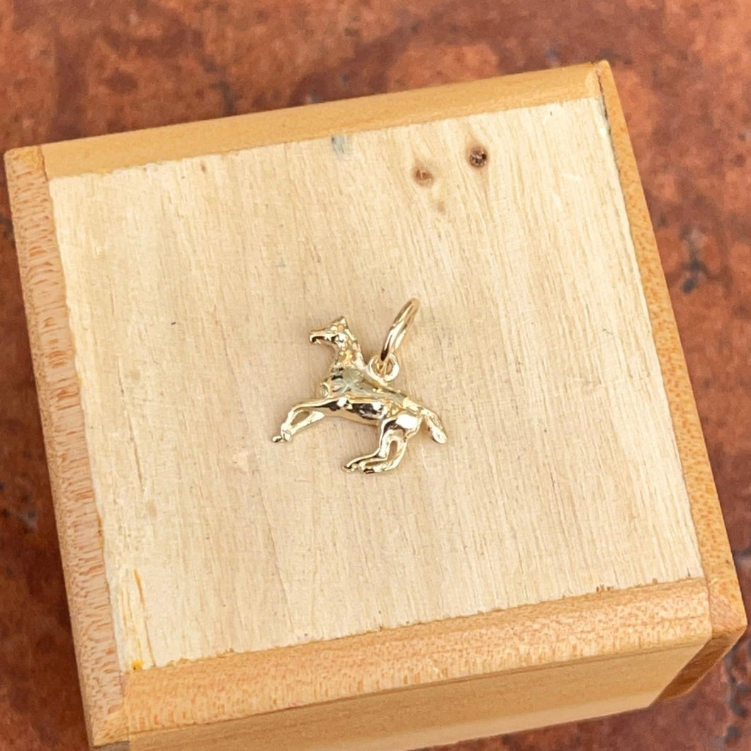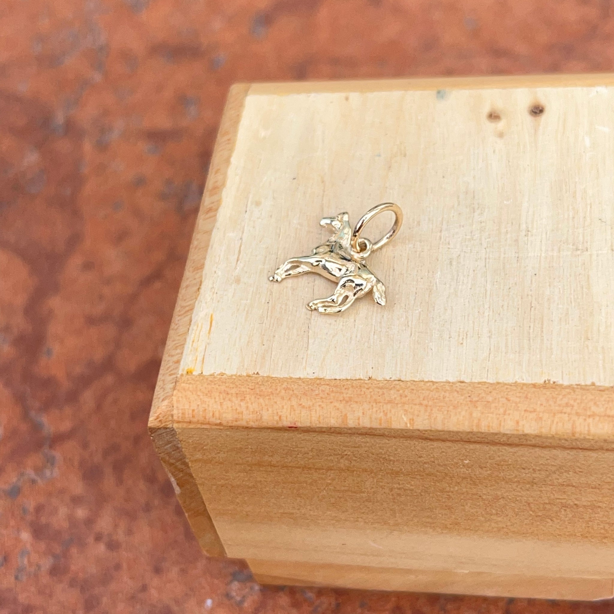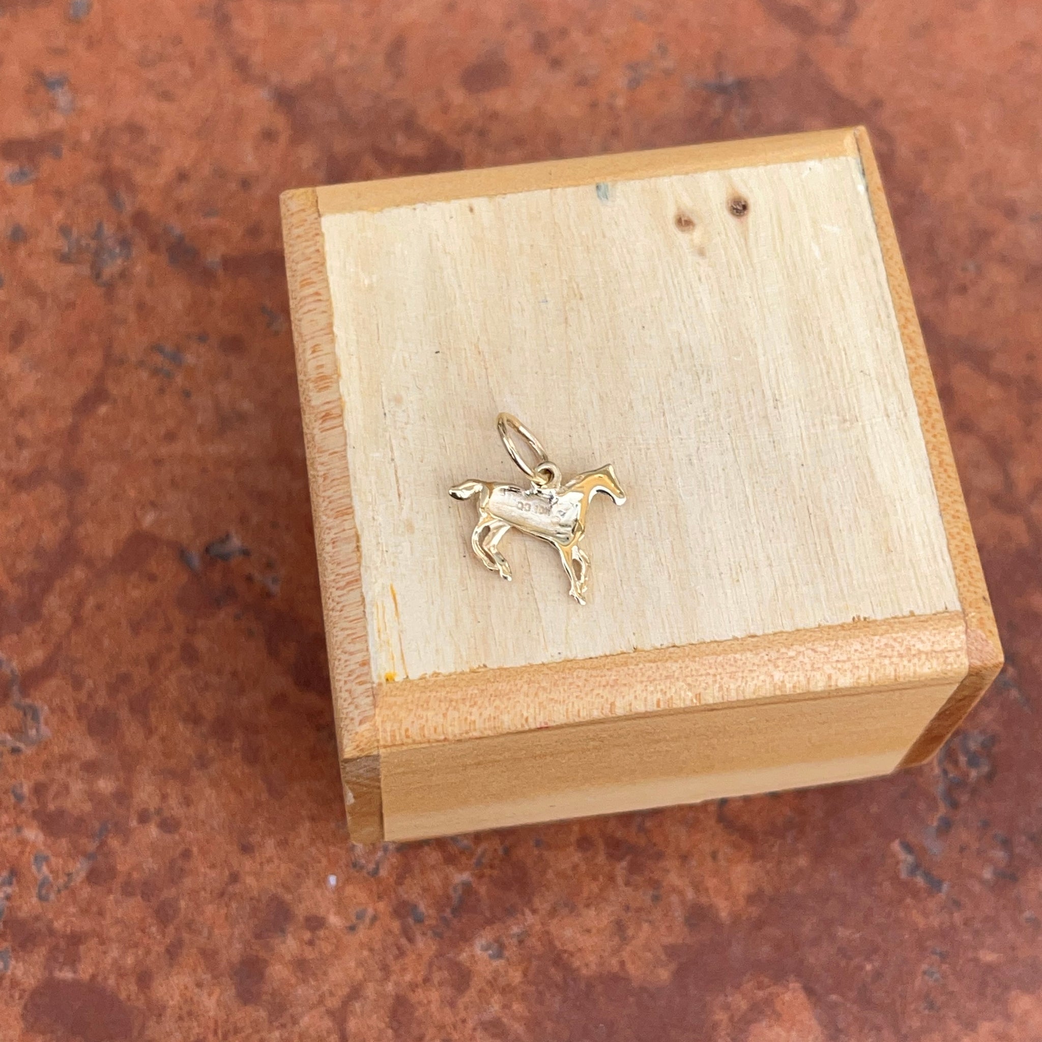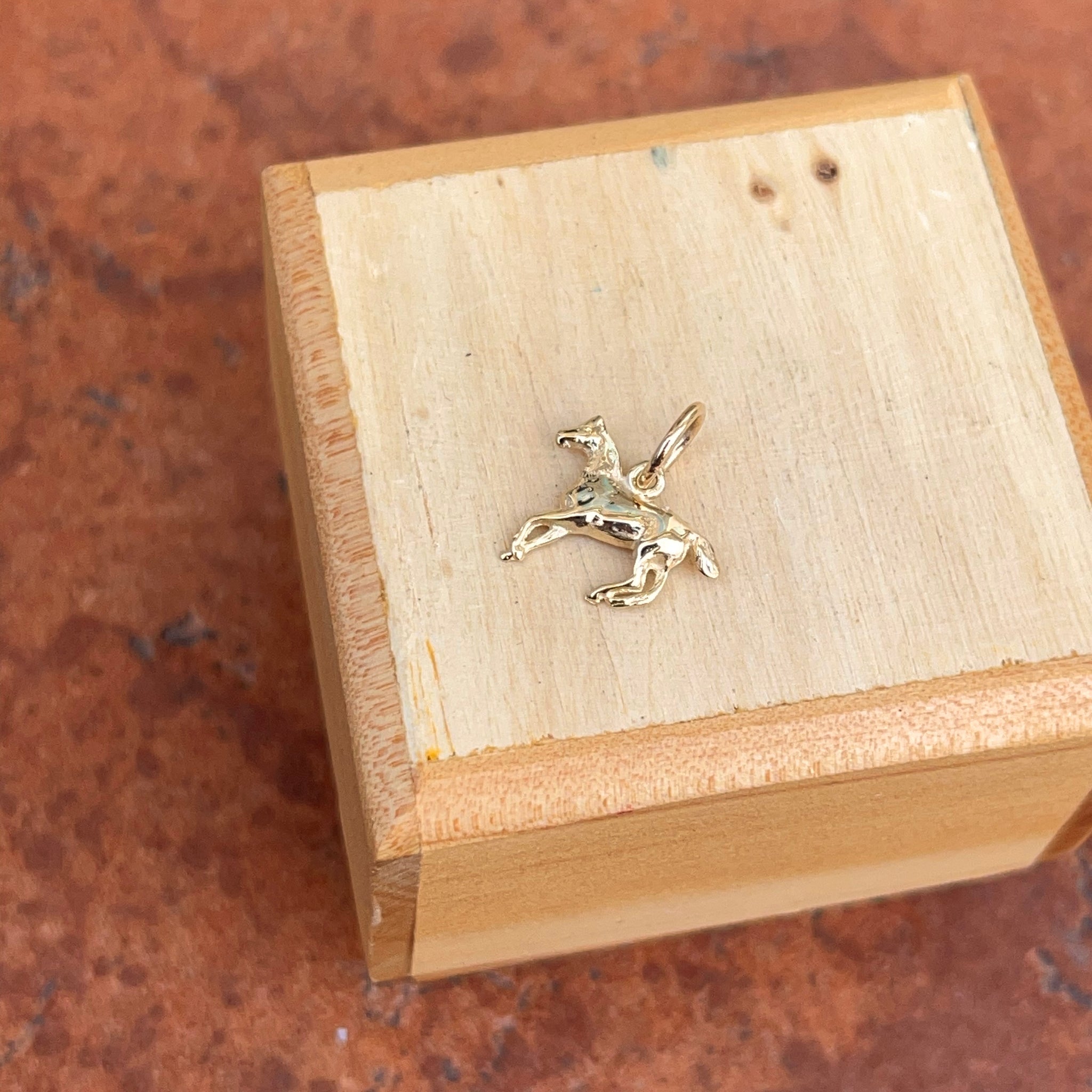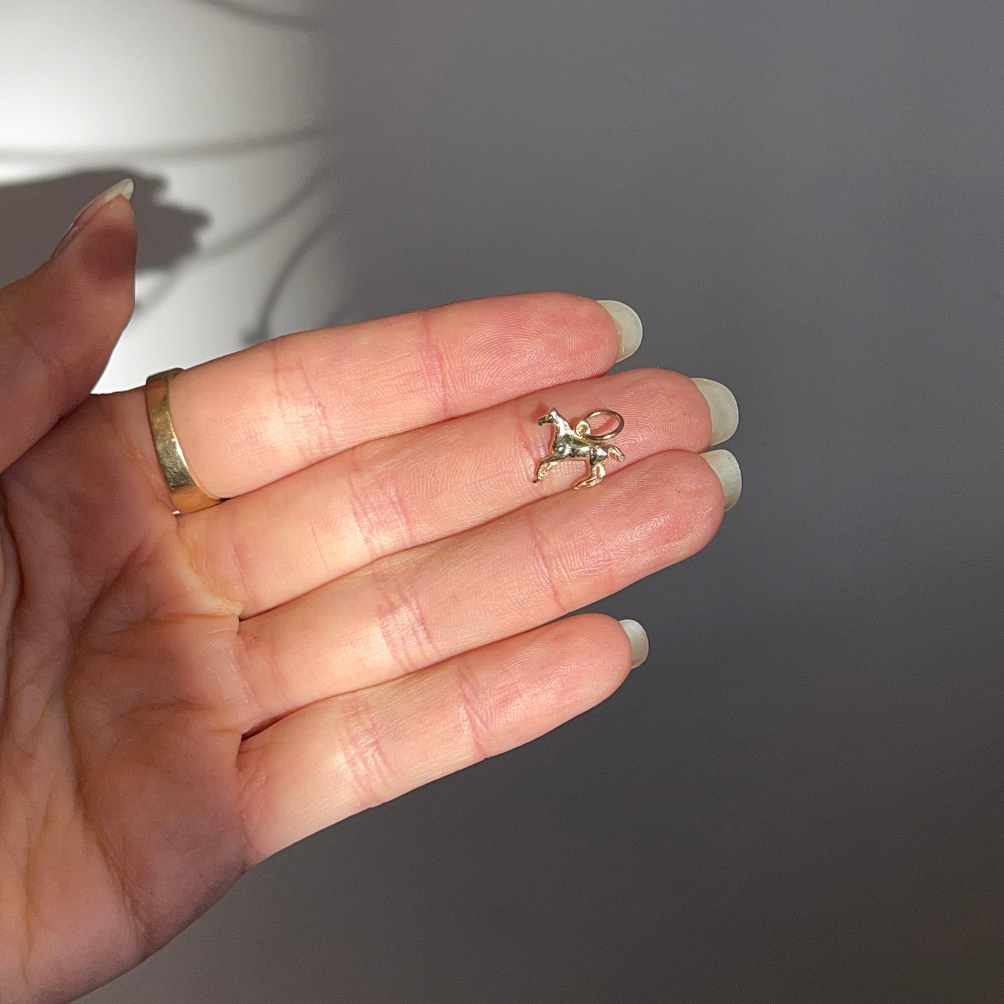 14KT yellow gold running horse mini pendant charm. Perfect accessory for the horse lover! Slide this onto a thin gold chain or charm bracelet!