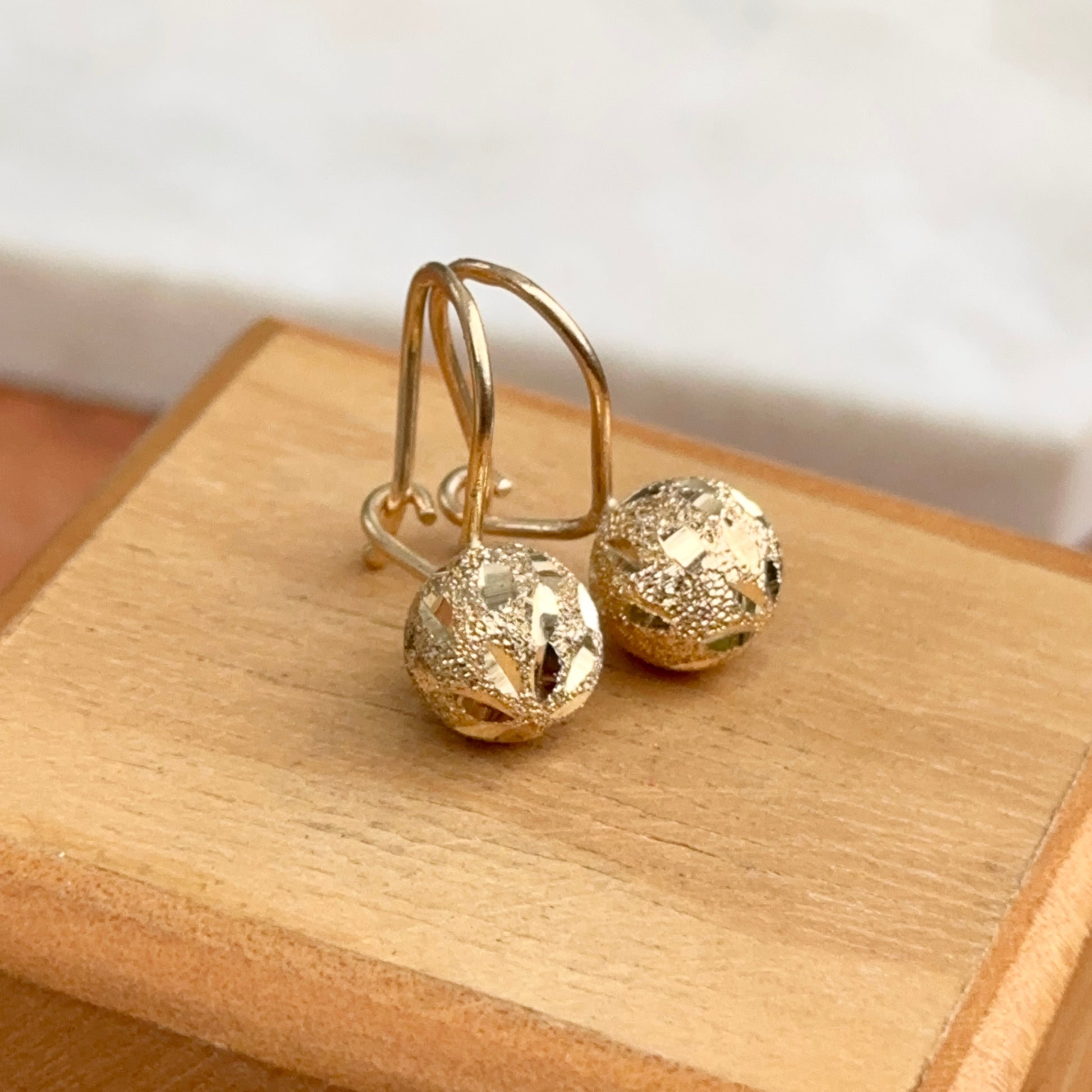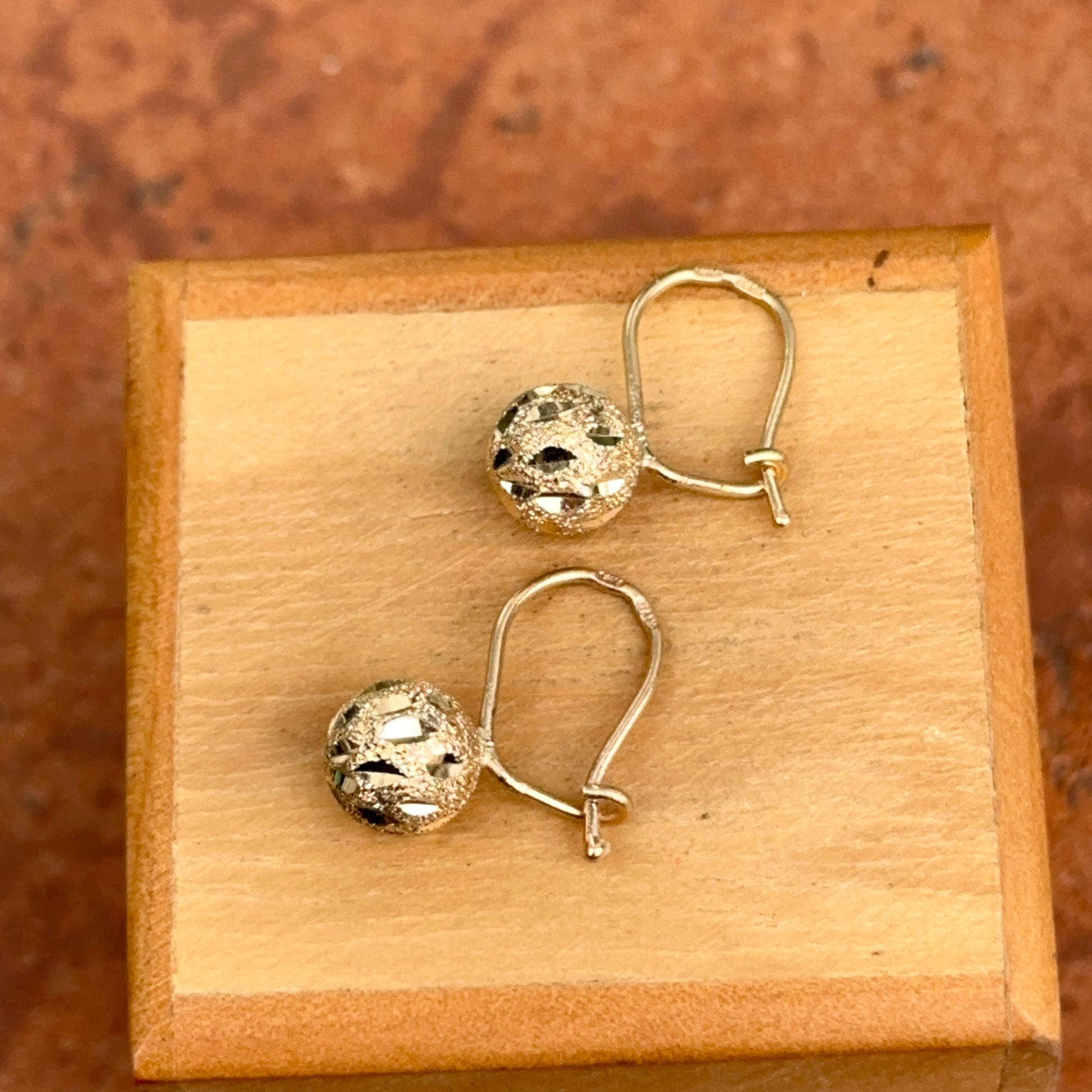 14KT Yellow Gold Satin Diamond-Cut 8mm Ball Dangle Wire Earrings