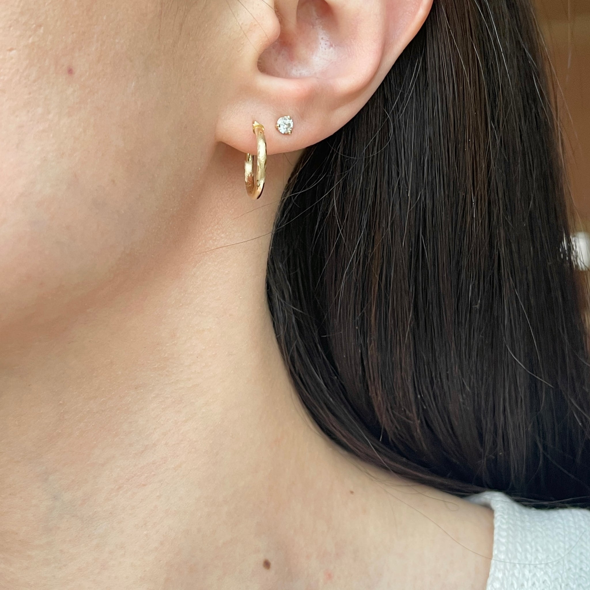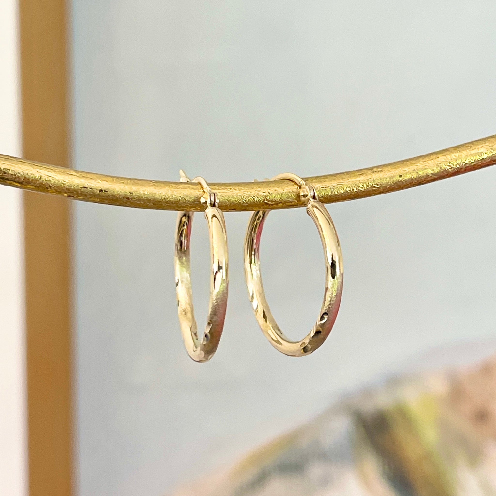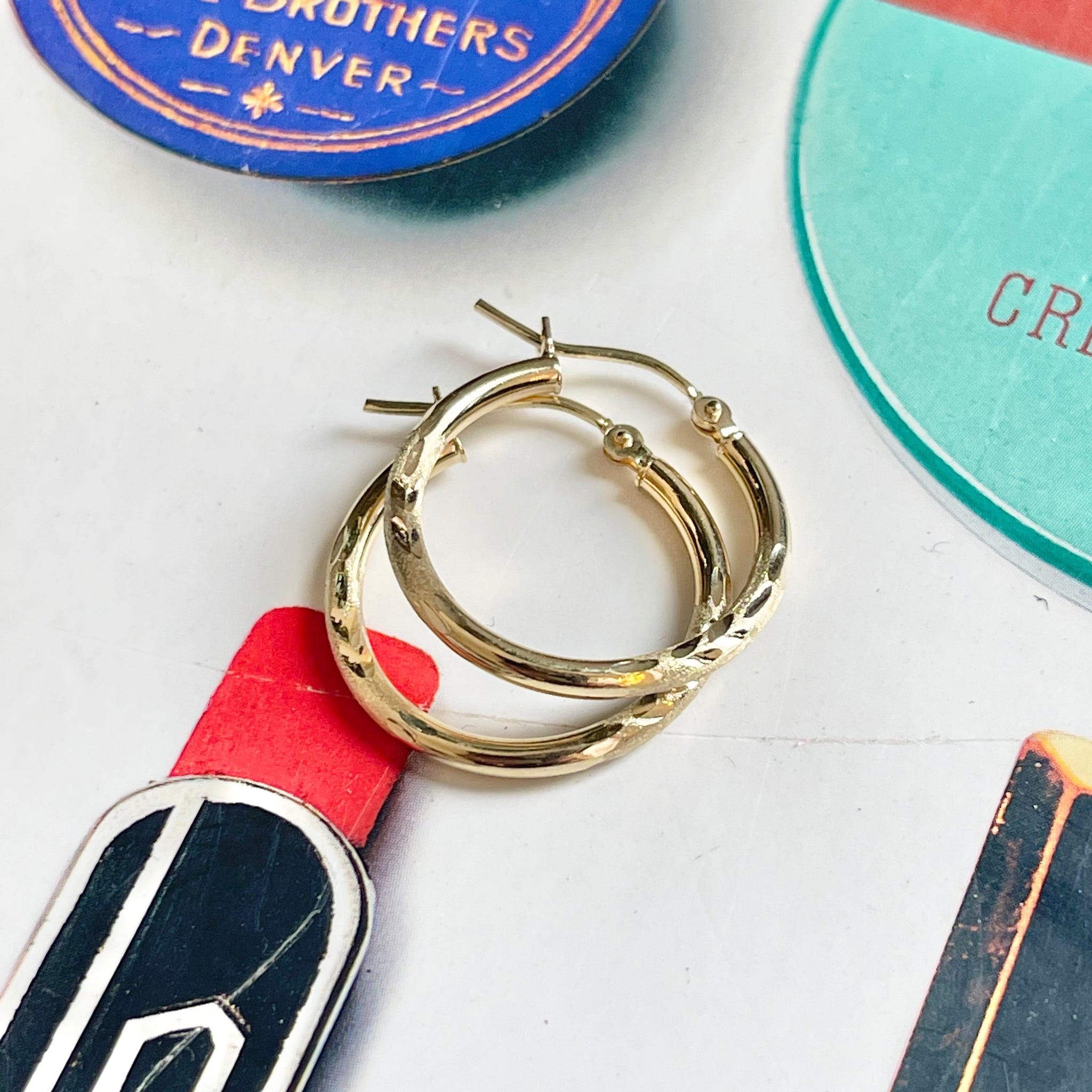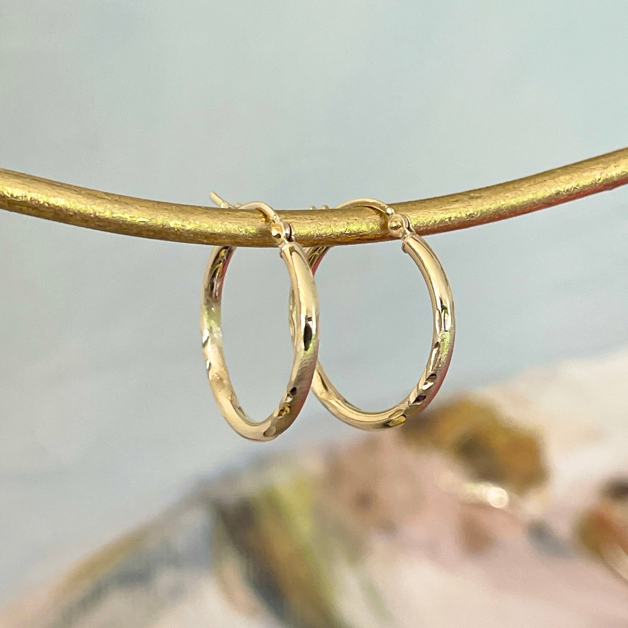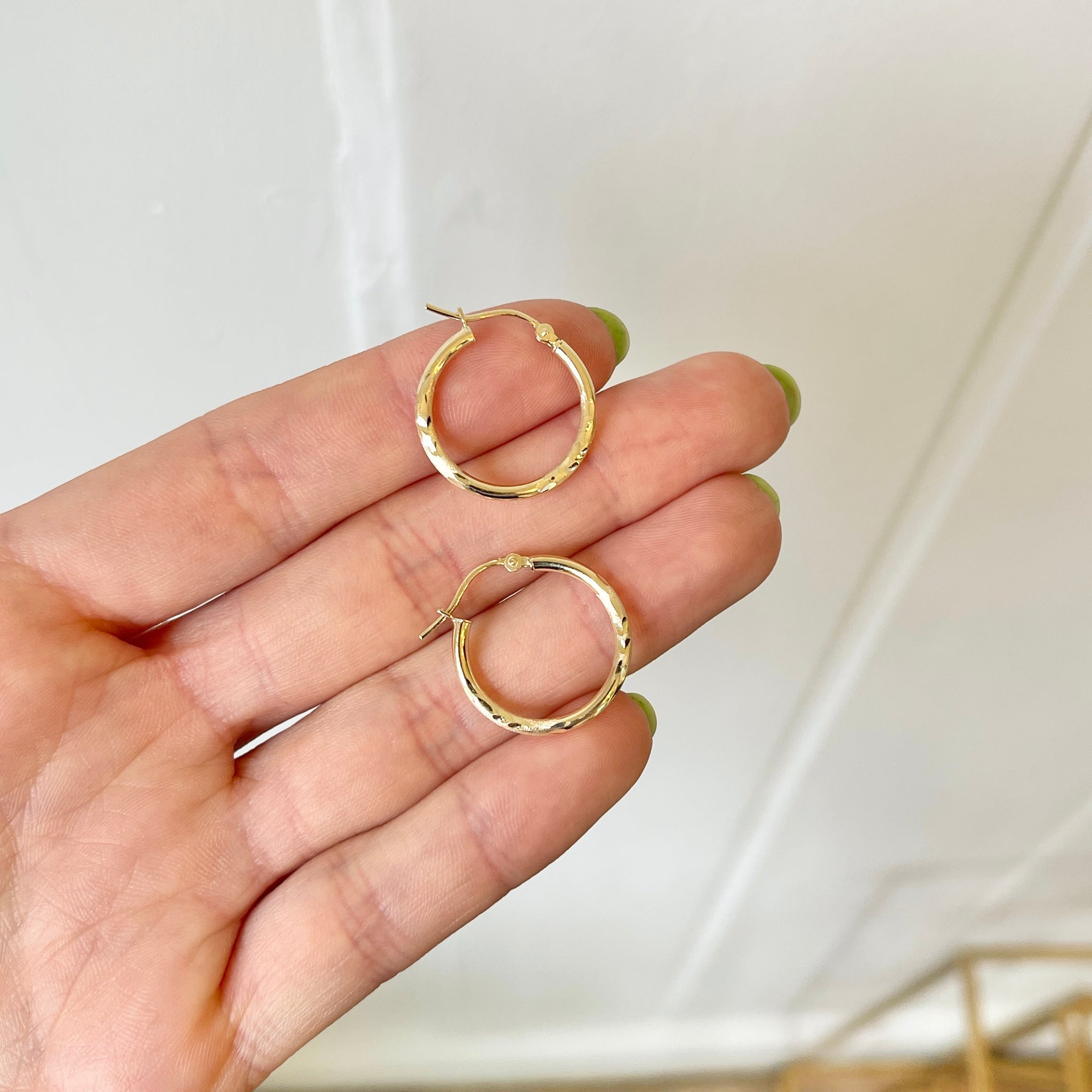 14KT yellow gold diamond-cut + satin hoop earrings. Smaller size hoop earrings that feature both polished + matte finishes for added interest.