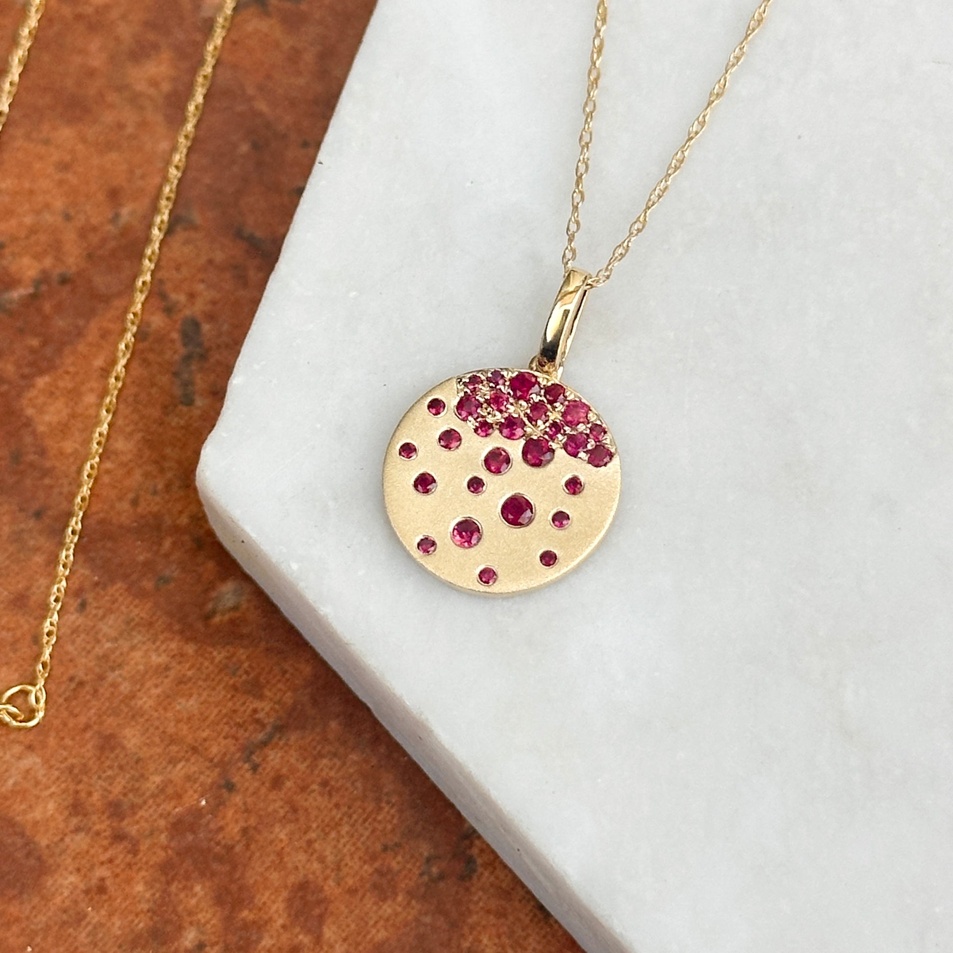 14KT Yellow Gold Matte Satin Disc with Round Red Rubied Gemstones Gypsy Set Burnished Pendant Necklace-18”