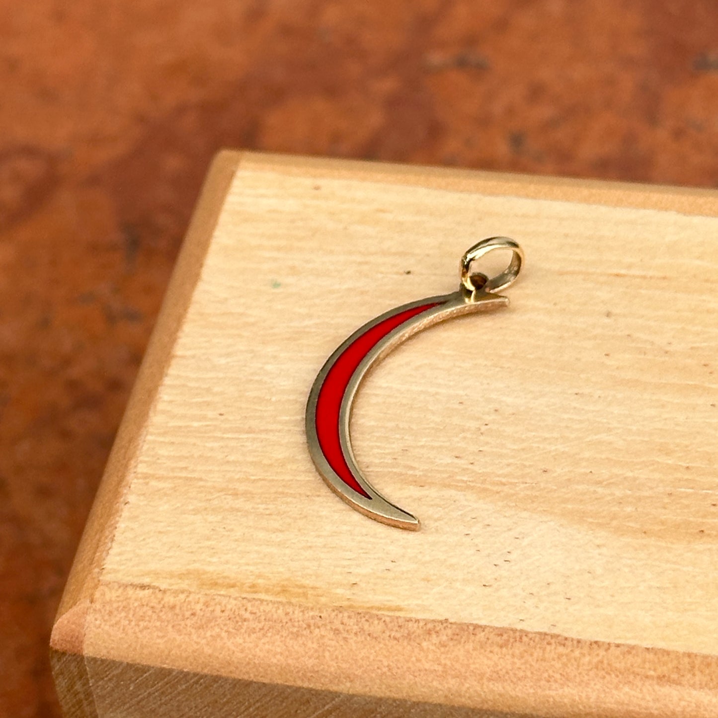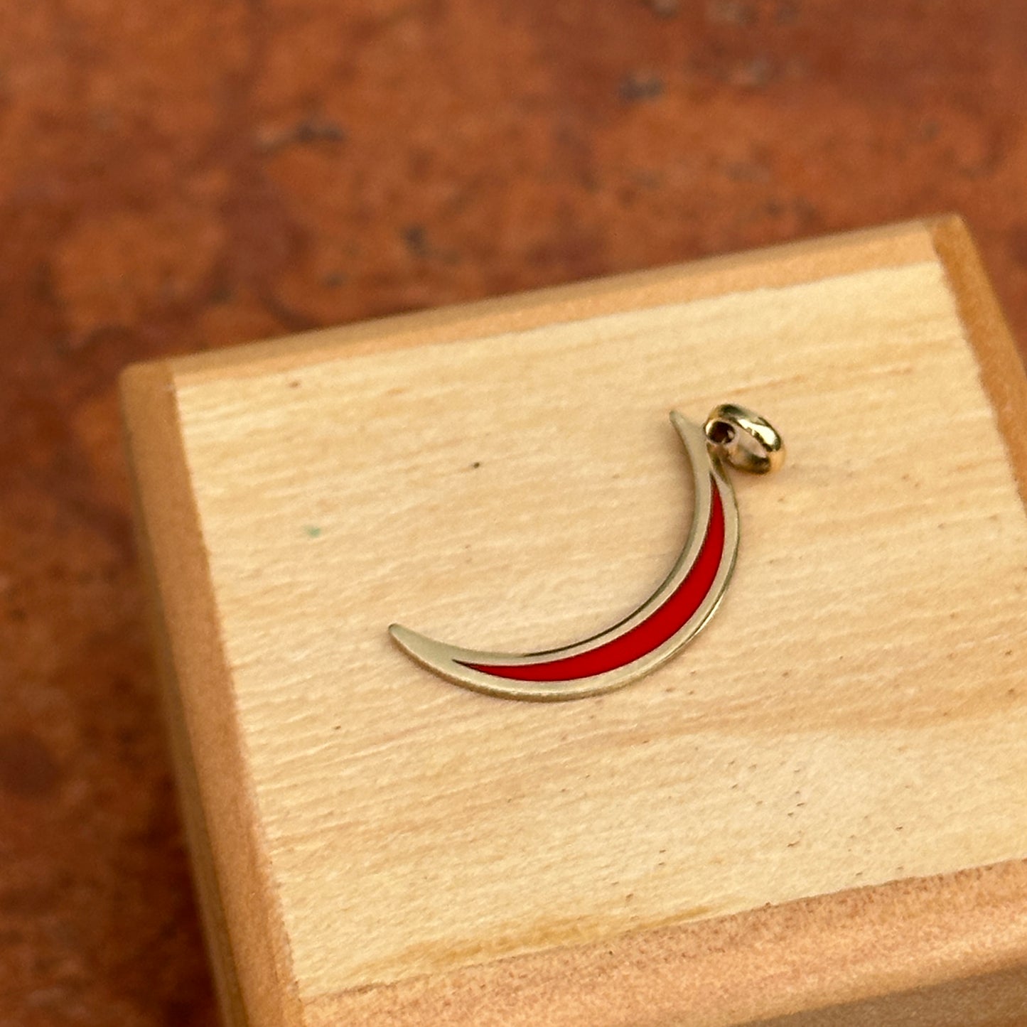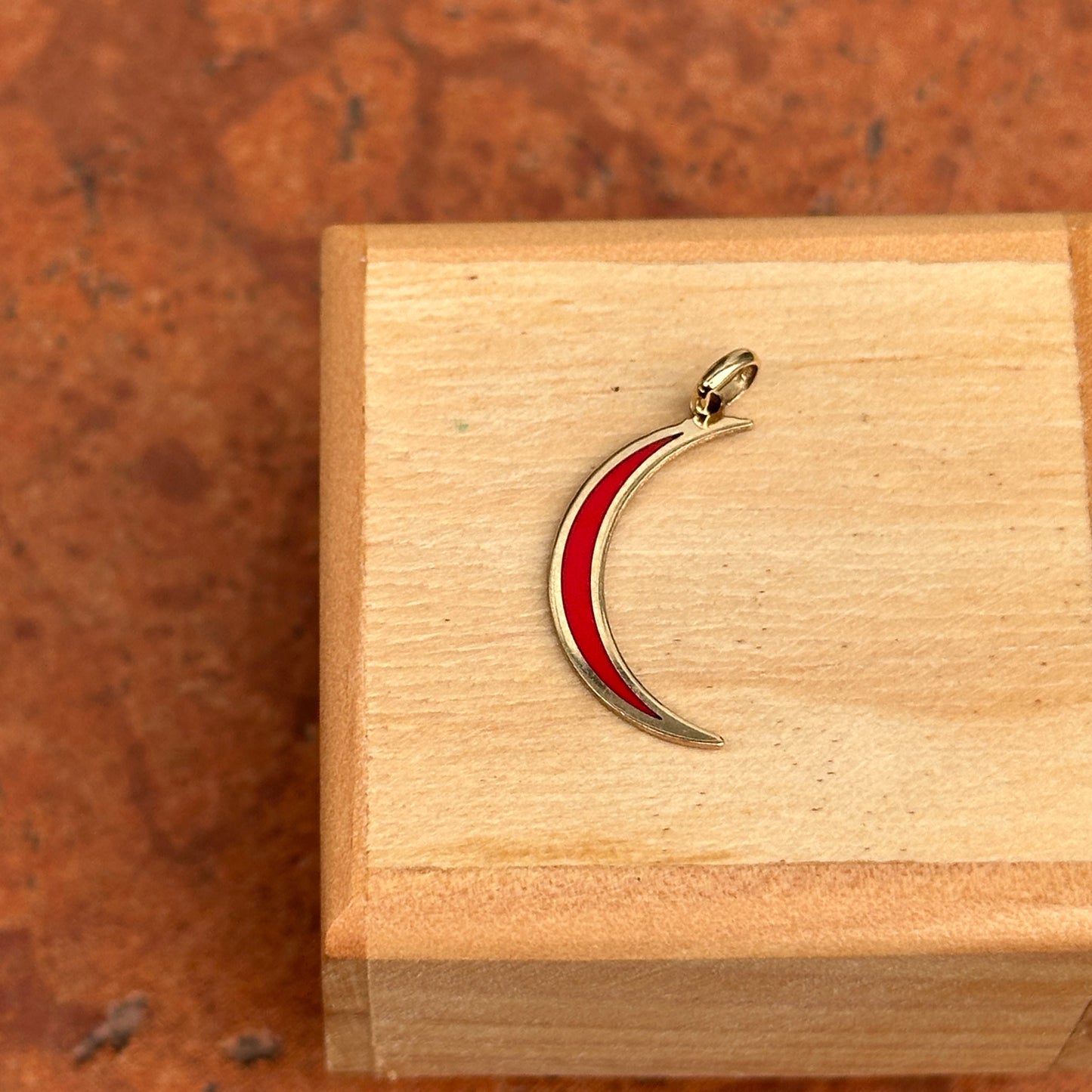 14KT yellow gold crescent moon flat pendant charm with Inlayed, red enamel.