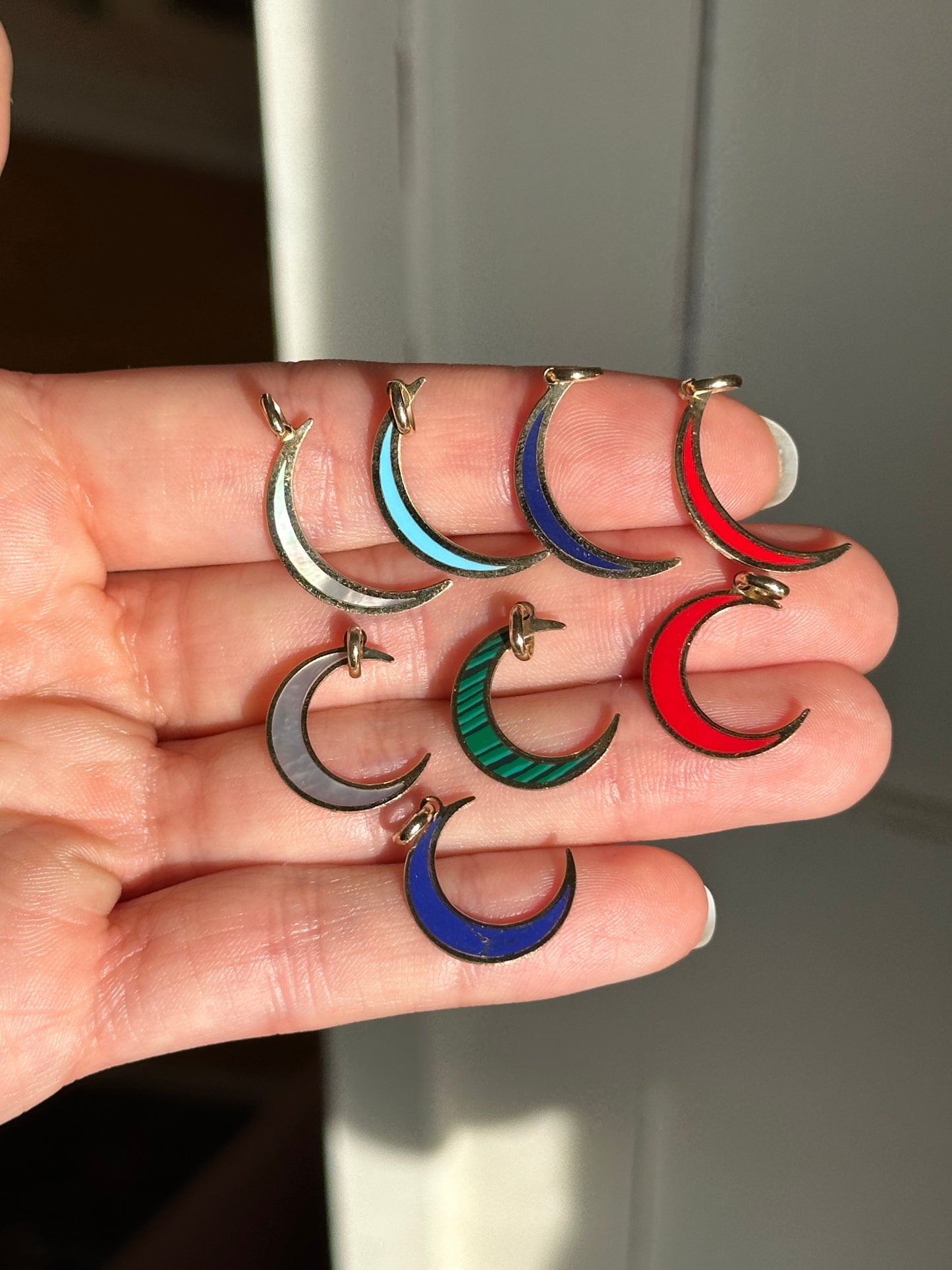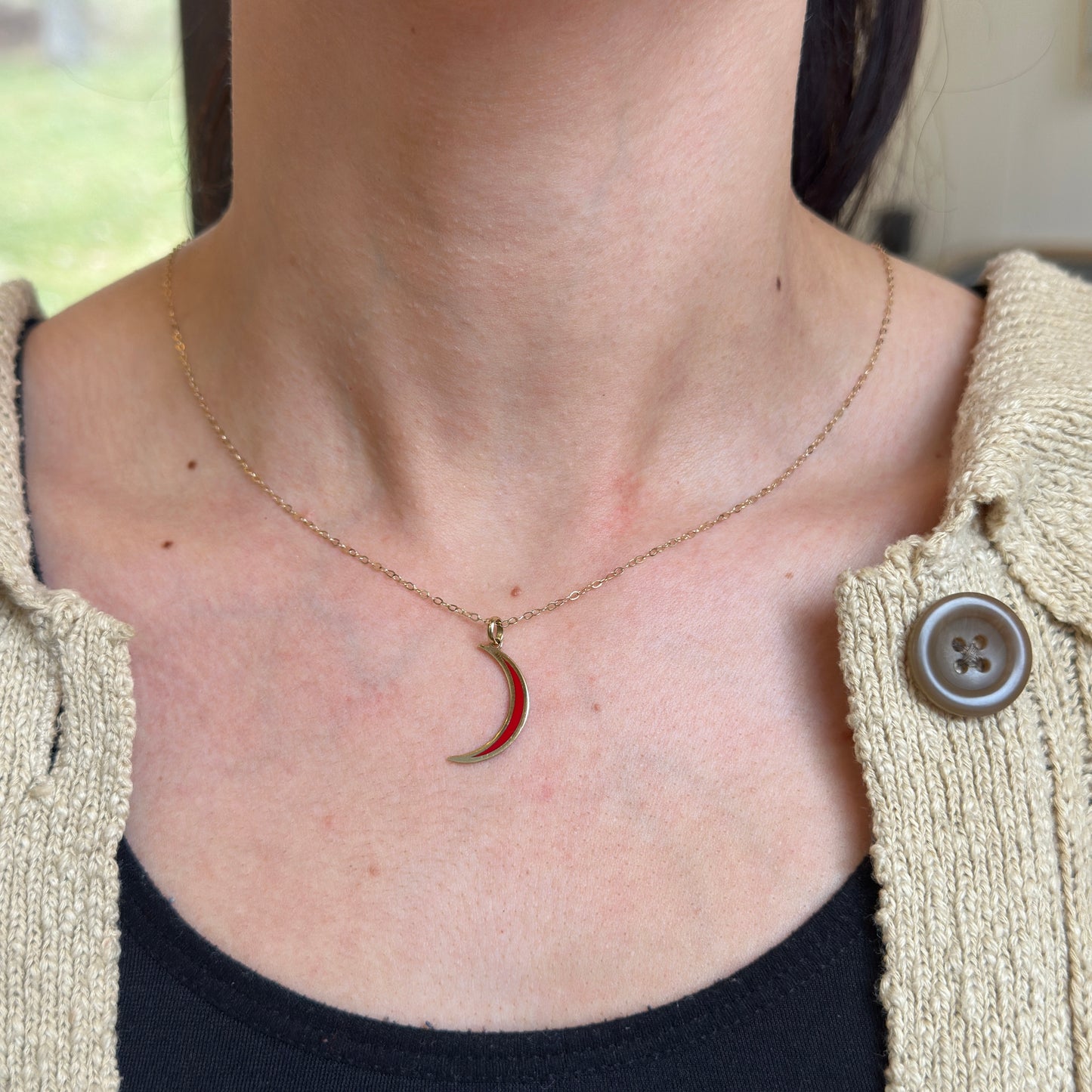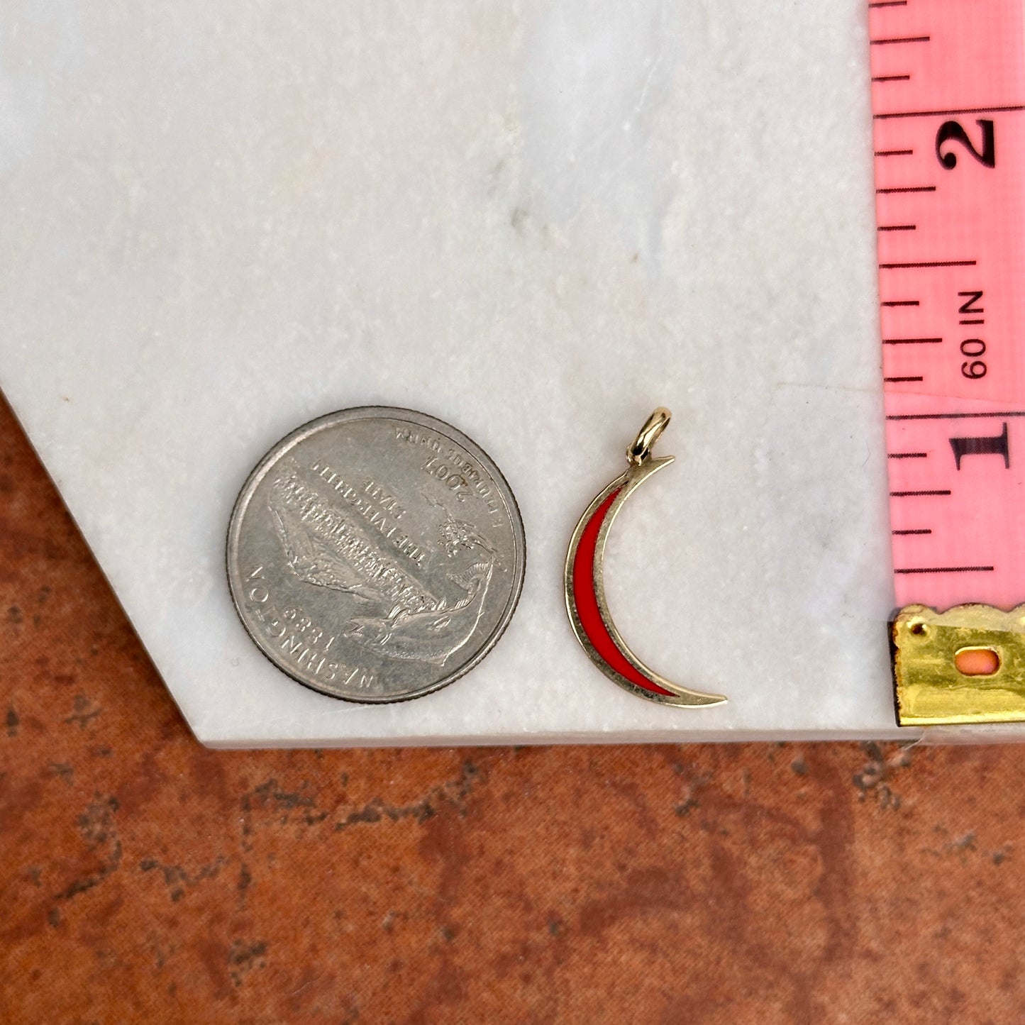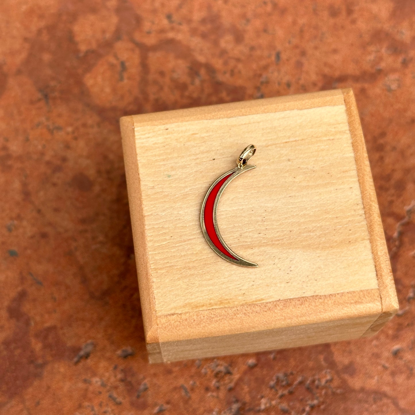 14KT yellow gold crescent moon flat pendant charm with Inlayed, red enamel.