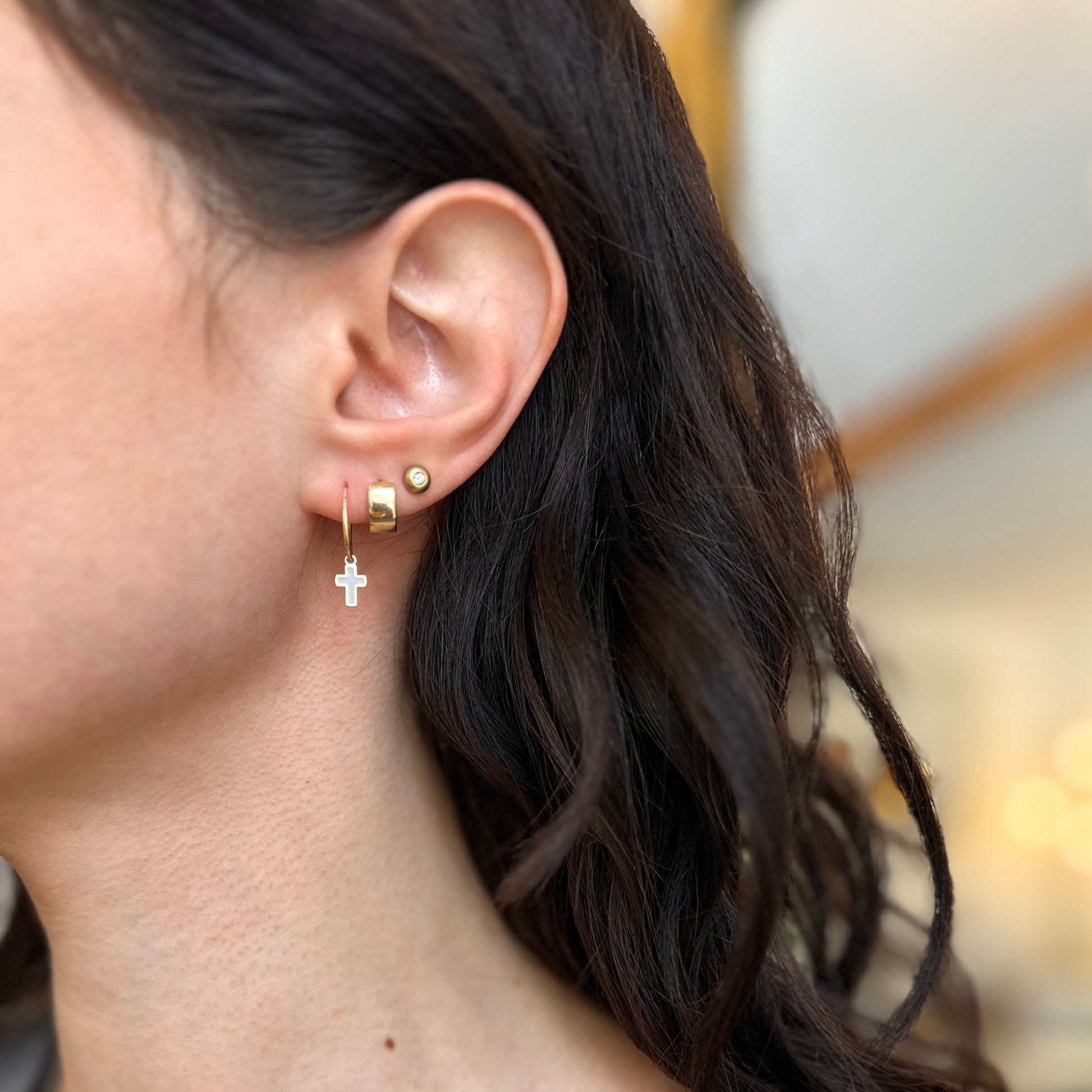 - Disc charms slide along the hoop earrings + you can take the charms off and put on other hoops as well
