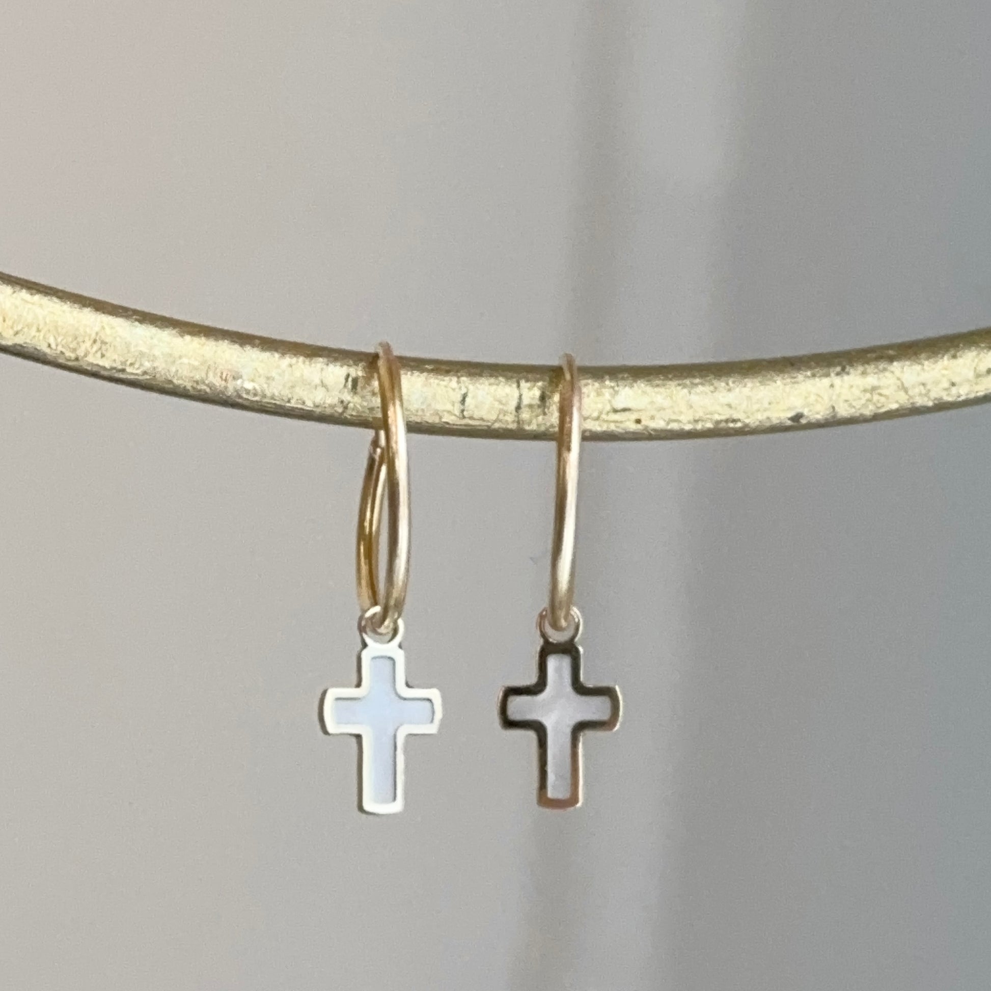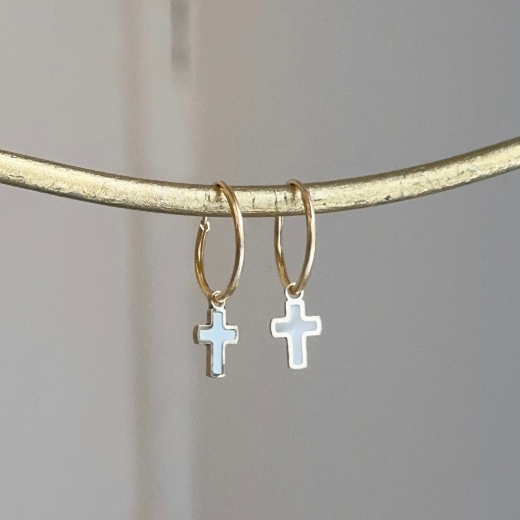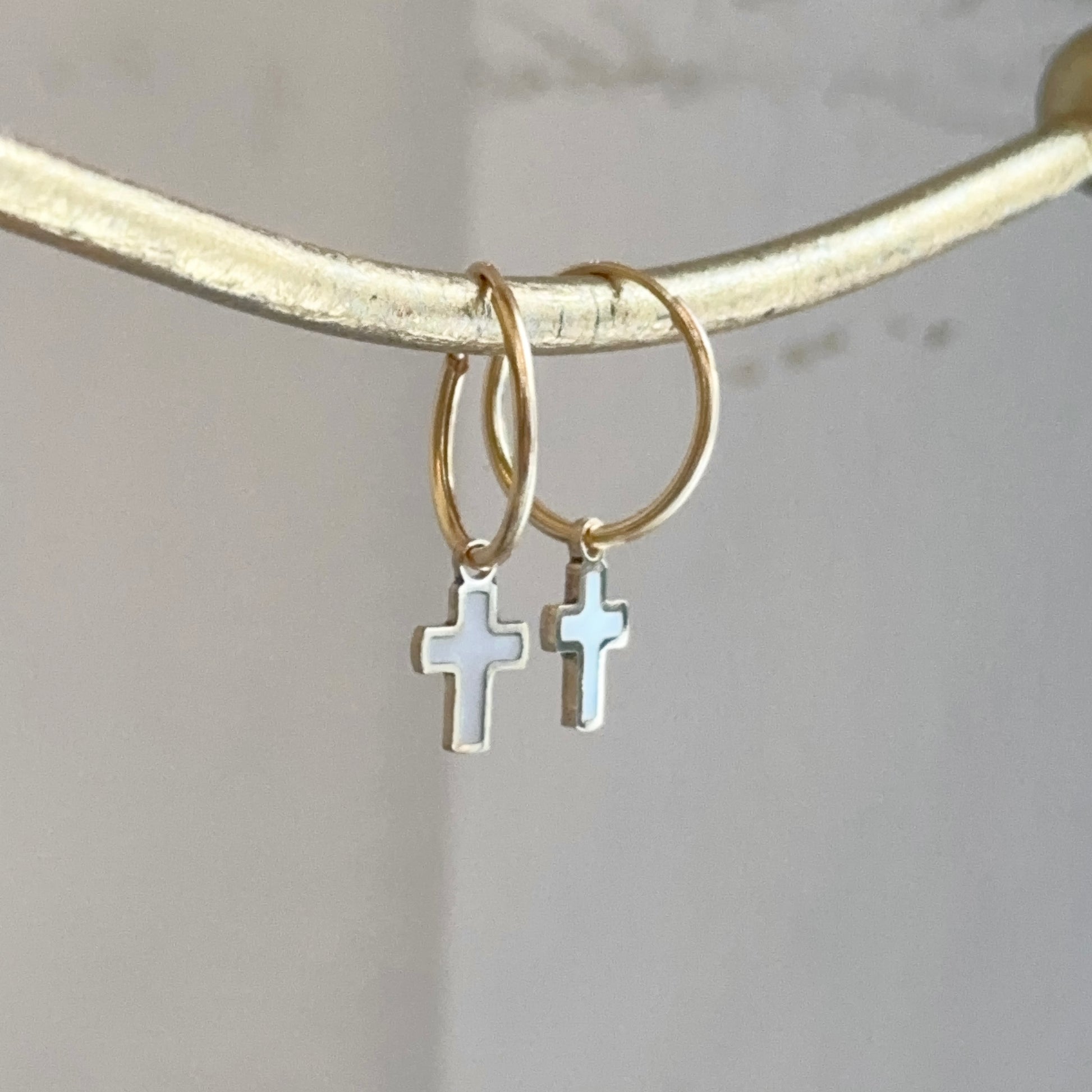 14KT Yellow Gold Small Endless Hoop + Mother of Pearl Cross Charms Earrings