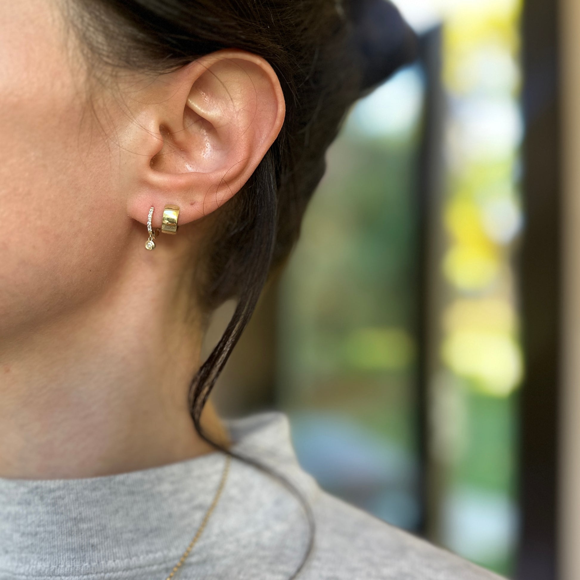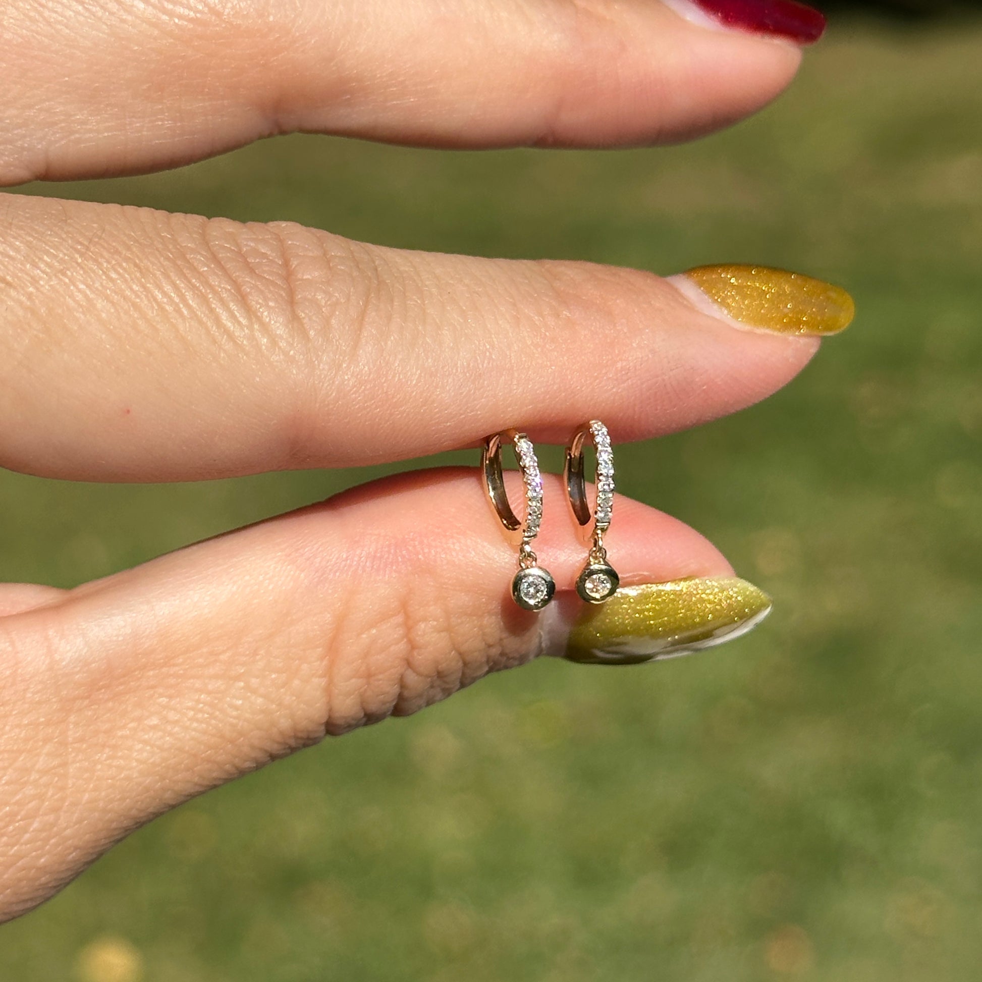 14KT Yellow Gold Round Hoop Round Diamond Huggie Dangle Earrings