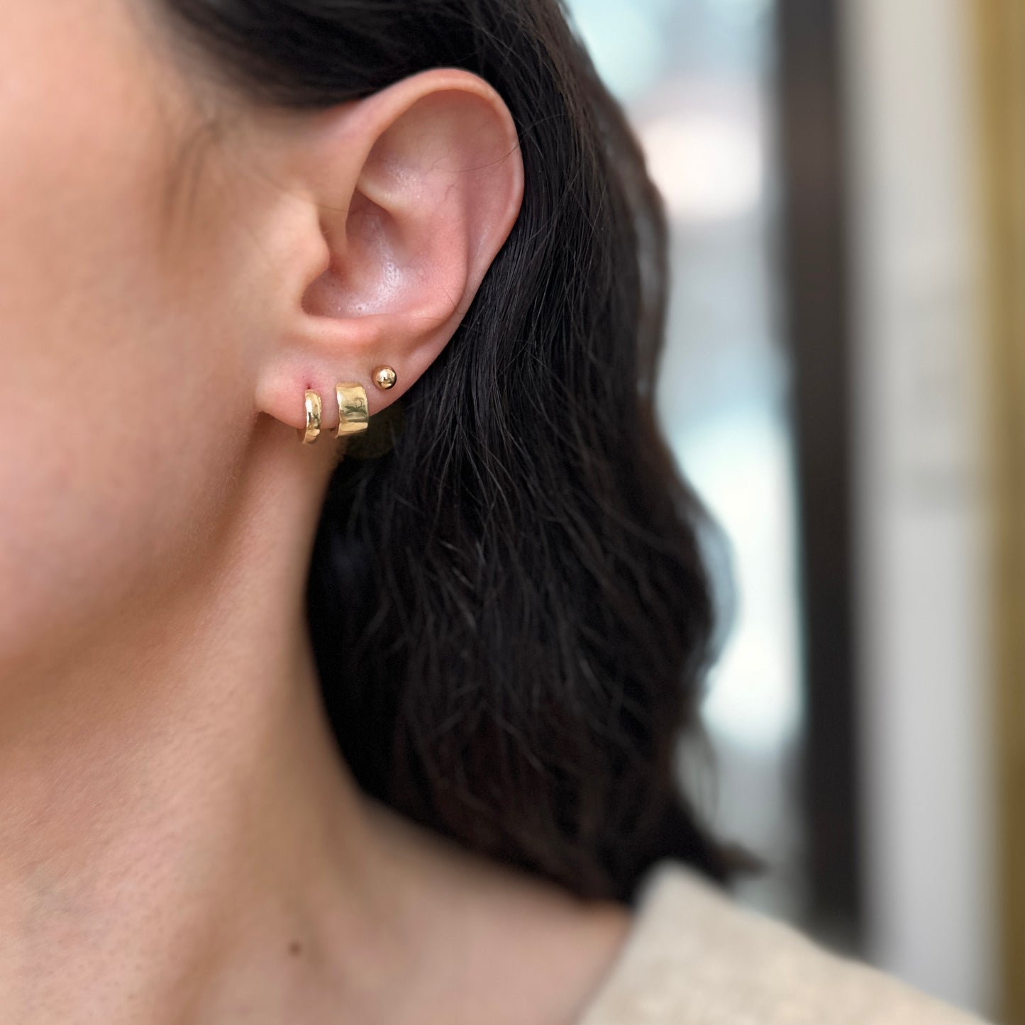 14KT yellow gold round edge, hinged, small hoop earrings. Great, mini size, solid hoops for everyday wear! Sturdy enough for wearing 24/7!