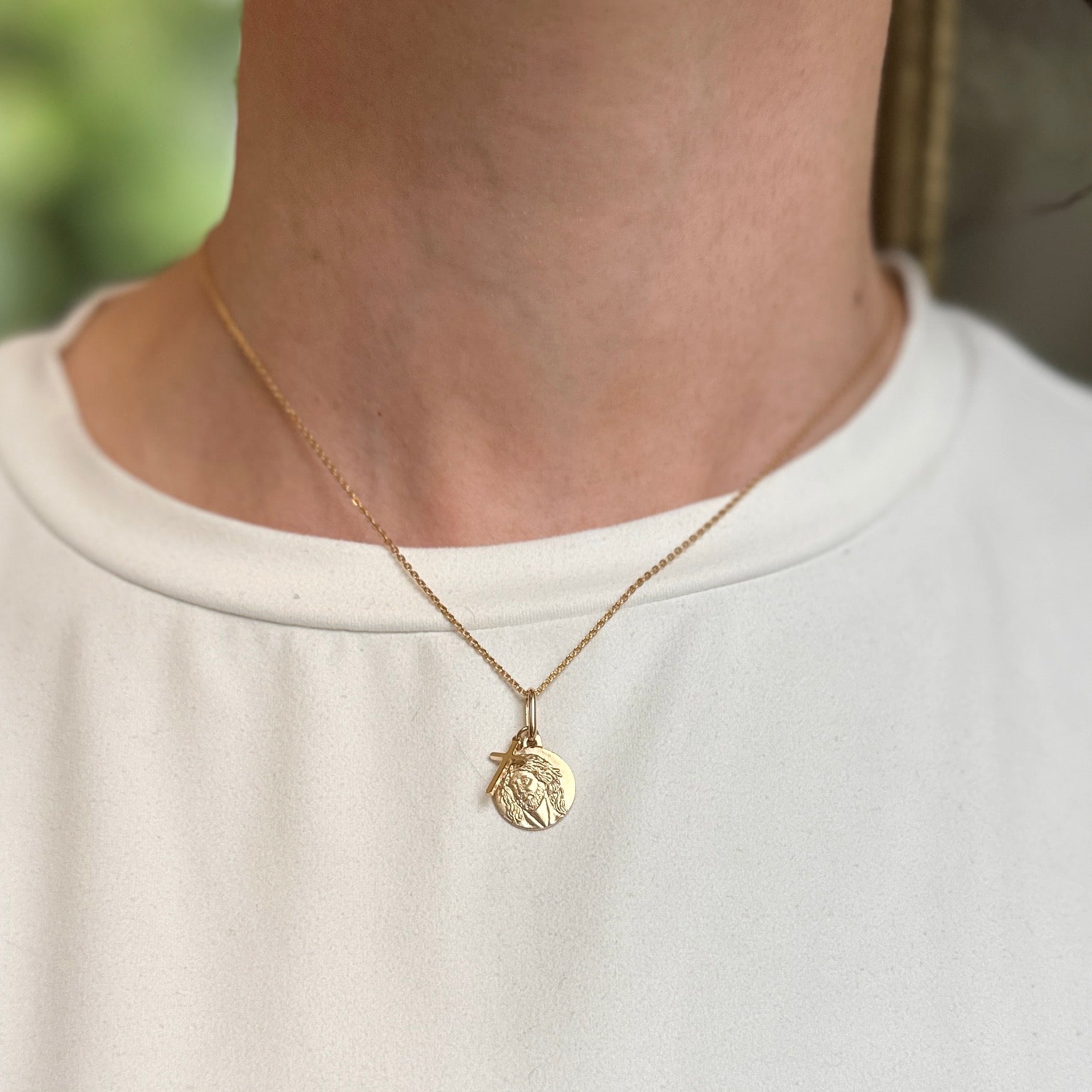 14KT Yellow Gold Matte-Finish, Jesus Round Medal Pendant + Cross Charm Set