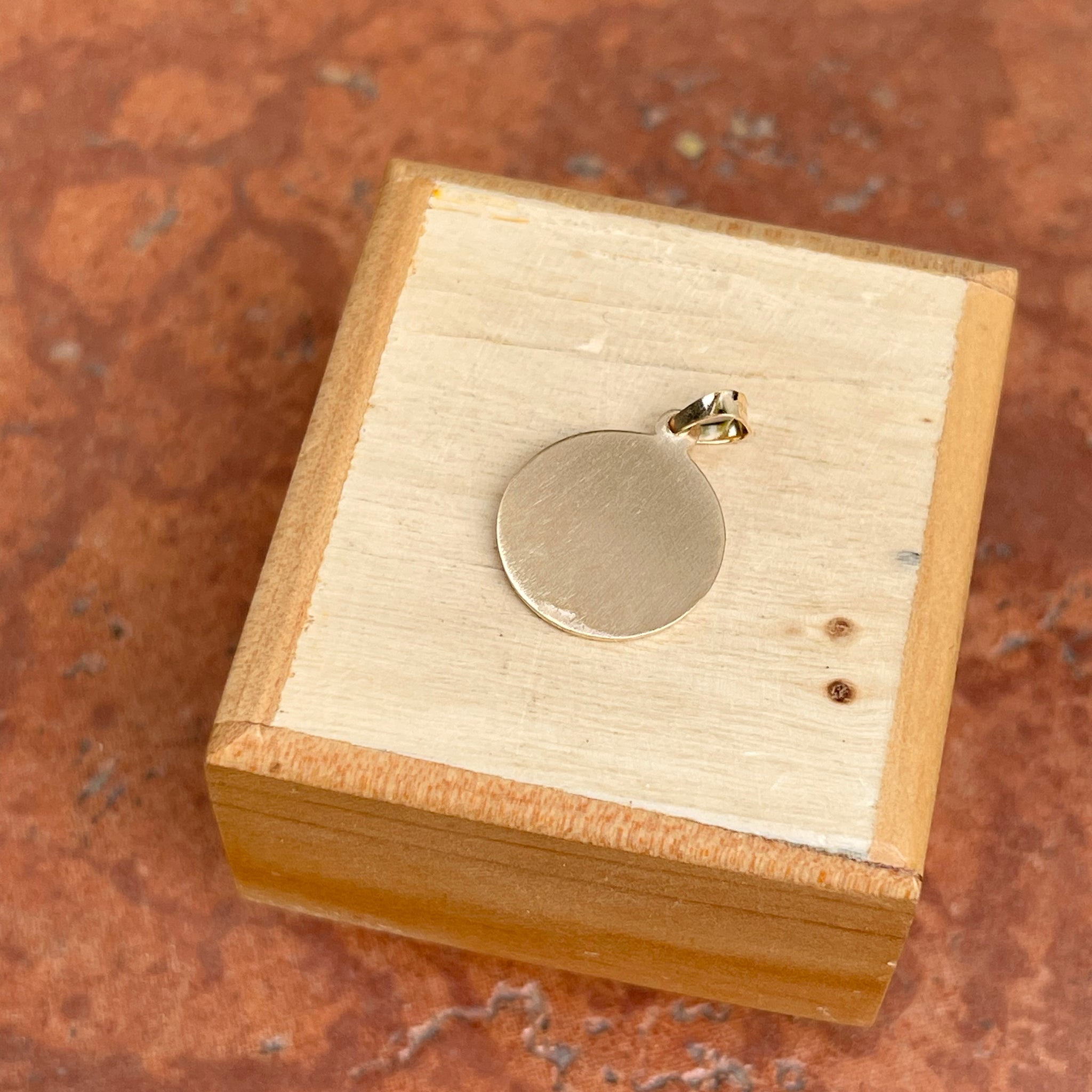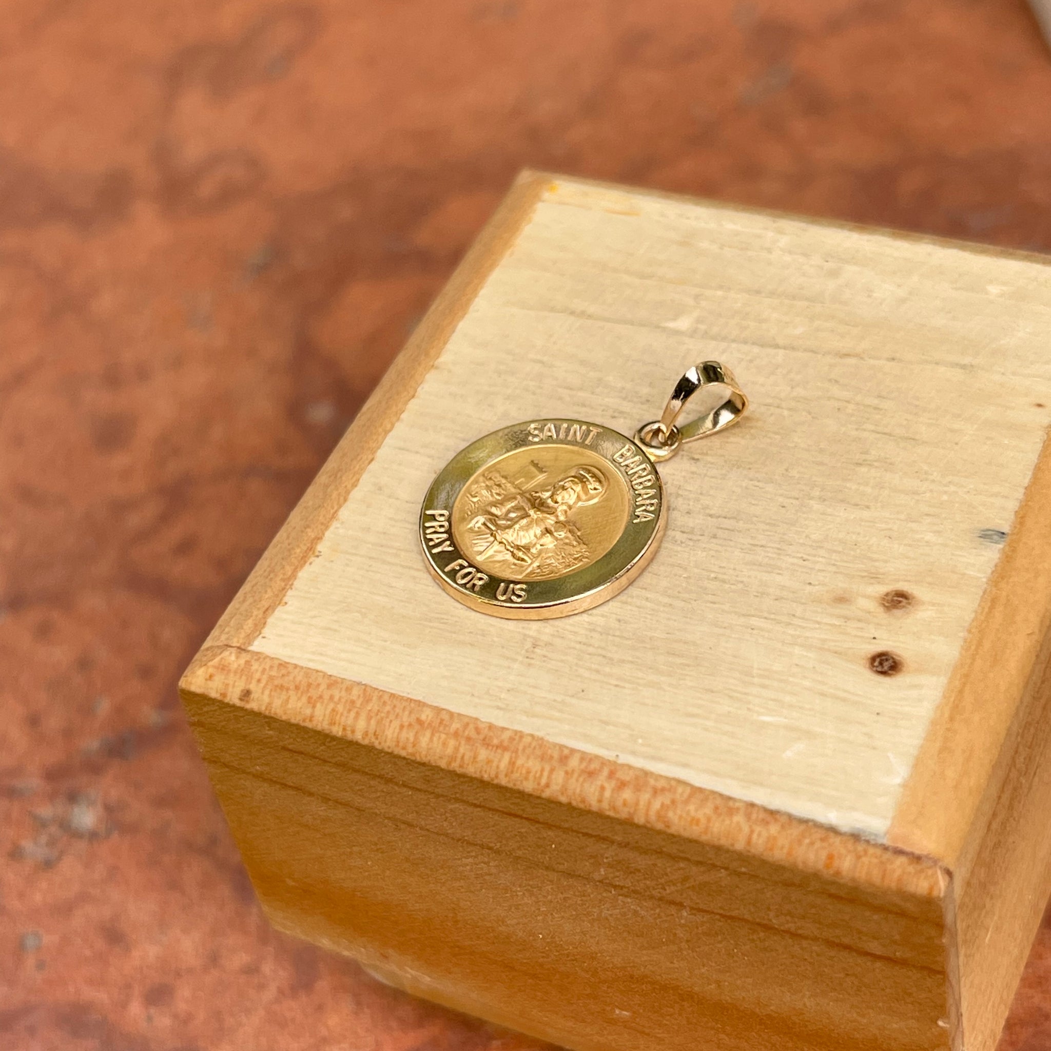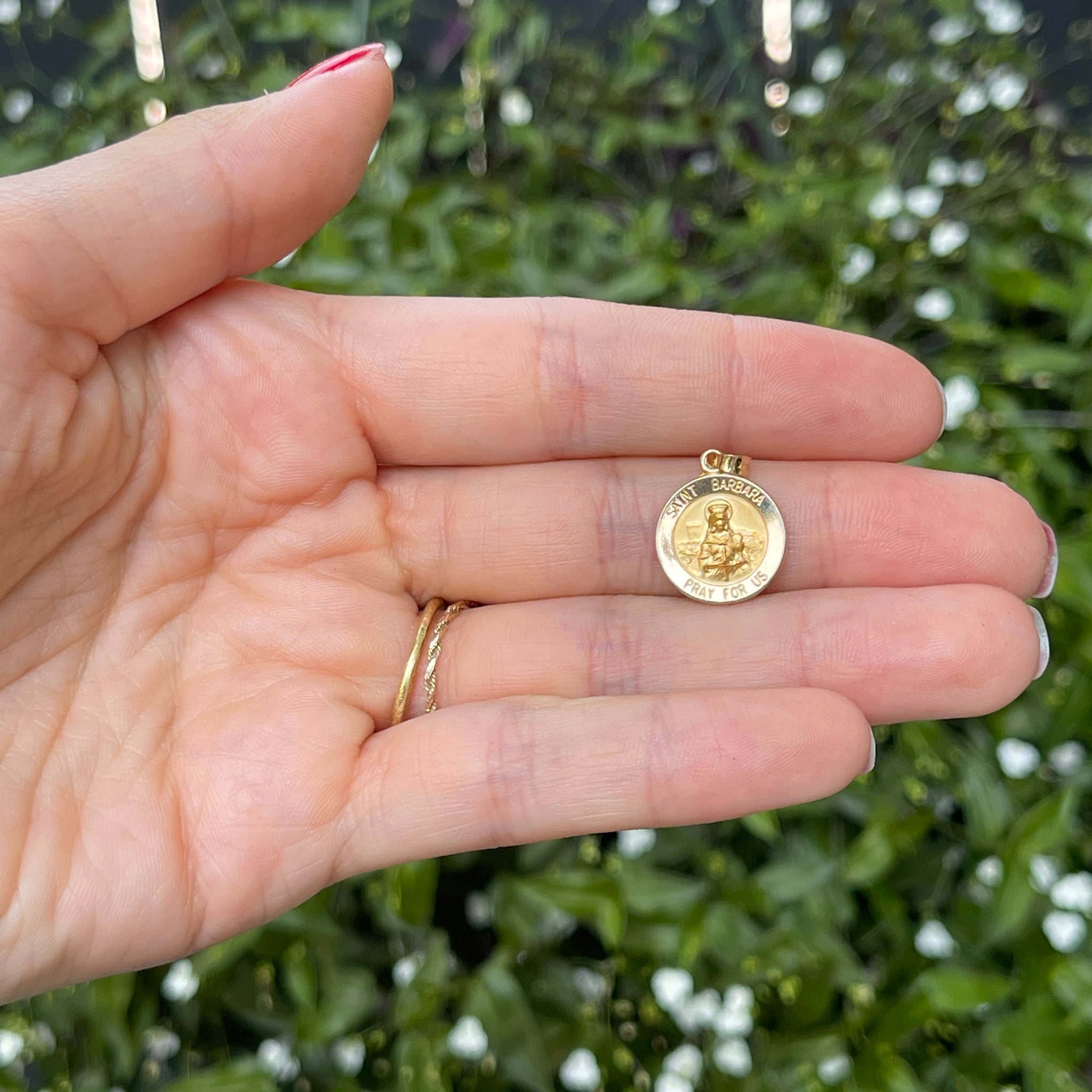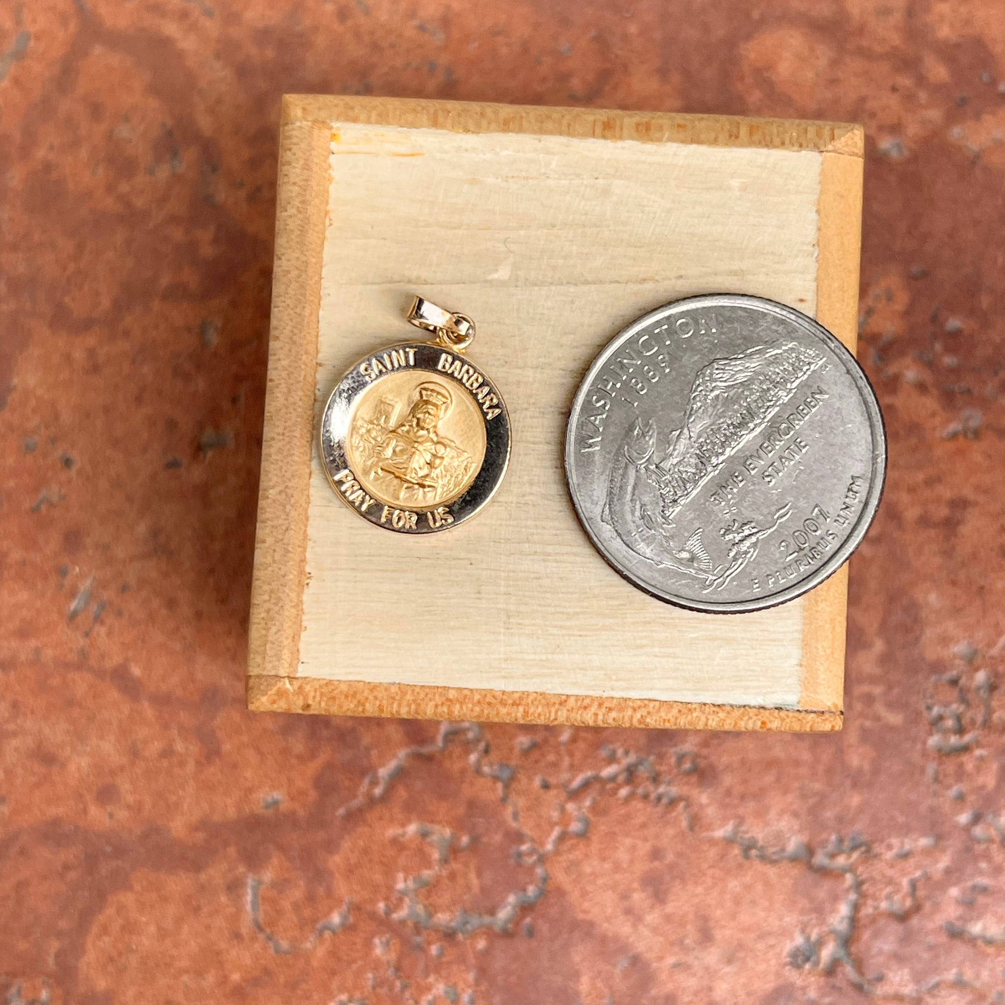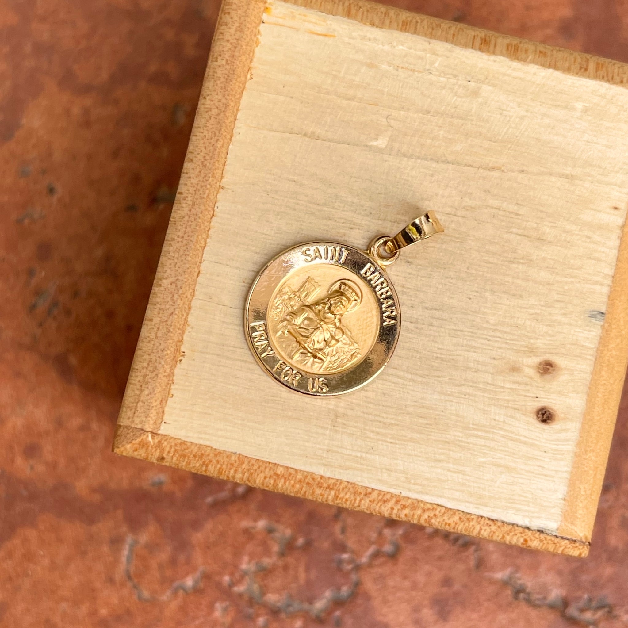 14KT yellow gold Saint Barbara "Pray for Us" round medal pendant charm. St. Barbara is the patron saint of architects, artillery men, miners, and firemen/ women nurses.