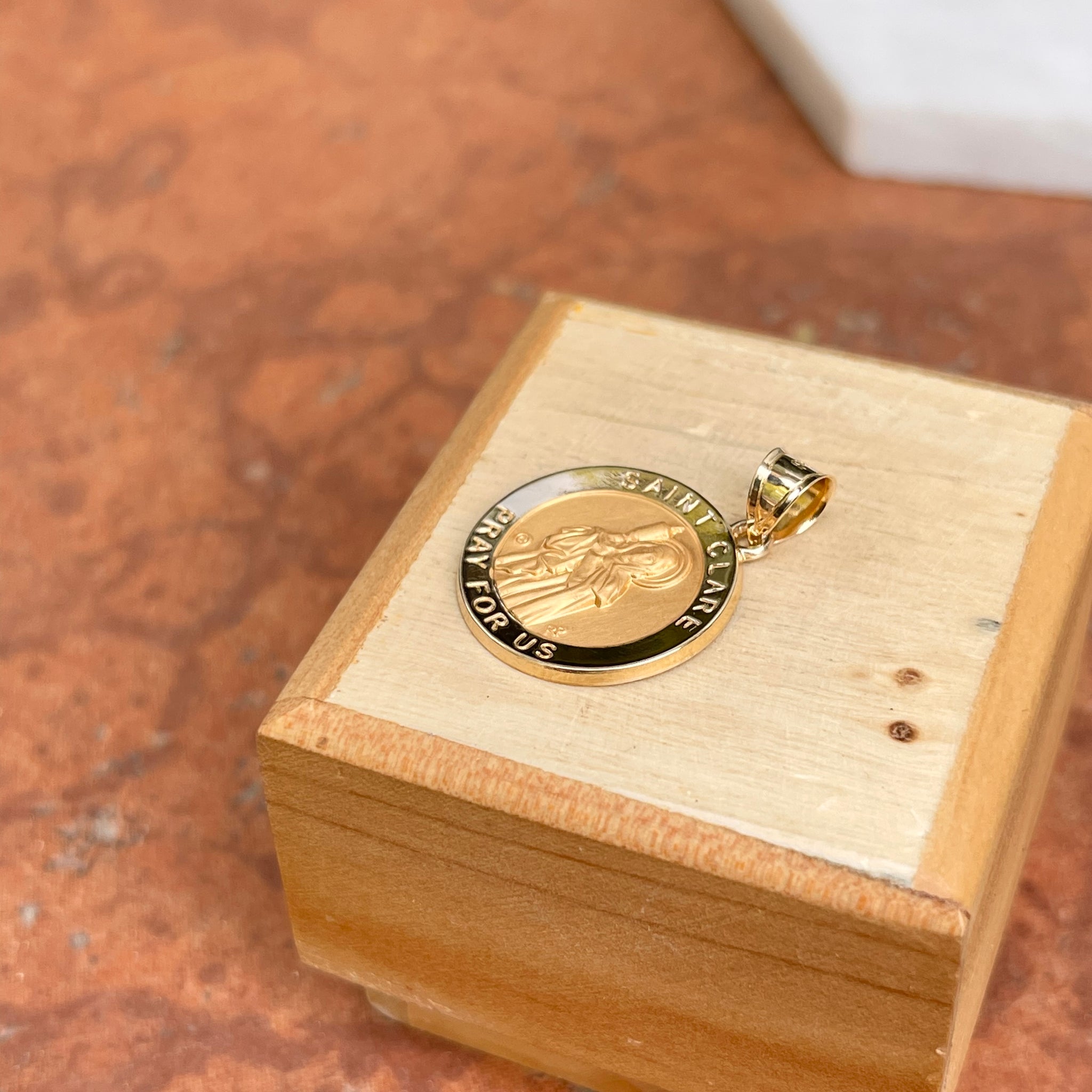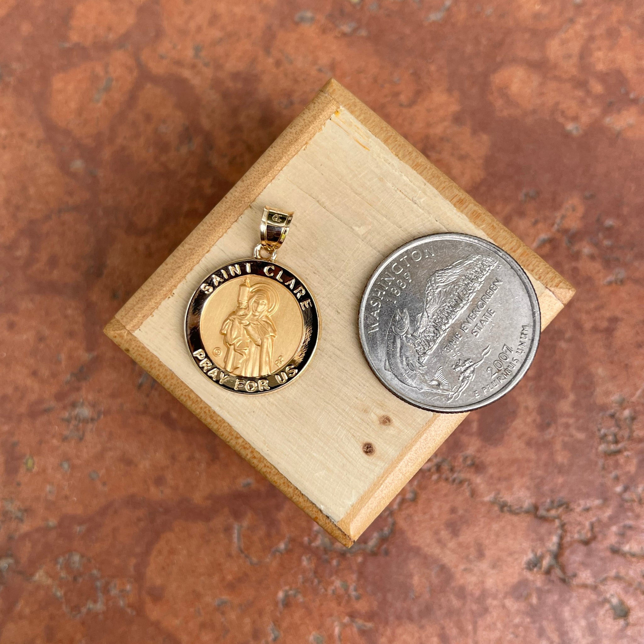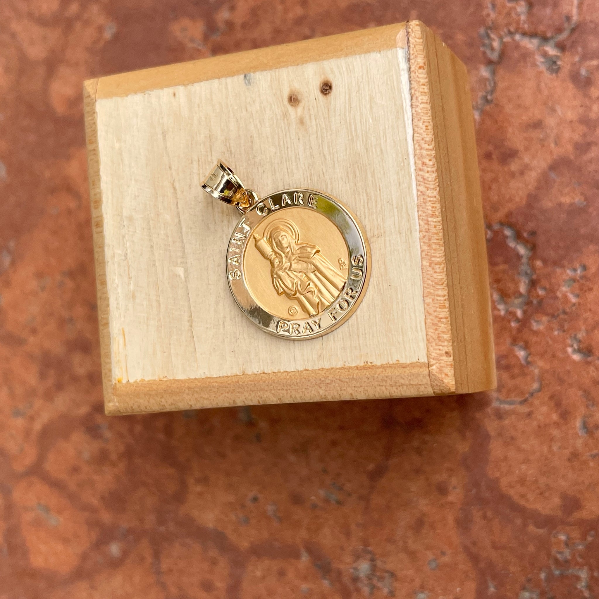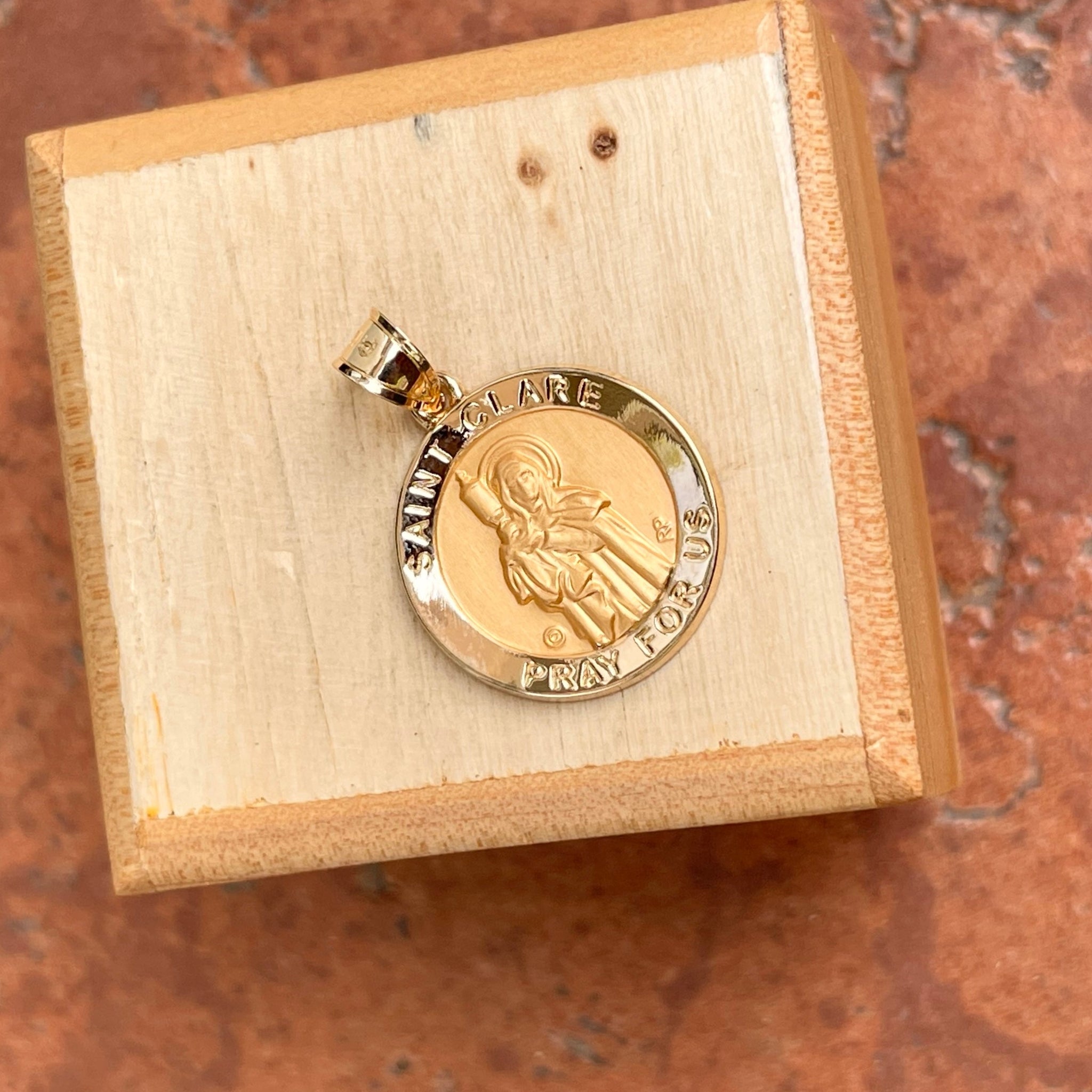 Polished + satin finished 14KT yellow gold round Saint Clare "Pray for Us" medallion pendant charm. St. Clare is the Patron Saint of She is the patron saint of eye disease, goldsmiths, laundry, television, bicycle messengers, good weather, and needle workers. This makes a wonderful gift for a friend/family member.