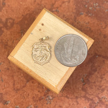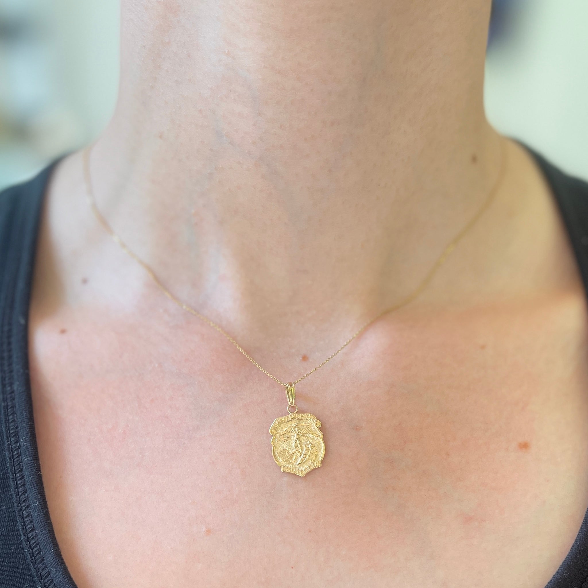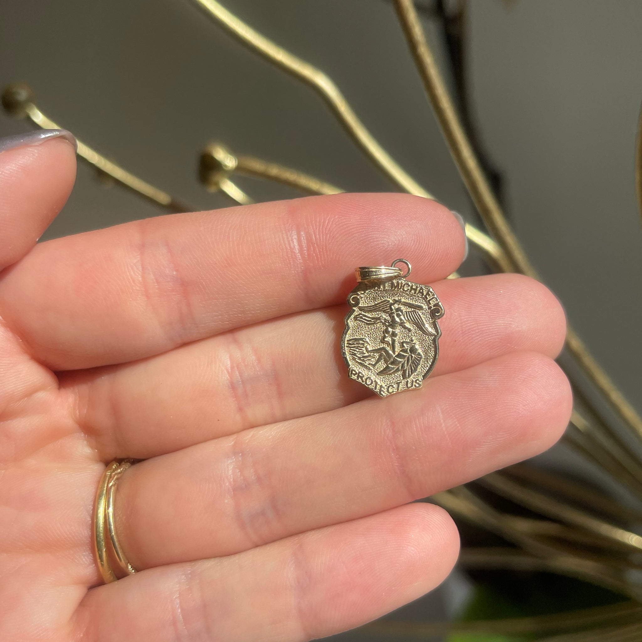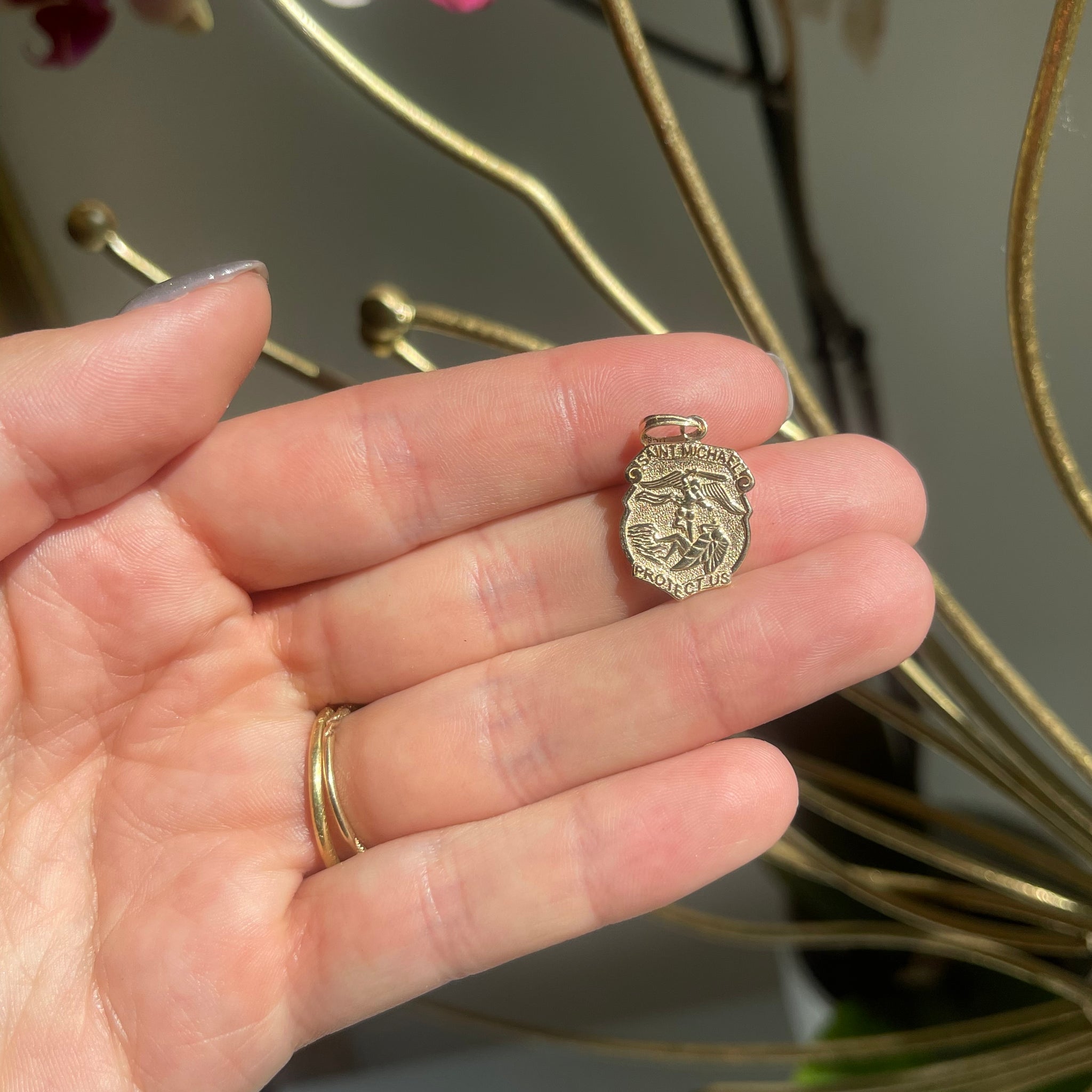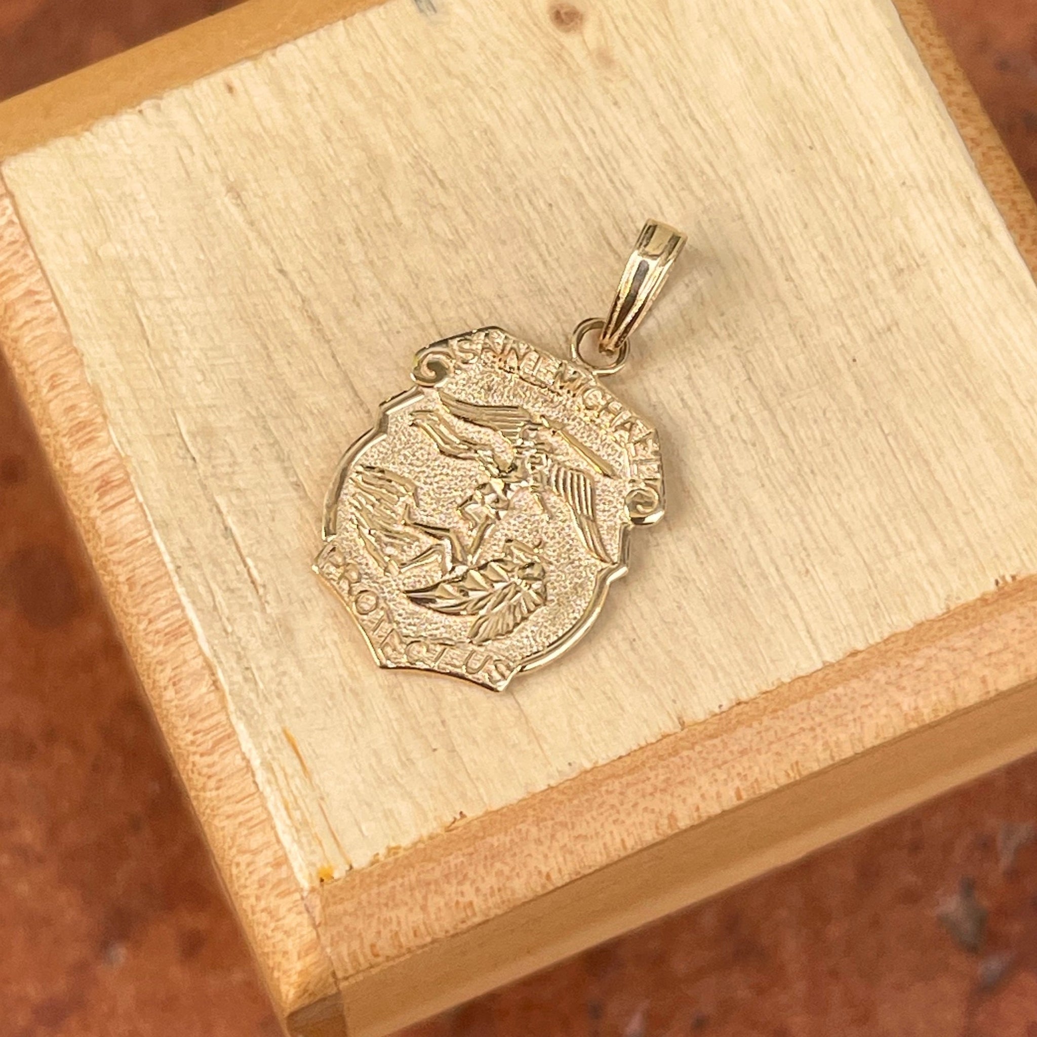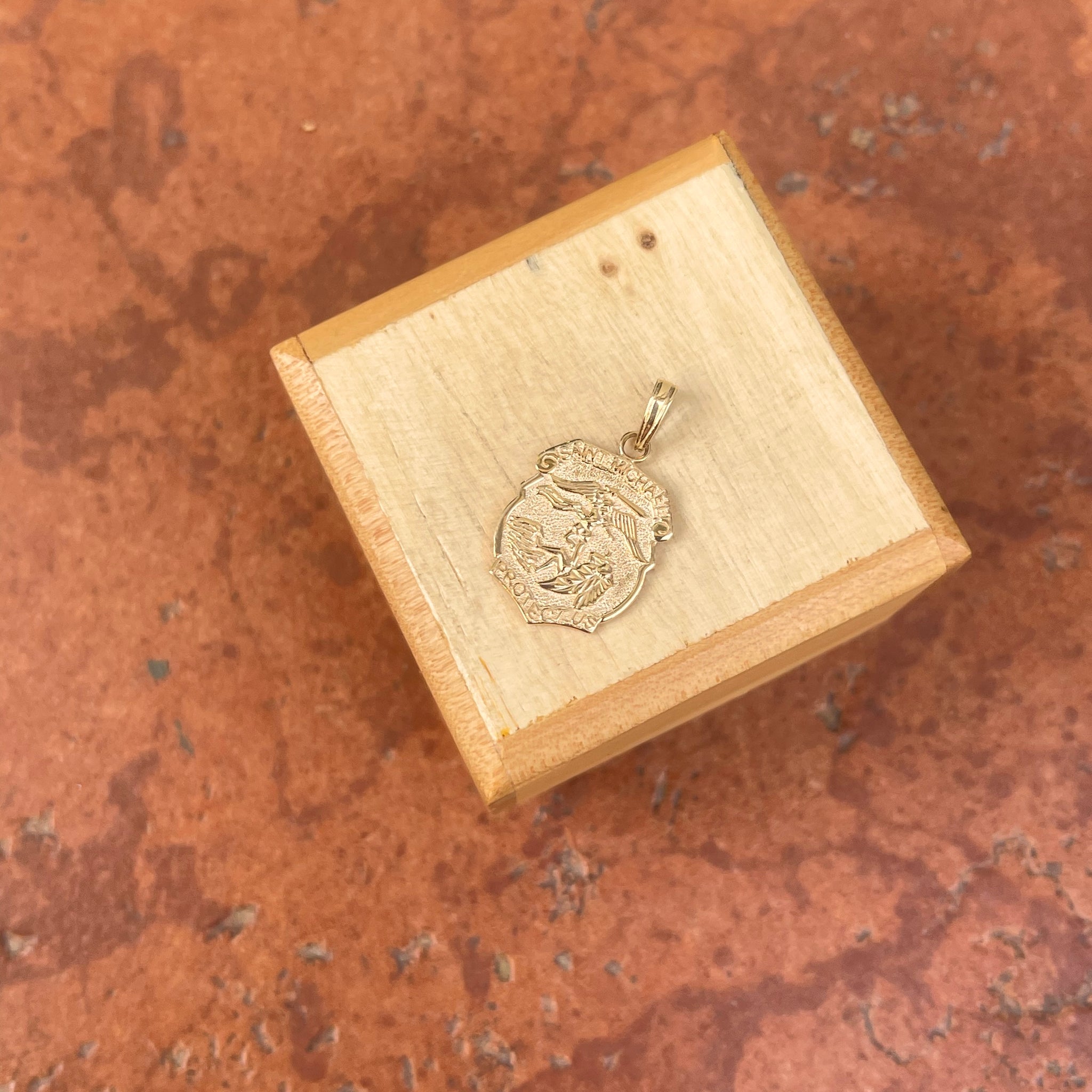 14KT yellow gold St. Michael "Protect Us" badge pendant charm. St. Michael is the patron saint of police officers + military personnel!
