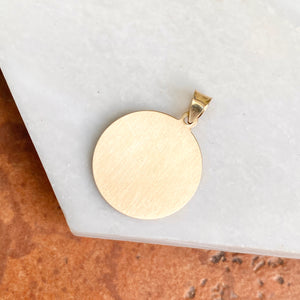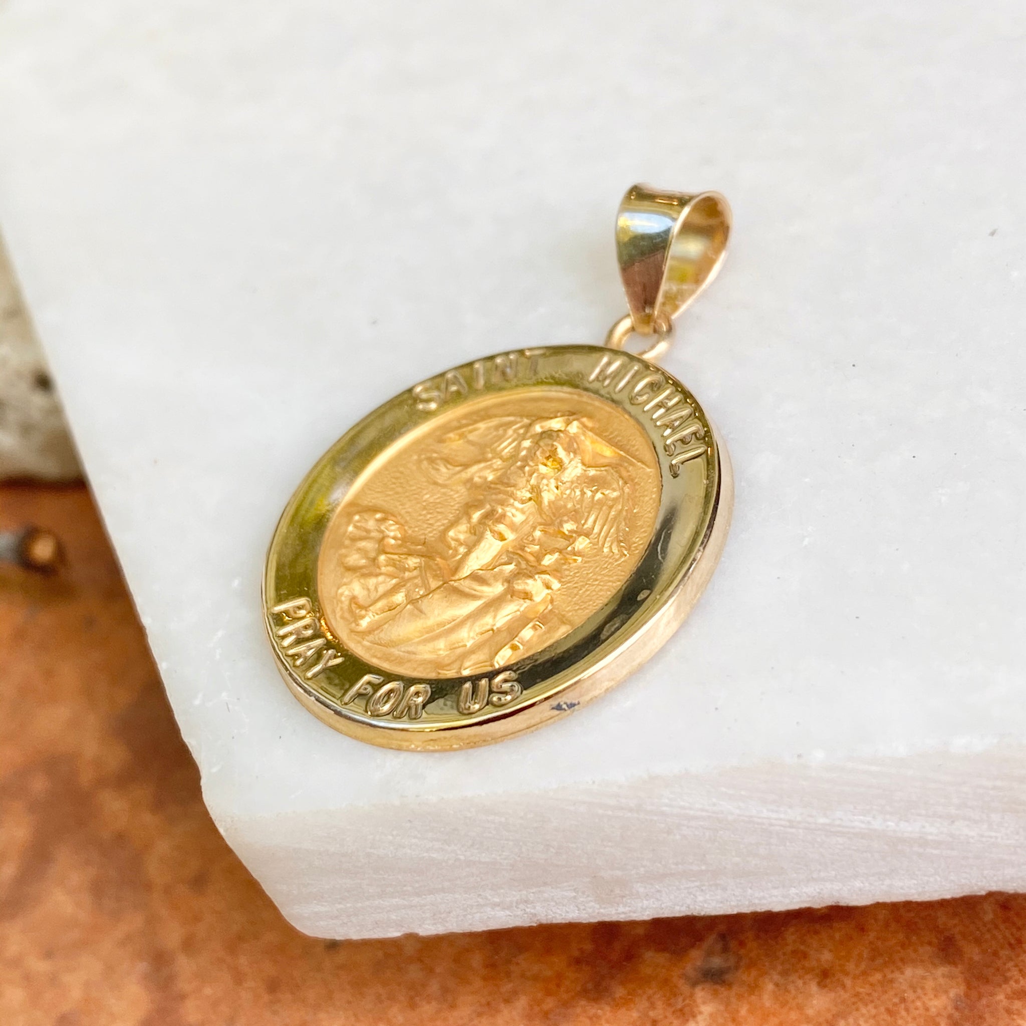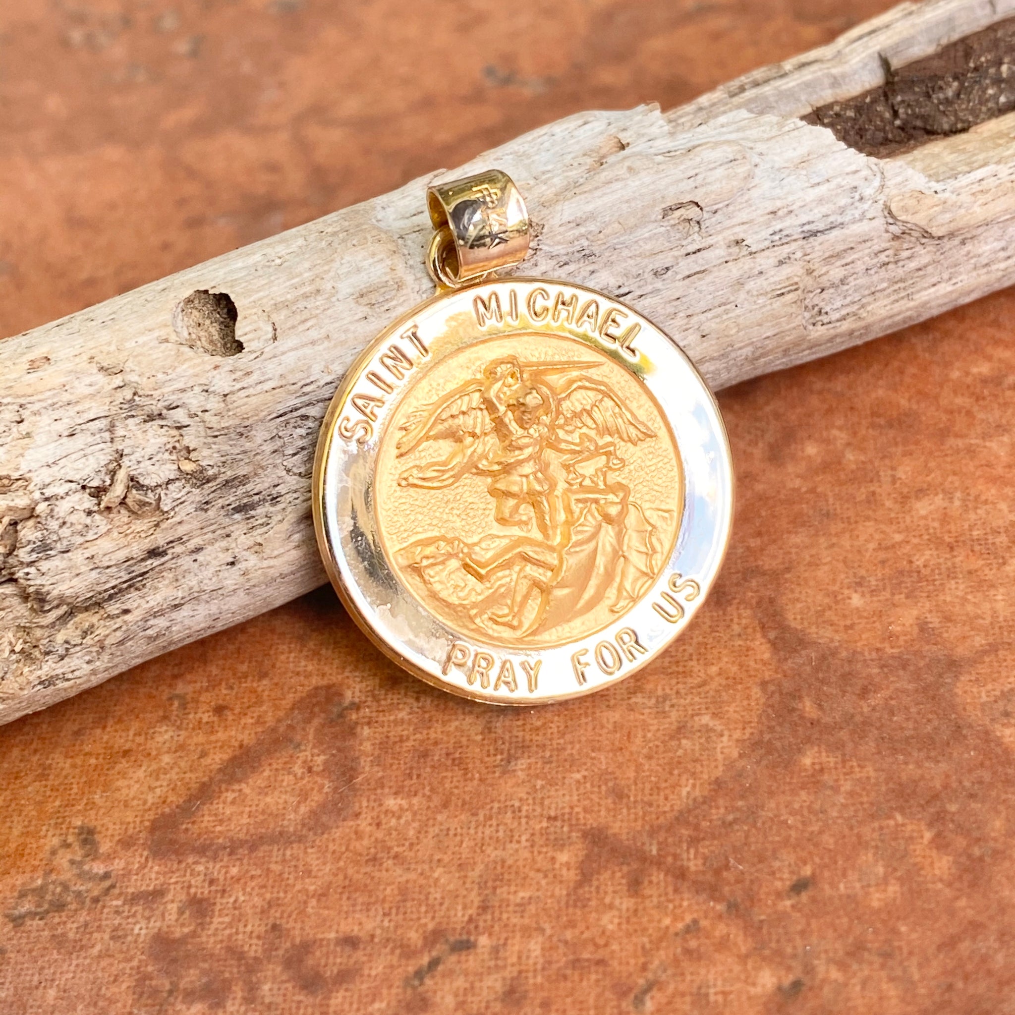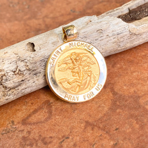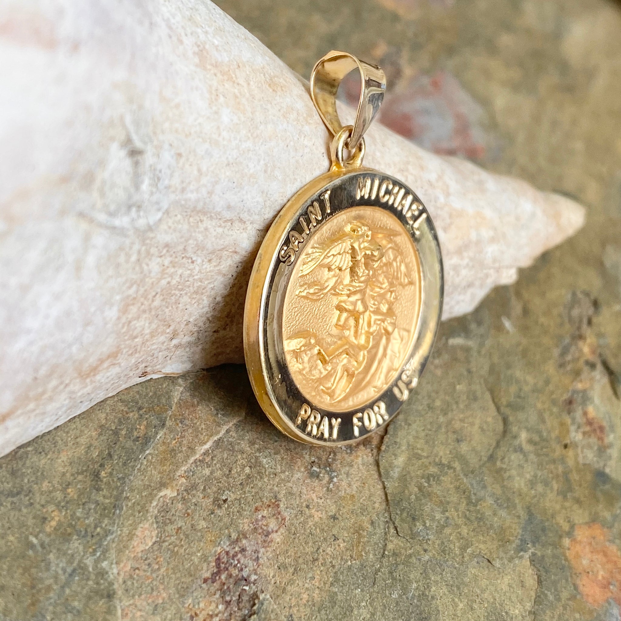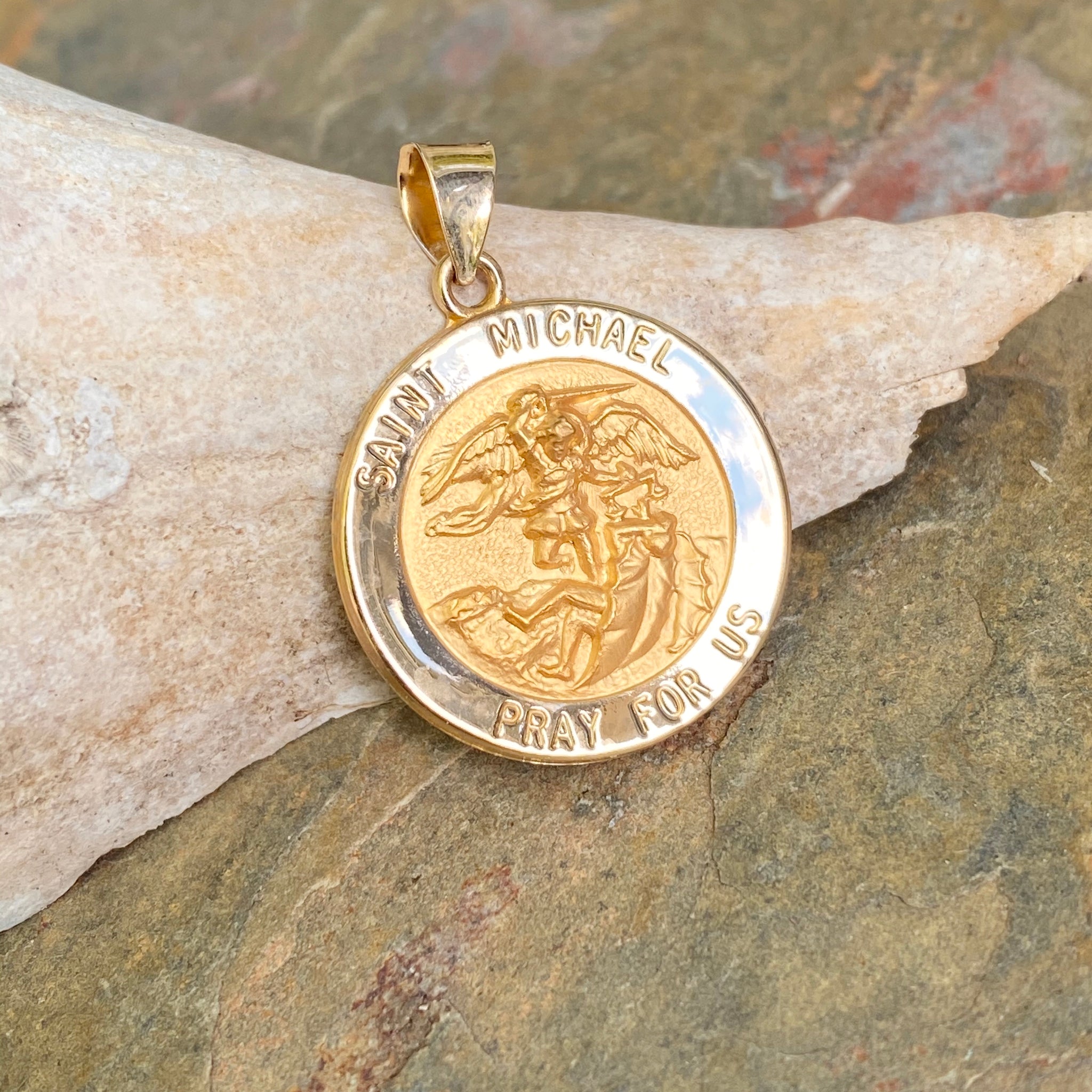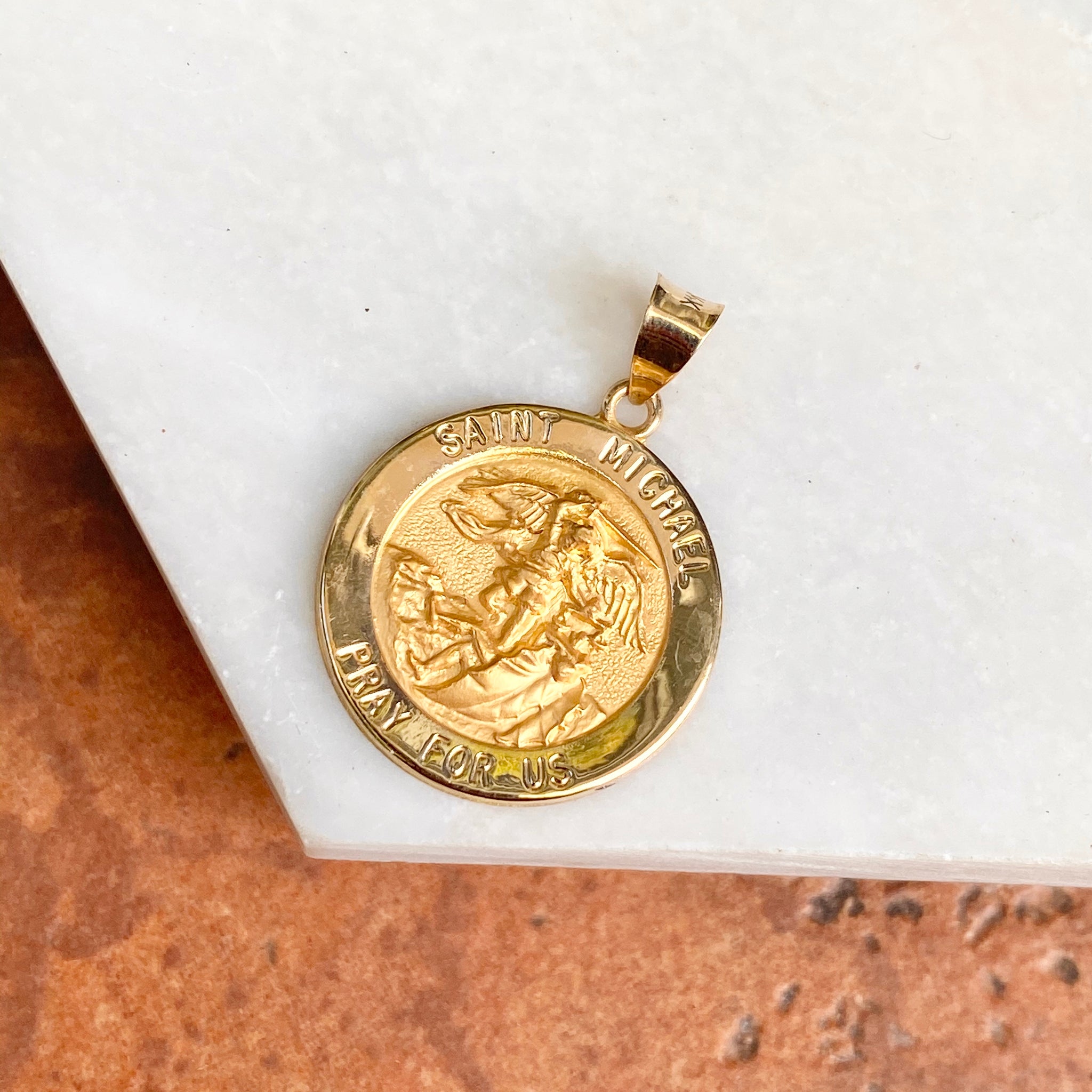 14K yellow gold St.Michael round medal pendant. St.Michael the patron saint of chivalry and is now also considered the patron saint of police officers, paramedics and the military Simply slide this pendant onto a chain necklace. Necklace chain sold separately.