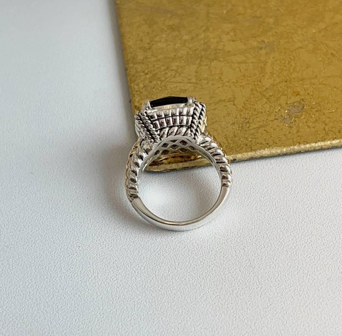 14K Yellow Gold + Sterling Silver Genuine, Checkerboard, Faceted, Smoky Quartz + Diamond Ring. Features antique finishes on the silver