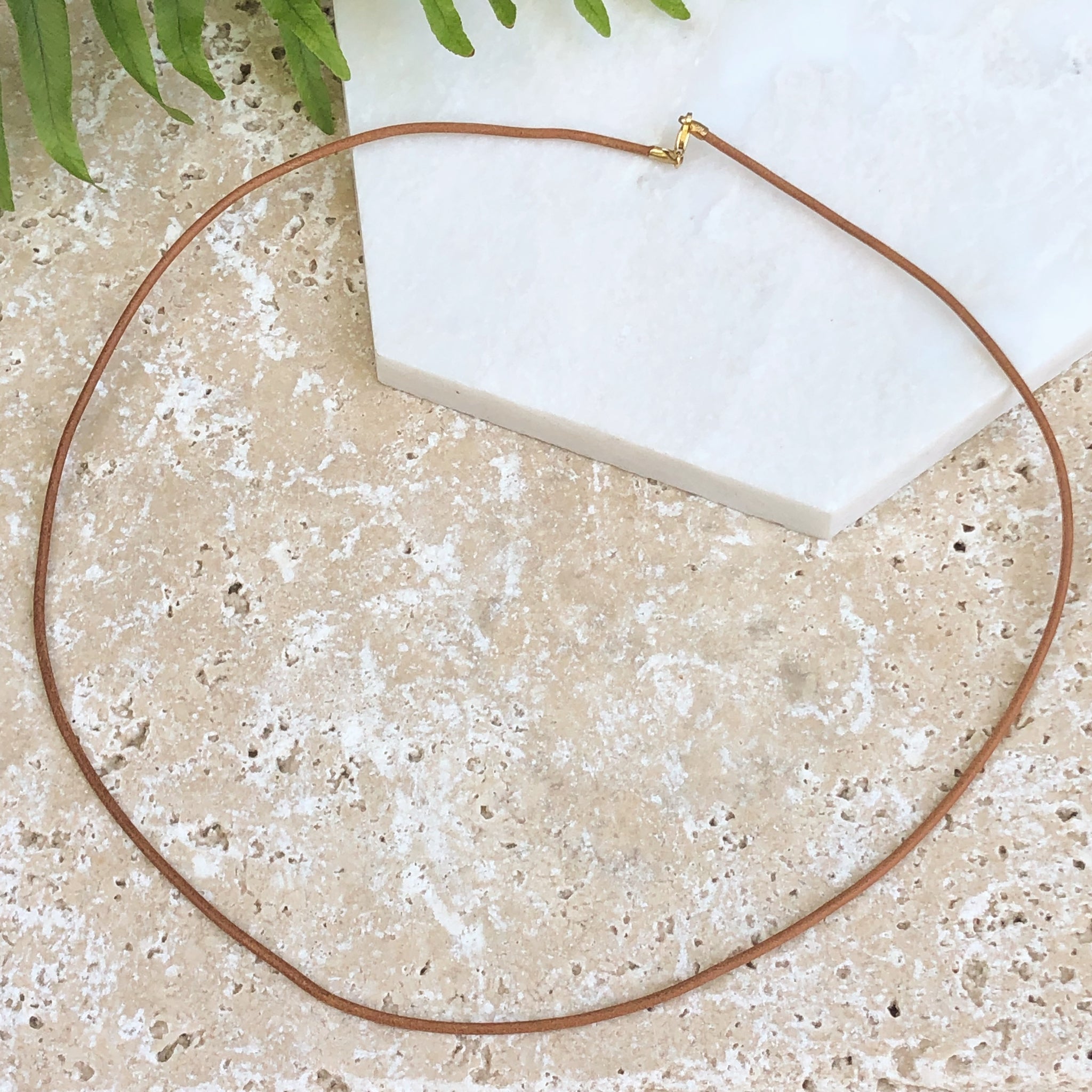 14KT yellow gold + brown tan leather cord necklace. Wear alone or add on a pendant to transform the necklace!