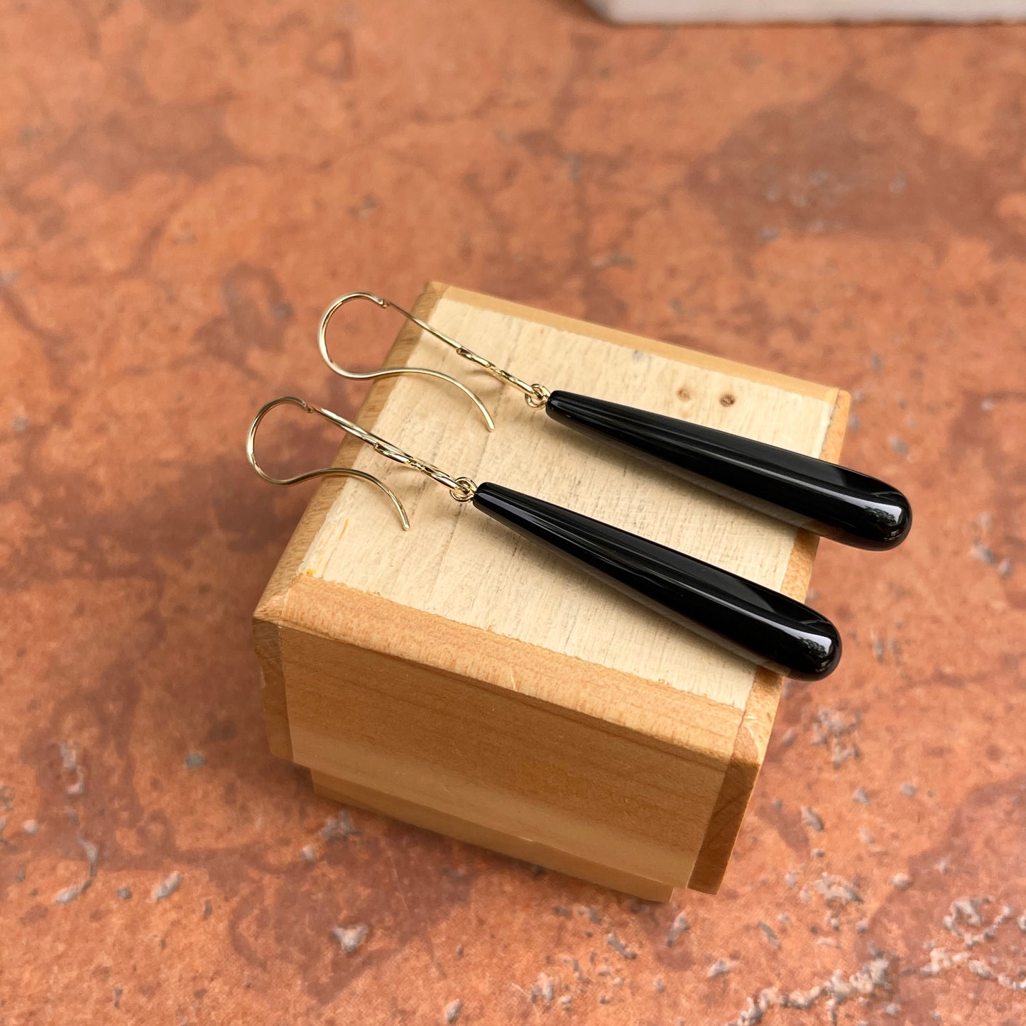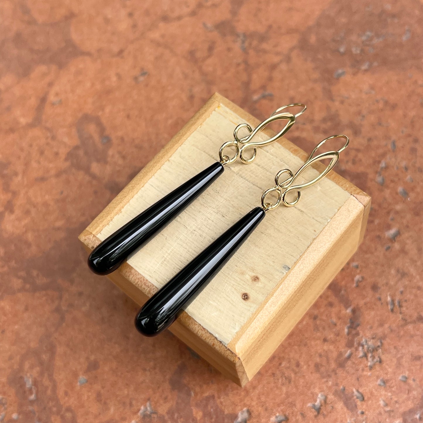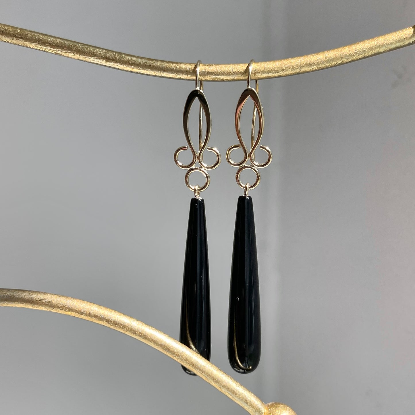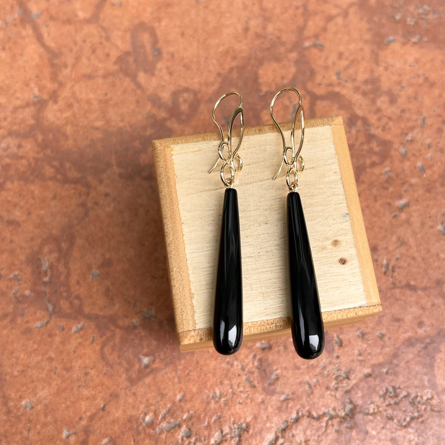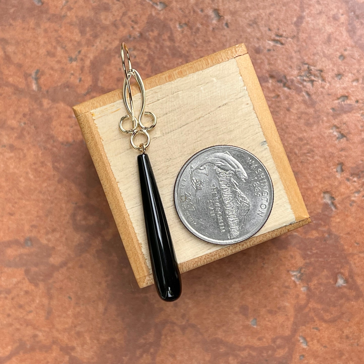14KT yellow gold long, teardrop, black onyx gemstone ear wire dangle earrings with scroll detail.