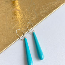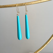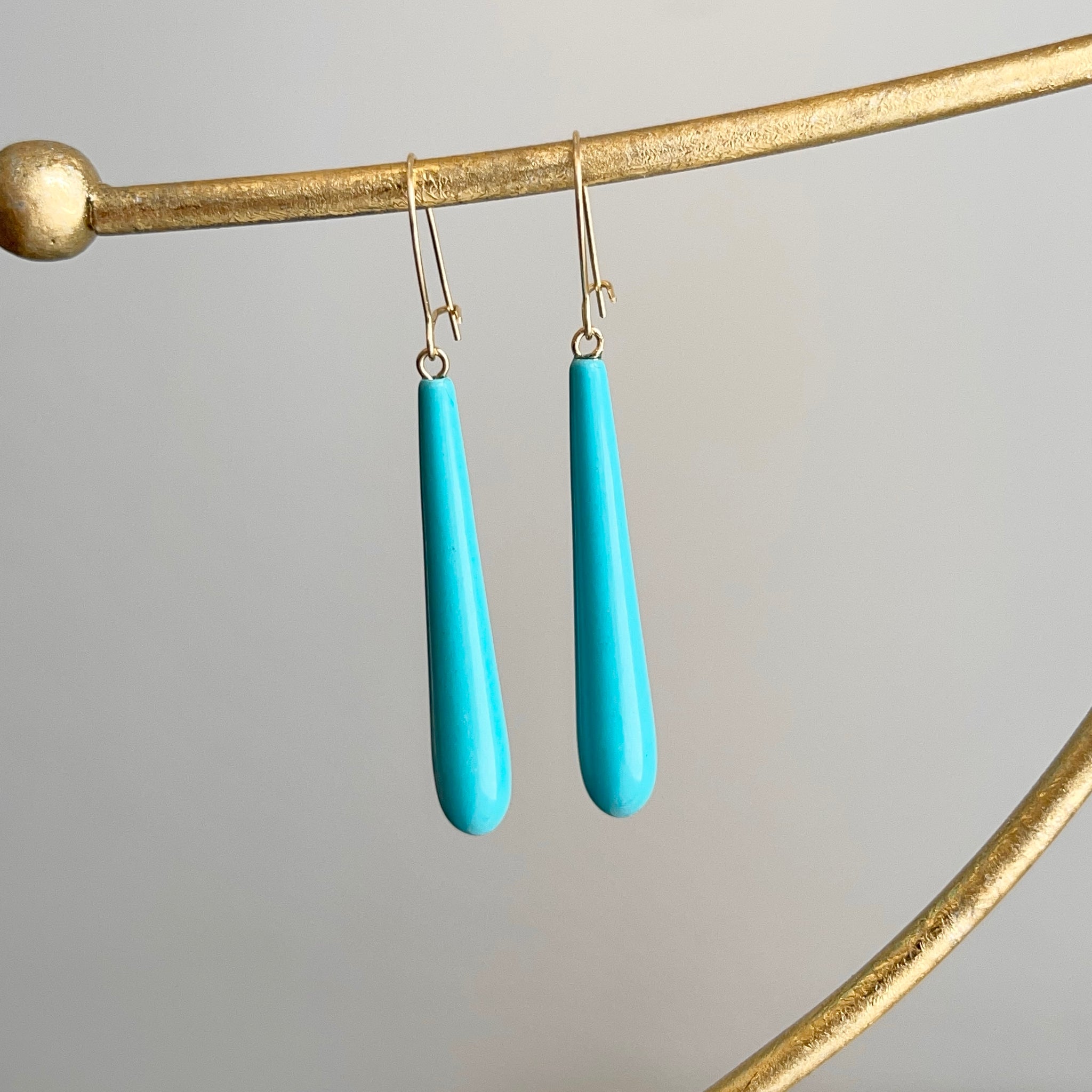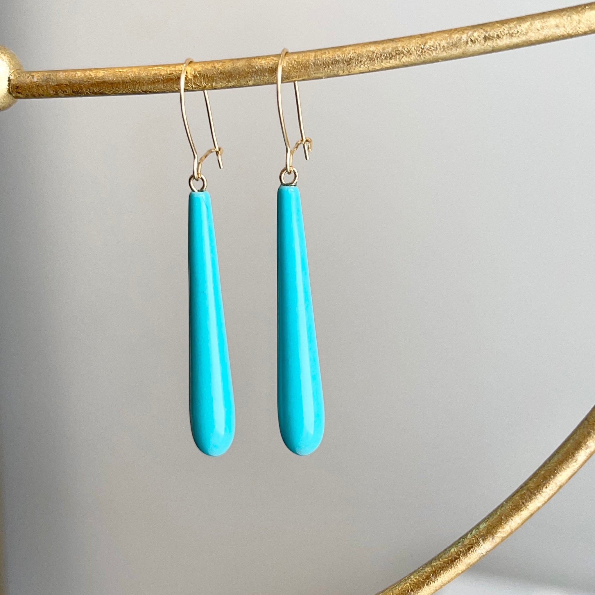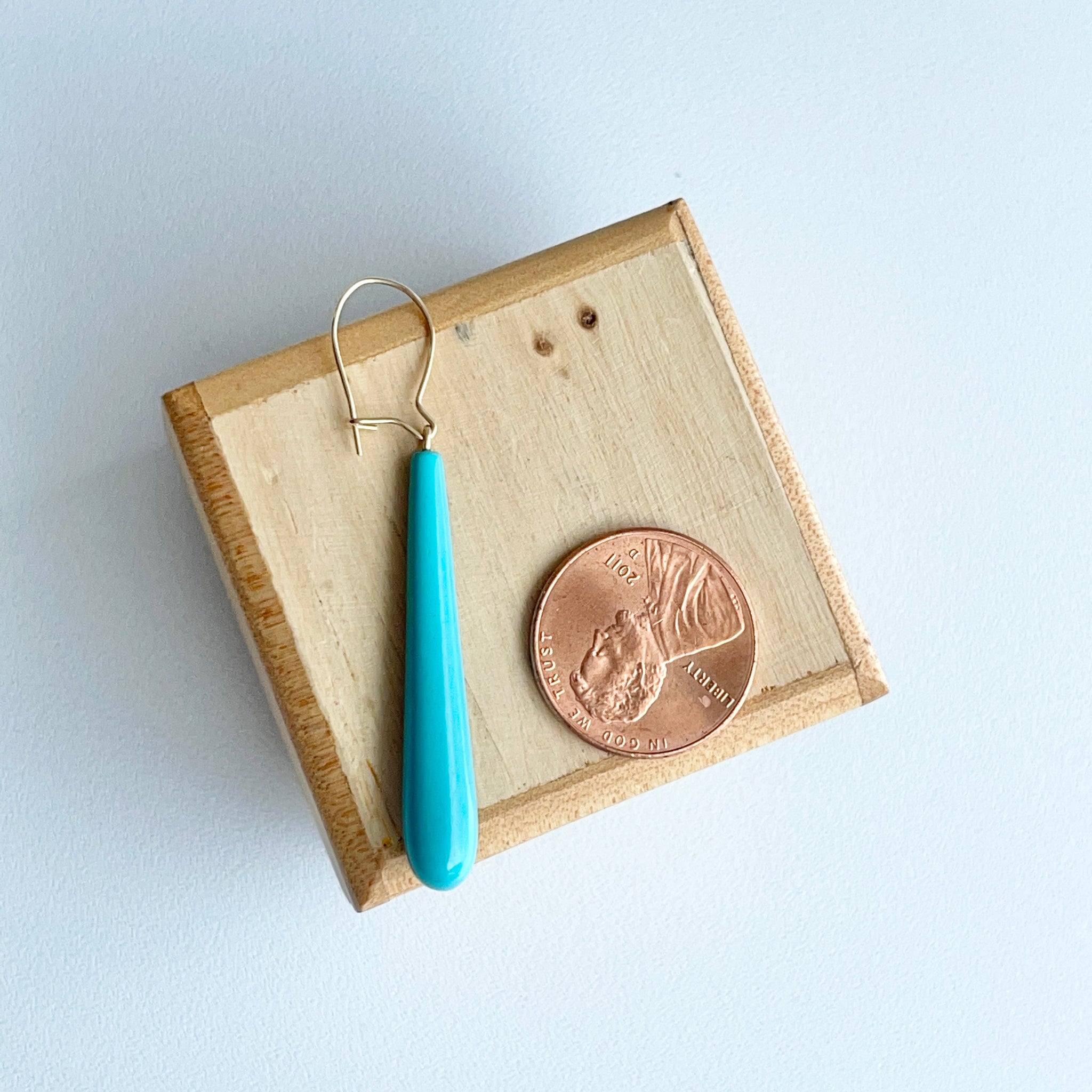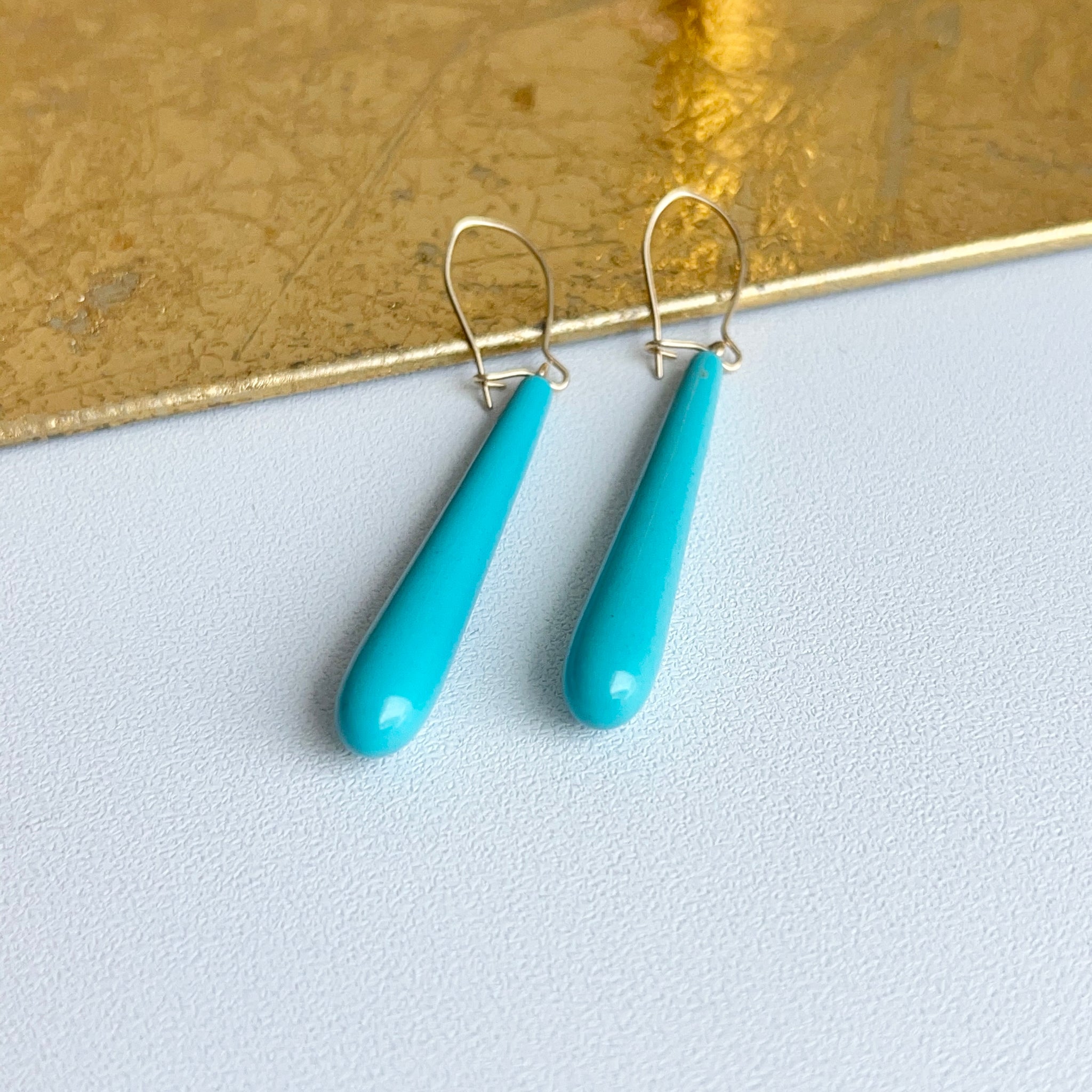 14KT yellow gold + genuine turquoise teardrop earrings. Charming, teardrop, polished turquoise, finished on all sides.