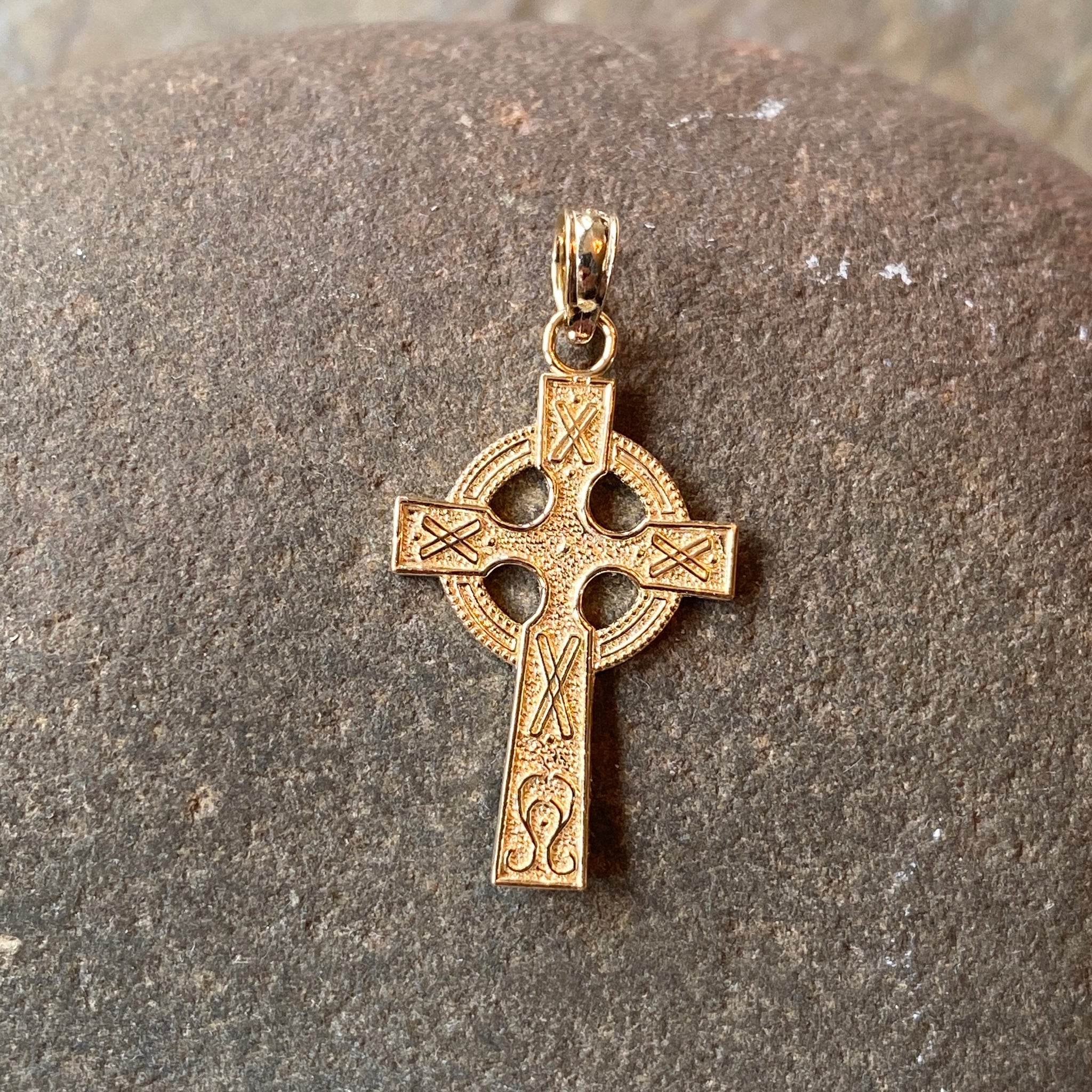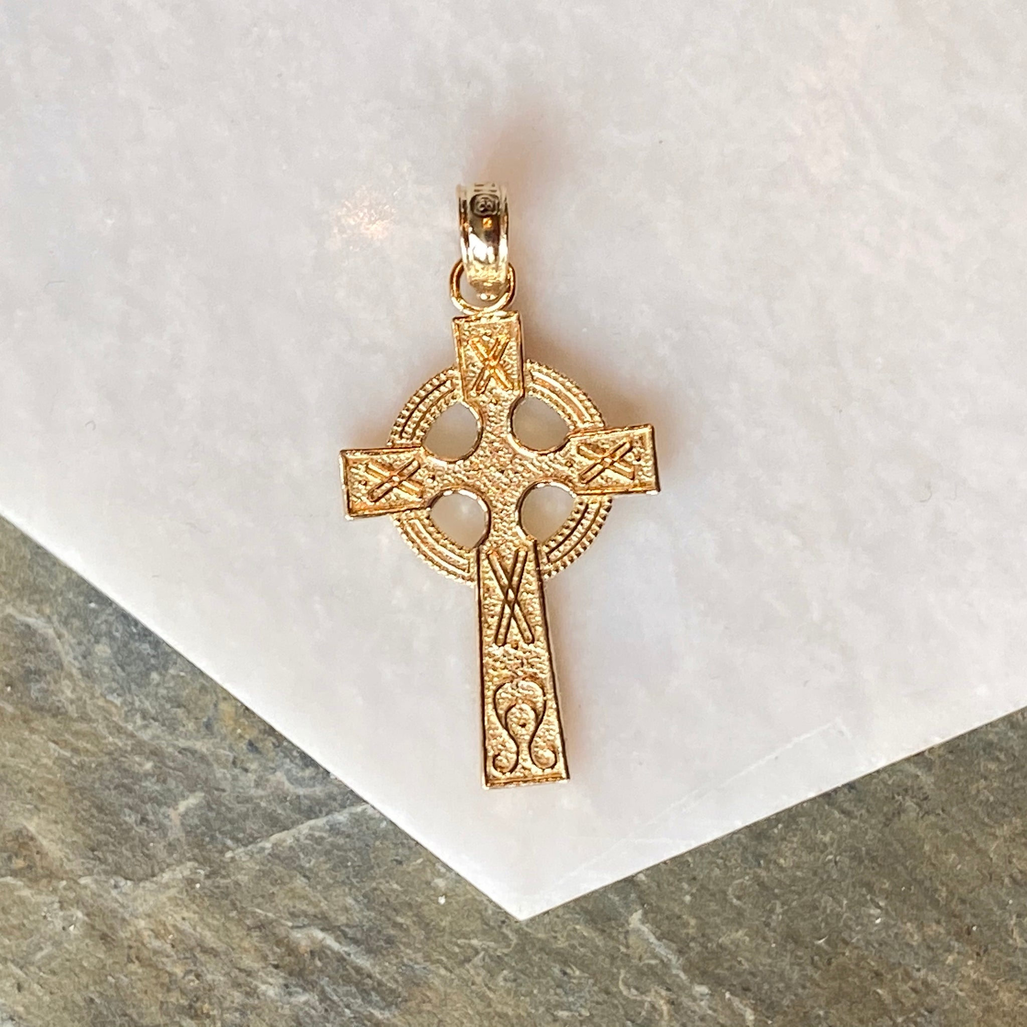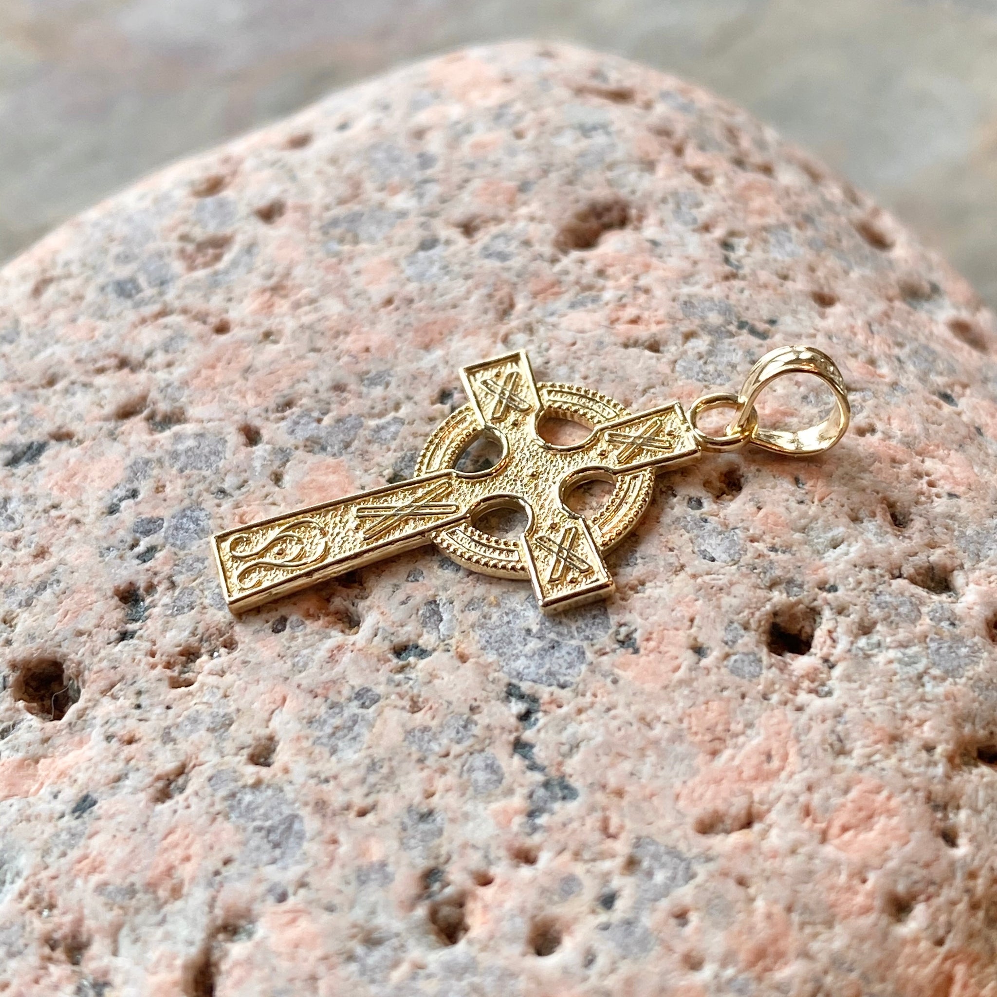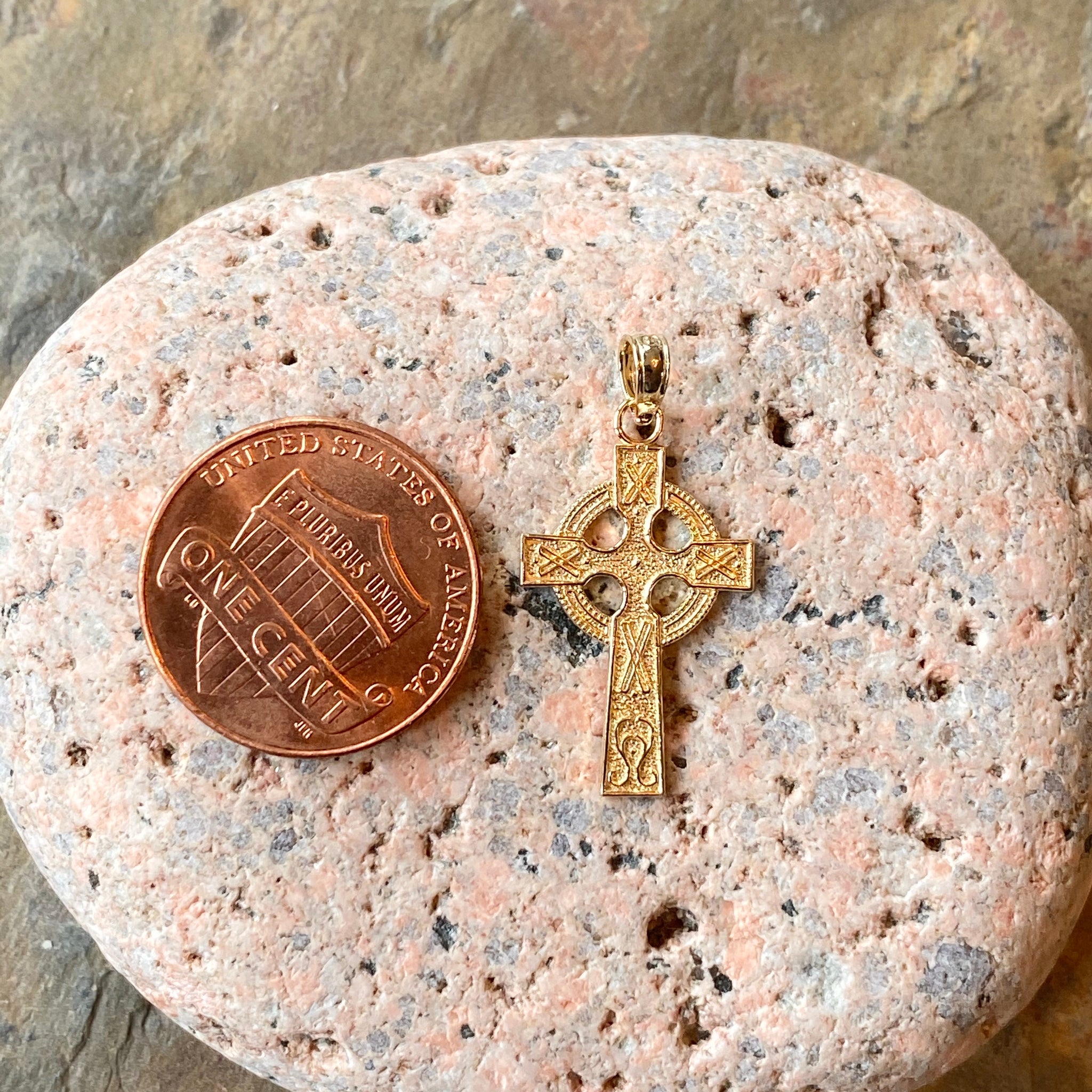 14KT yellow gold textured/detailed Celtic design cross pendant charm. A small reminder of your faith! Simply slide this small pendant charm on a thin gold chain. See our 14K yellow gold chains to pair with this. Chain shown in picture is sold separately.