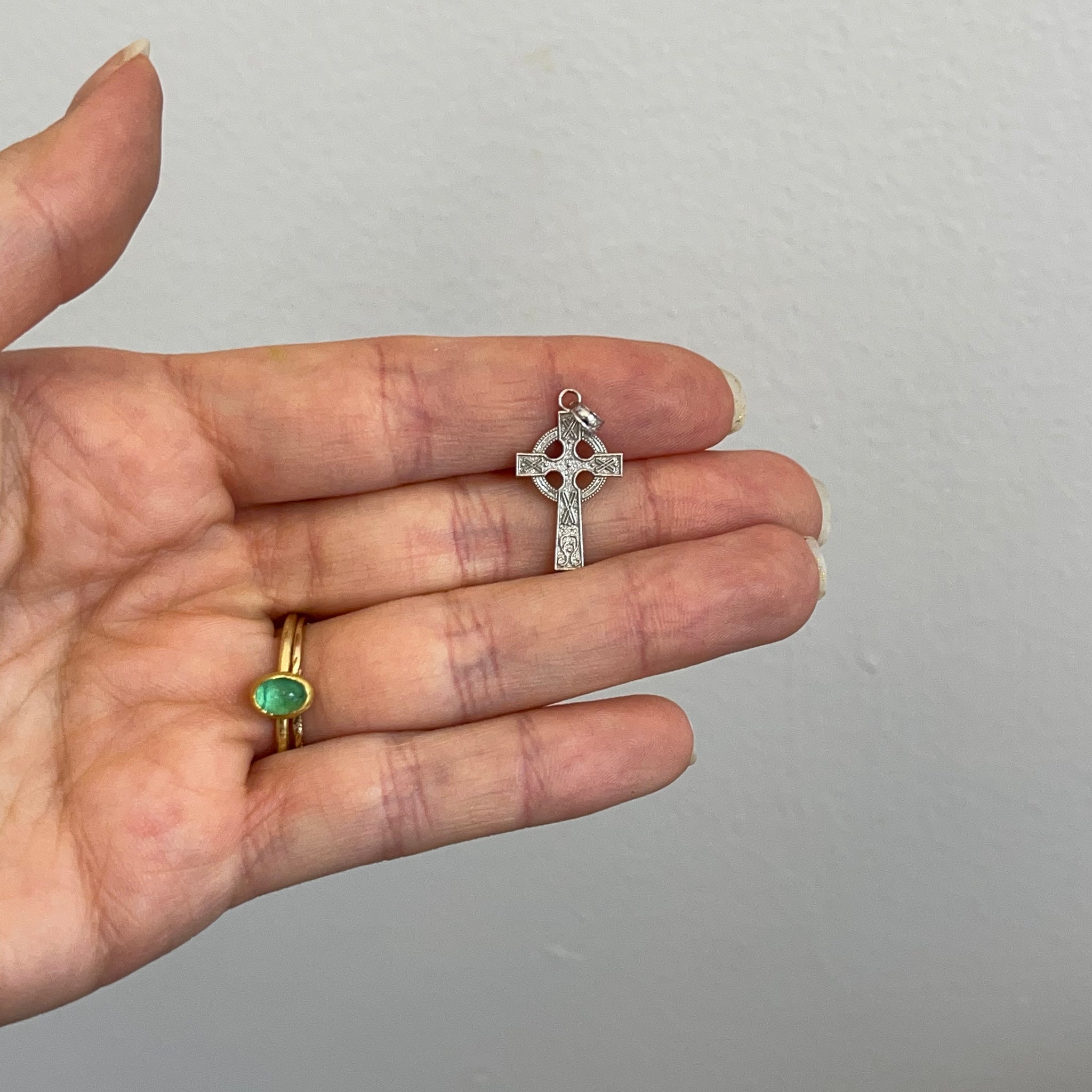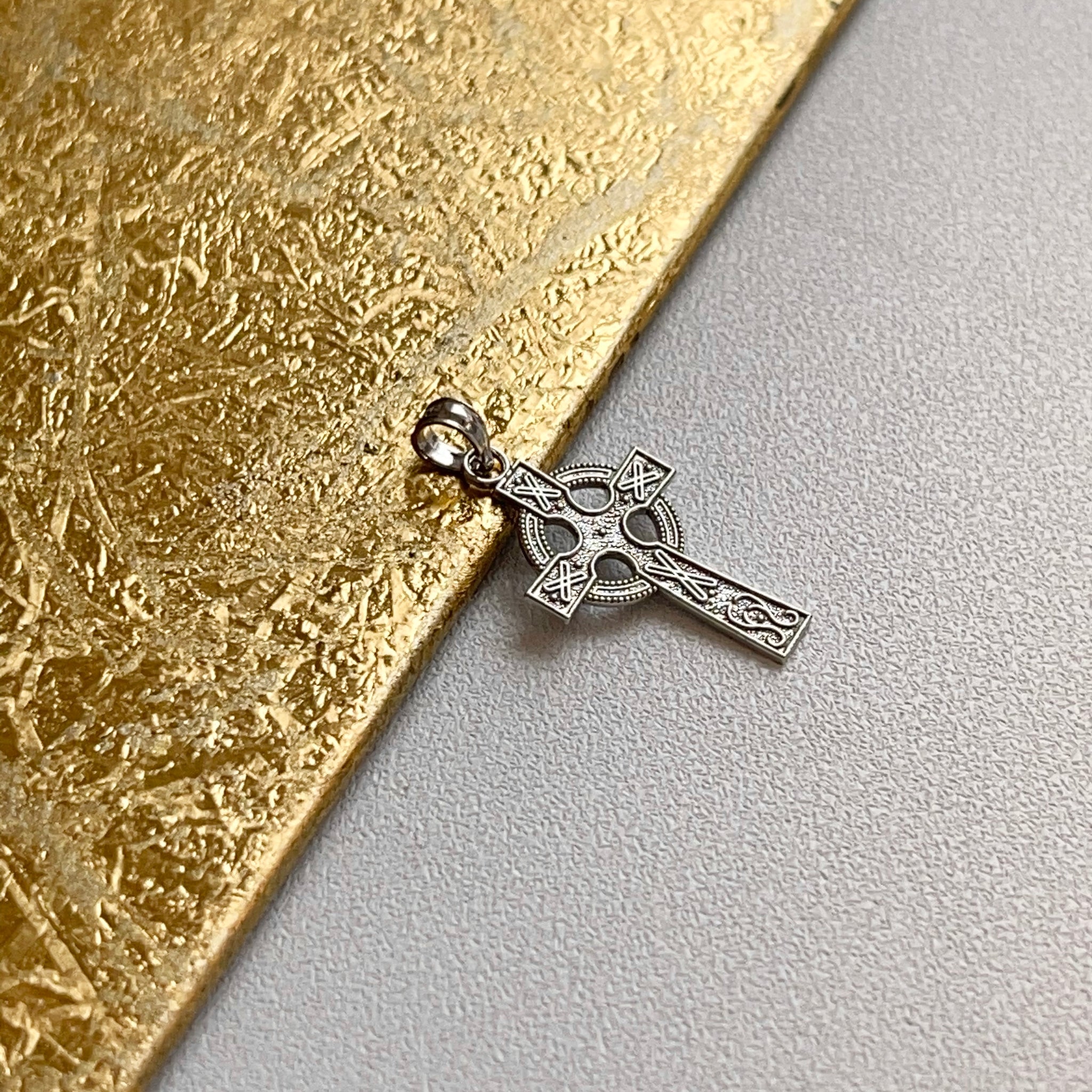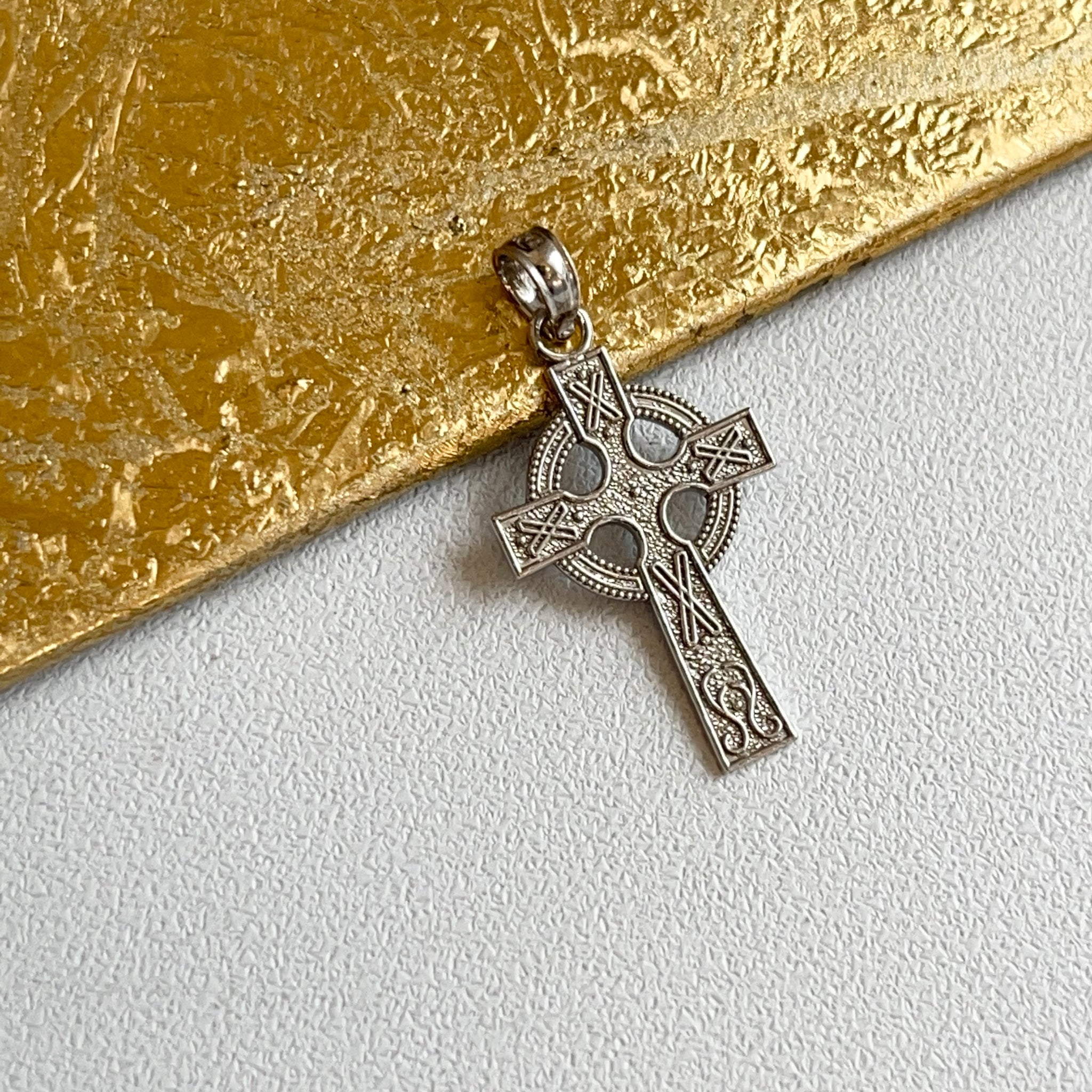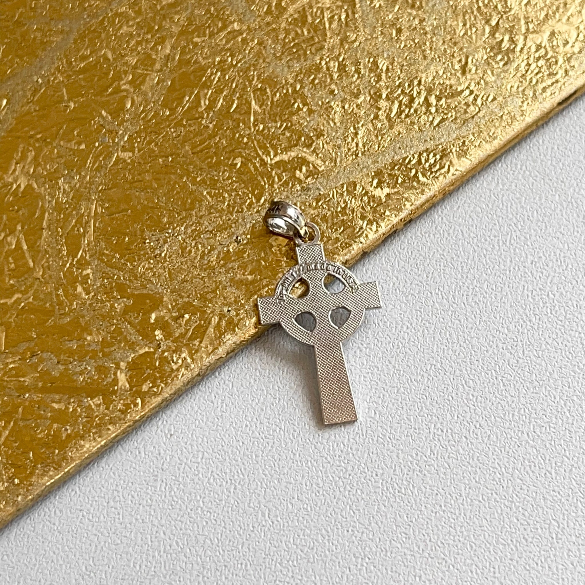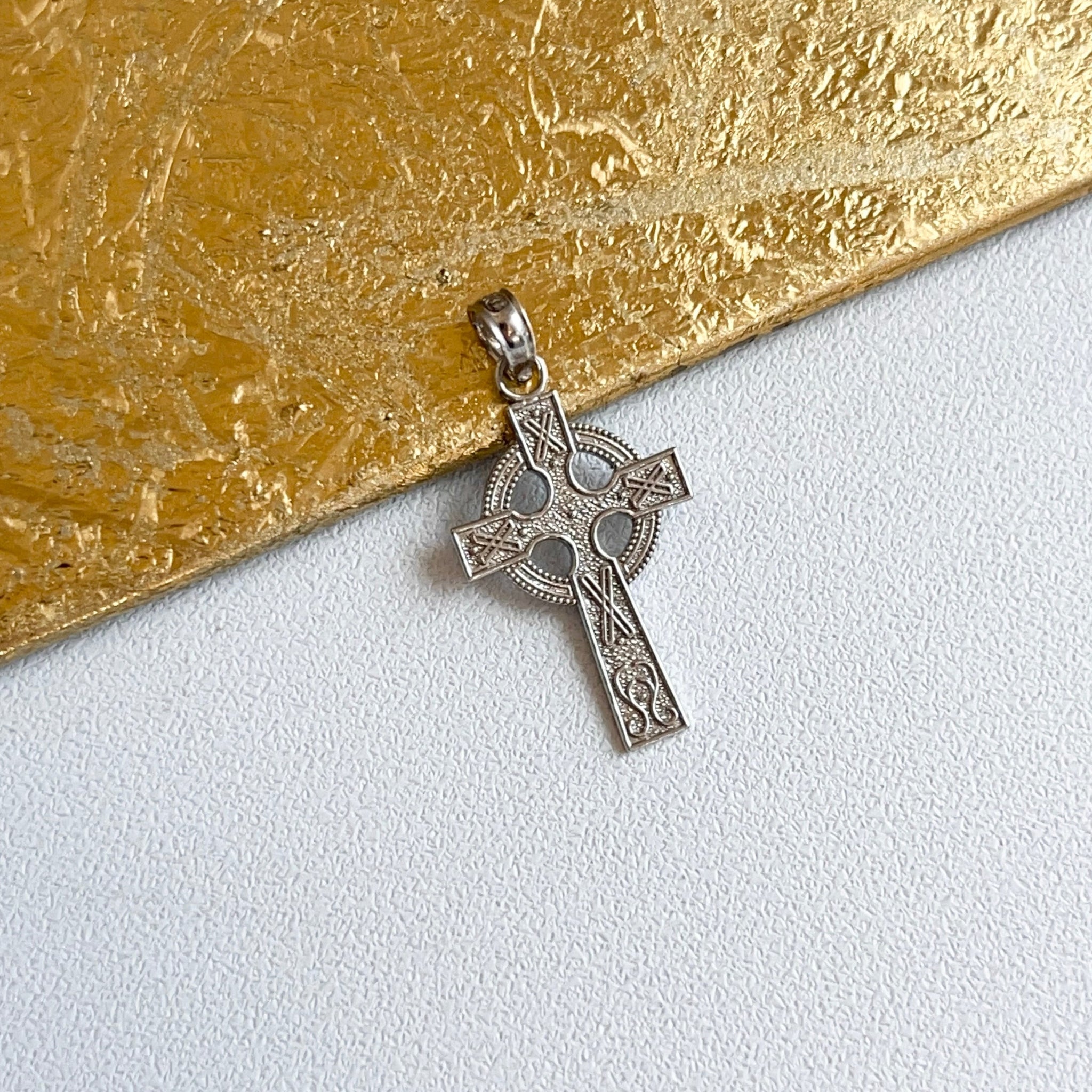 14KT white gold textured Celtic design cross with eternity circle pendant cross charm.