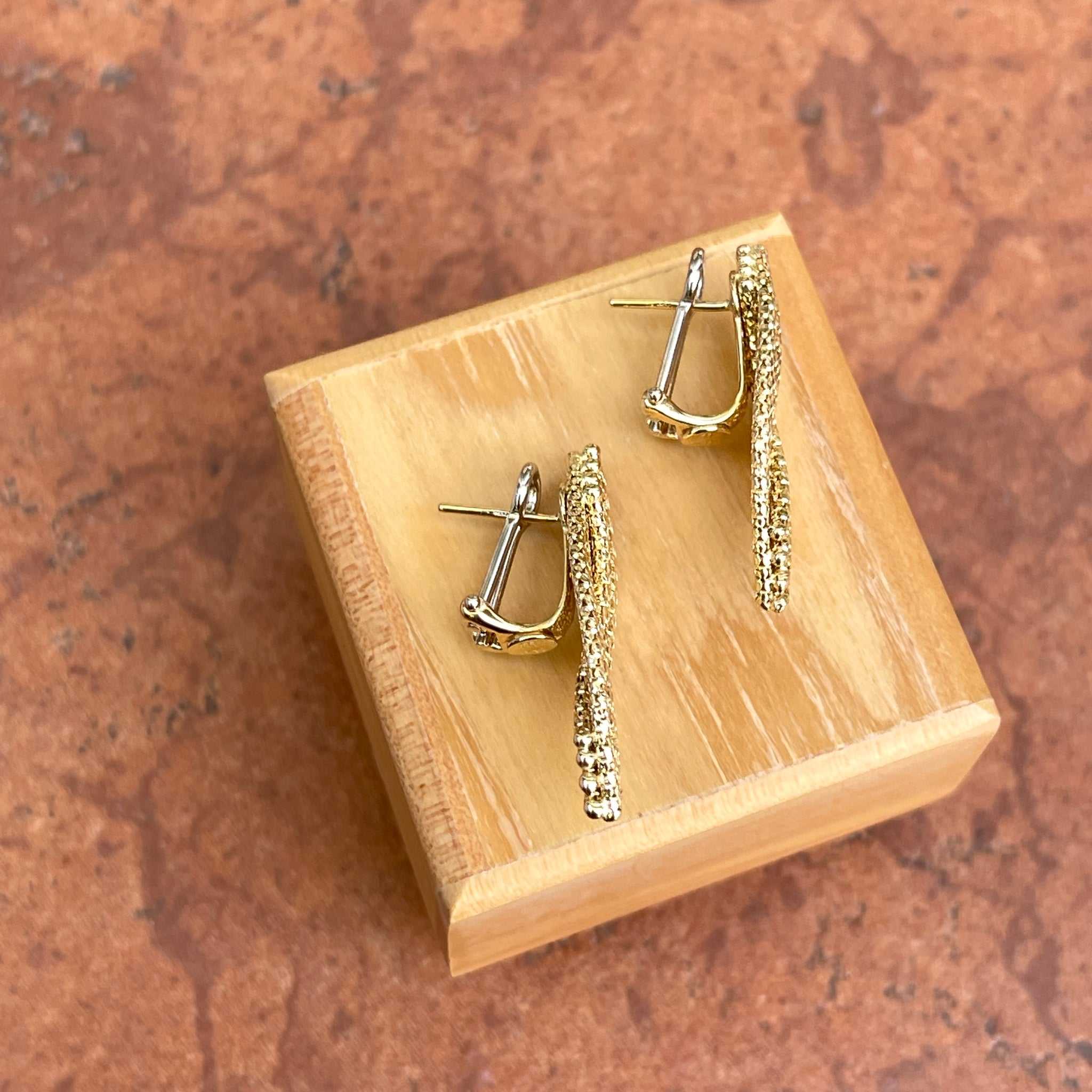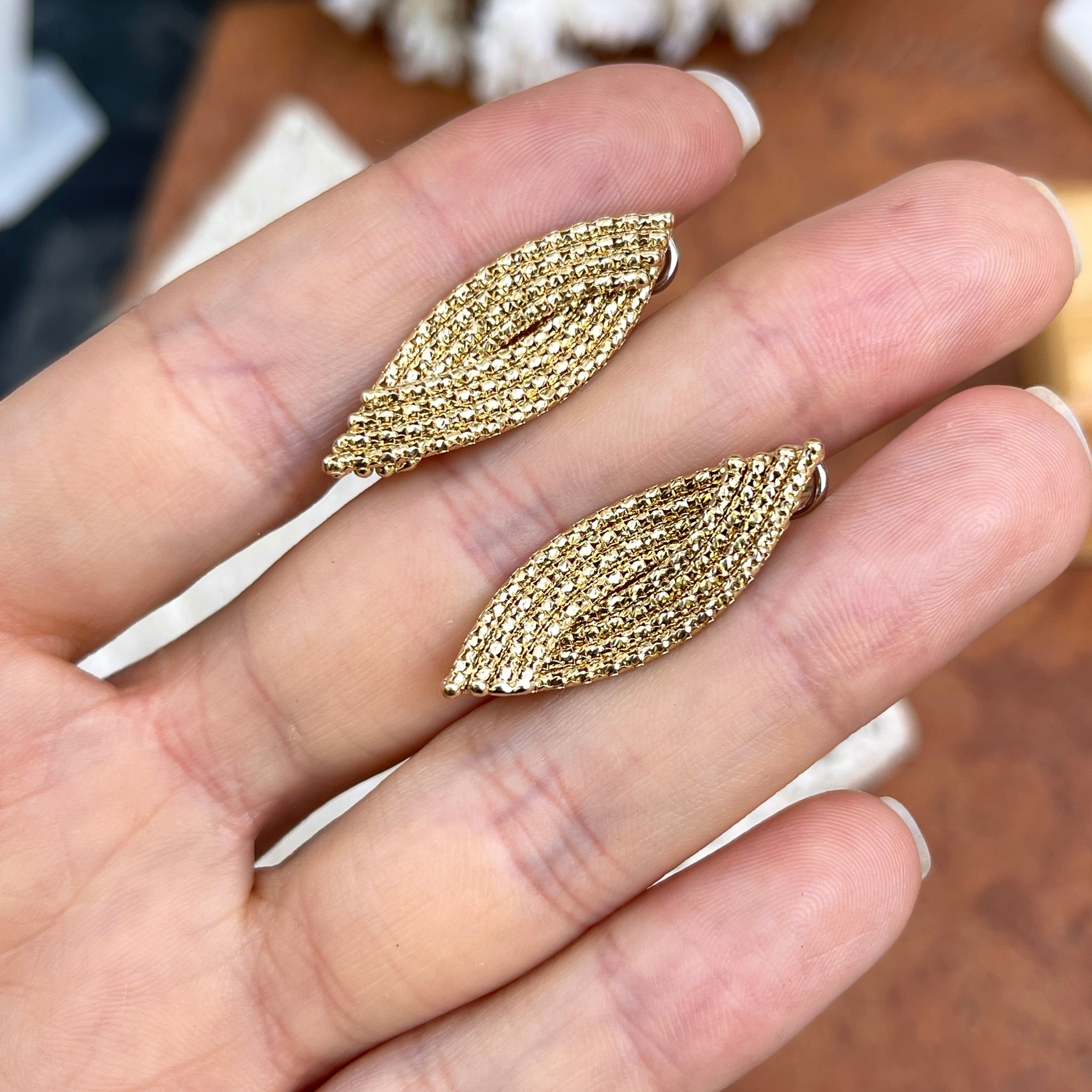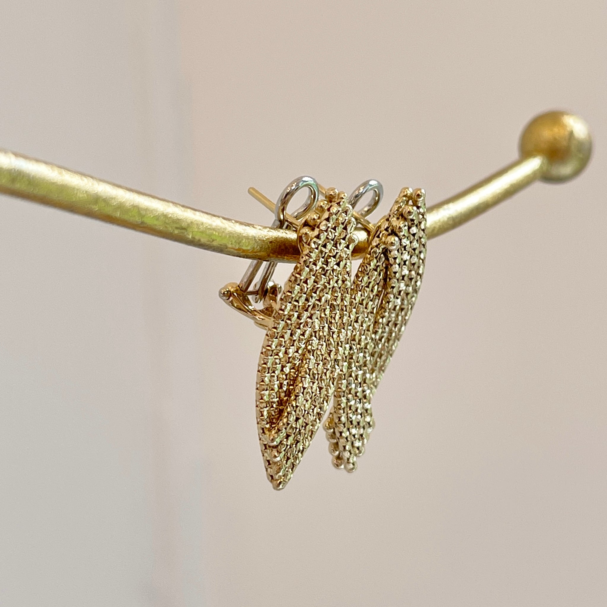 14KT yellow gold shiny-finish + textured, weave/ woven design dangle earrings with omega clip backs. Omega clip backs allow for easily adding on earring charms!