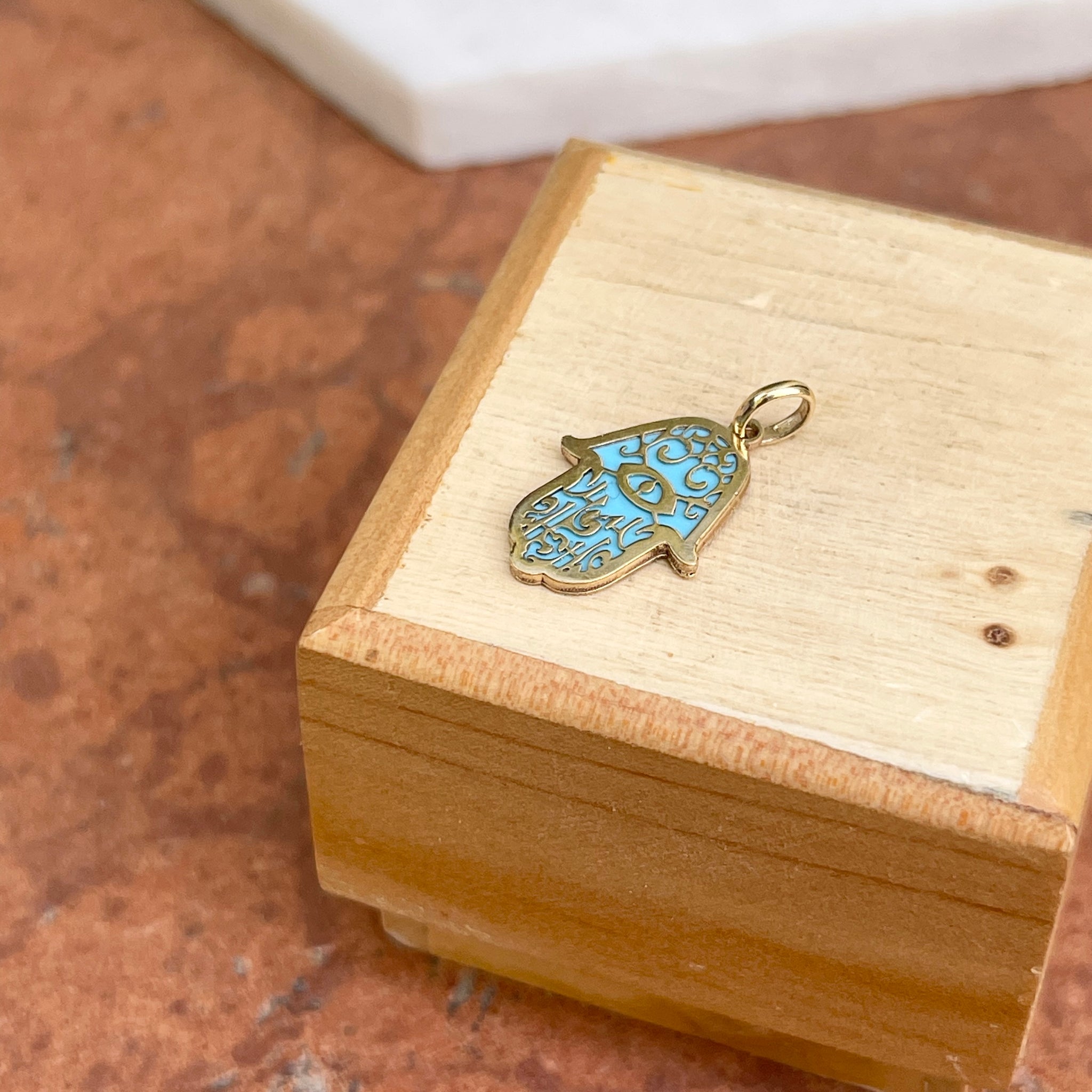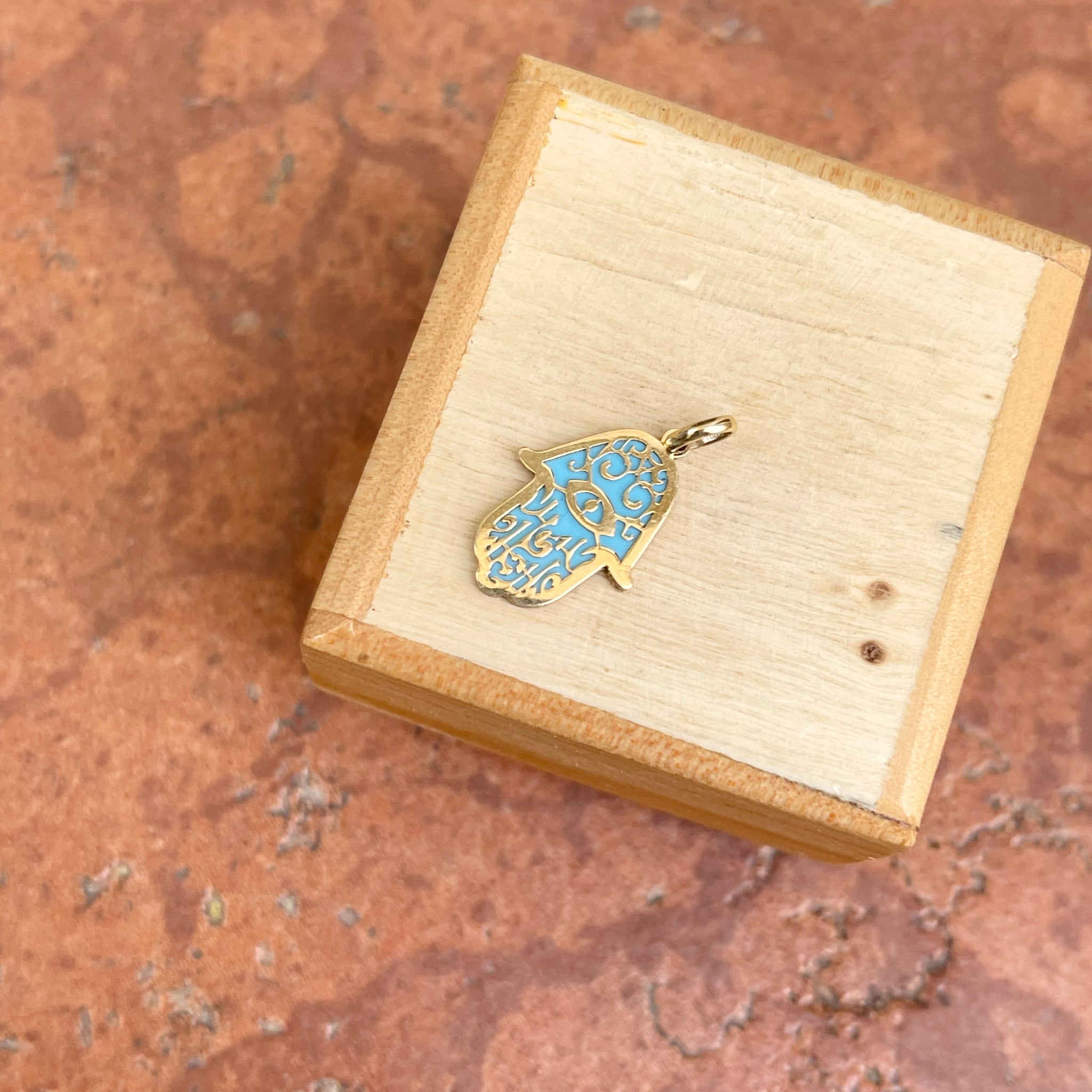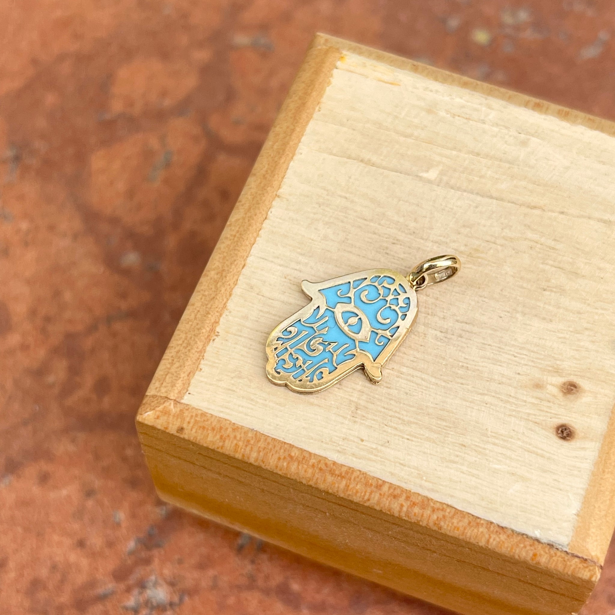 14KT yellow gold filigree Kabbalah "Hand of God"/ "Hand of Fatima" hamsa Chamseh pendant charm with turquoise inlayed. The Hamsa Hand is a universal sign of protection, power, + strength. Wearing the Hamsa hand is said to protect you against evil and negative energies!