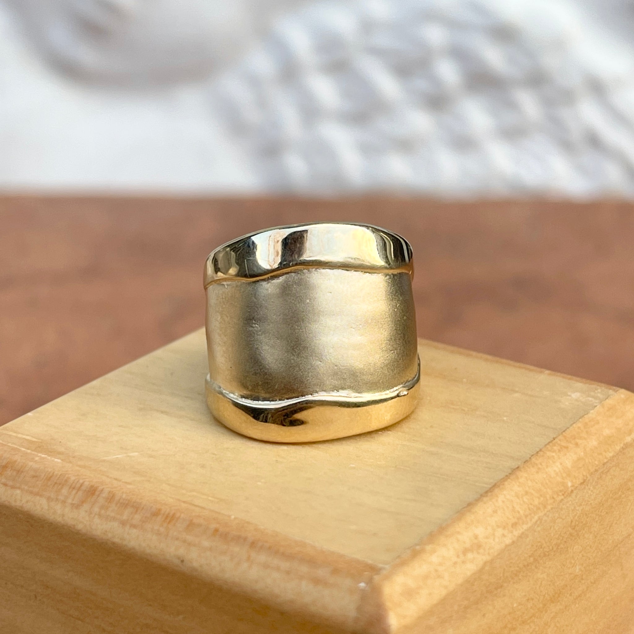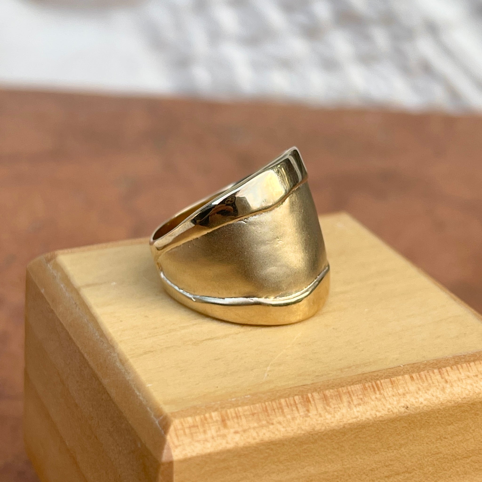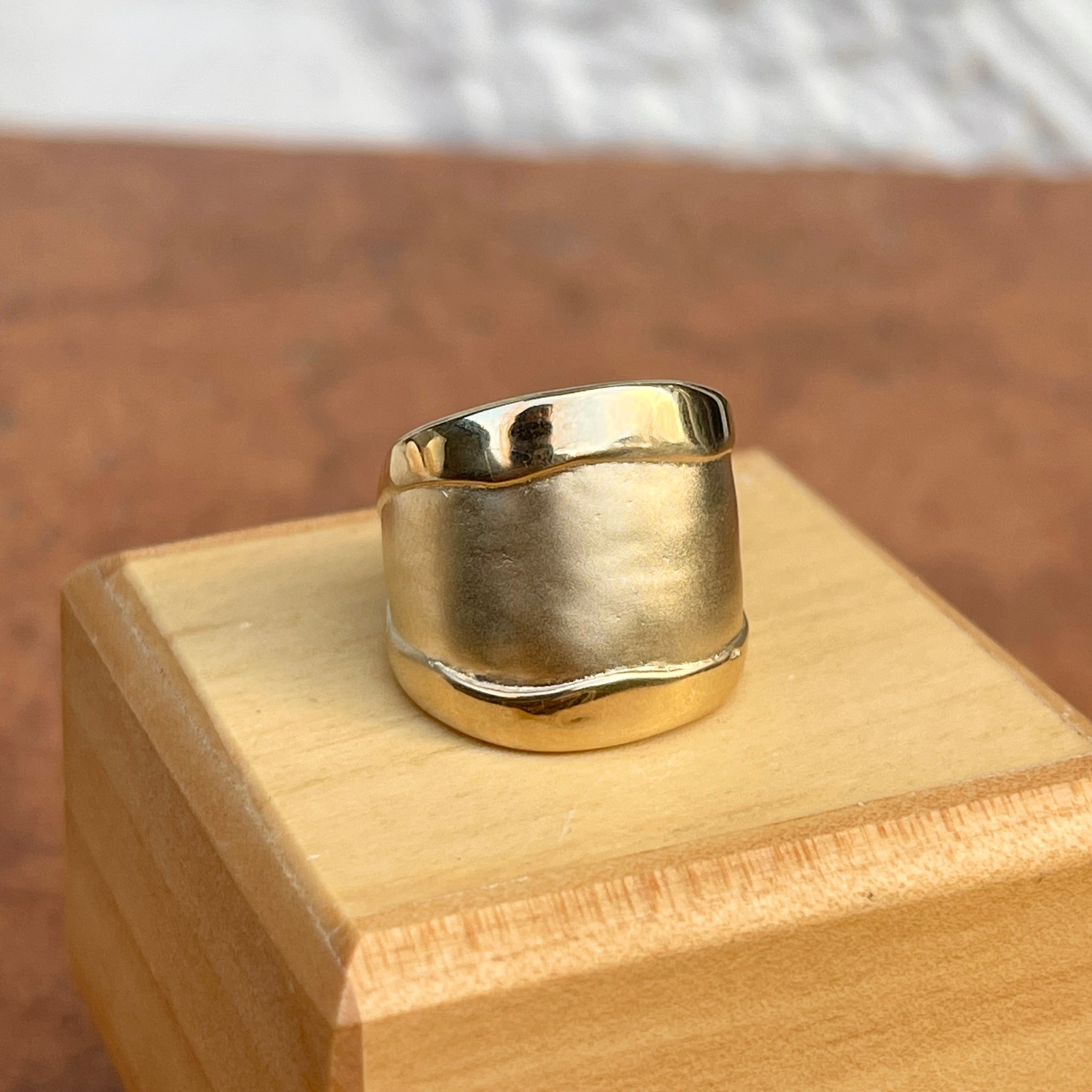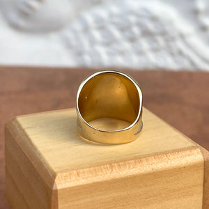 Custom designed 14KT yellow gold wide cigar band artistic matte + shiny ring. Really beautiful, chunky statement ring with contrasting shiny + matte/satin finishing. Ring tends to run small/snug.