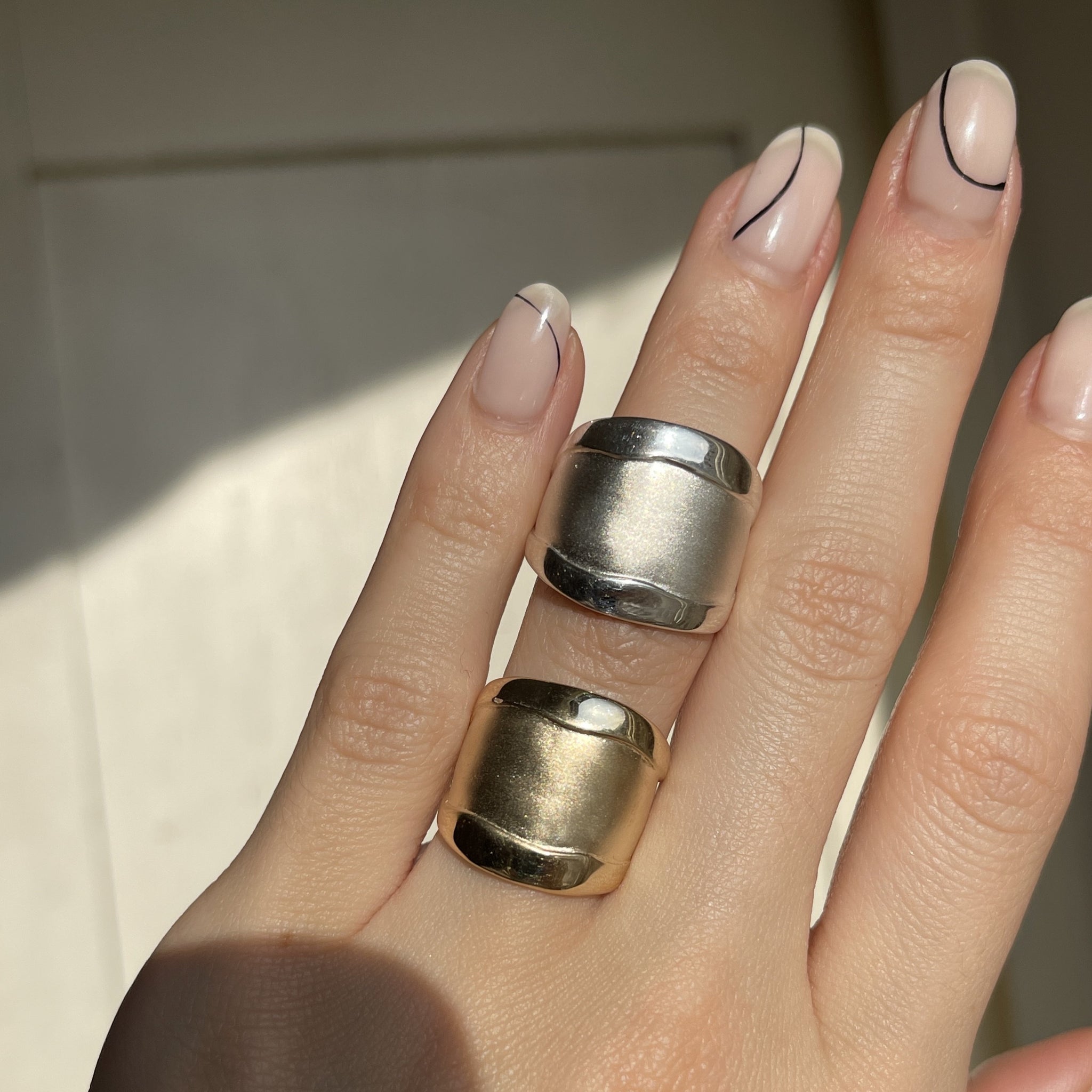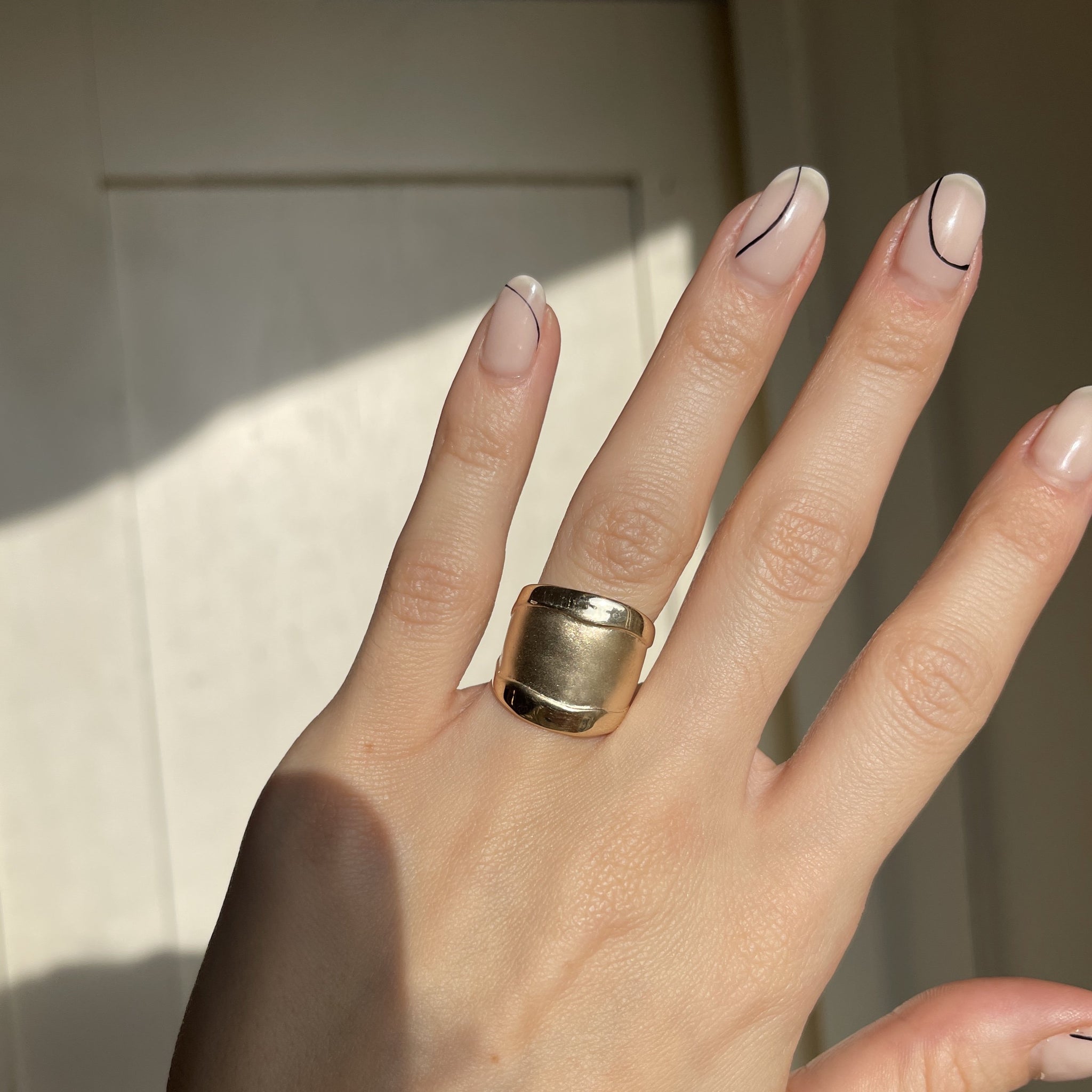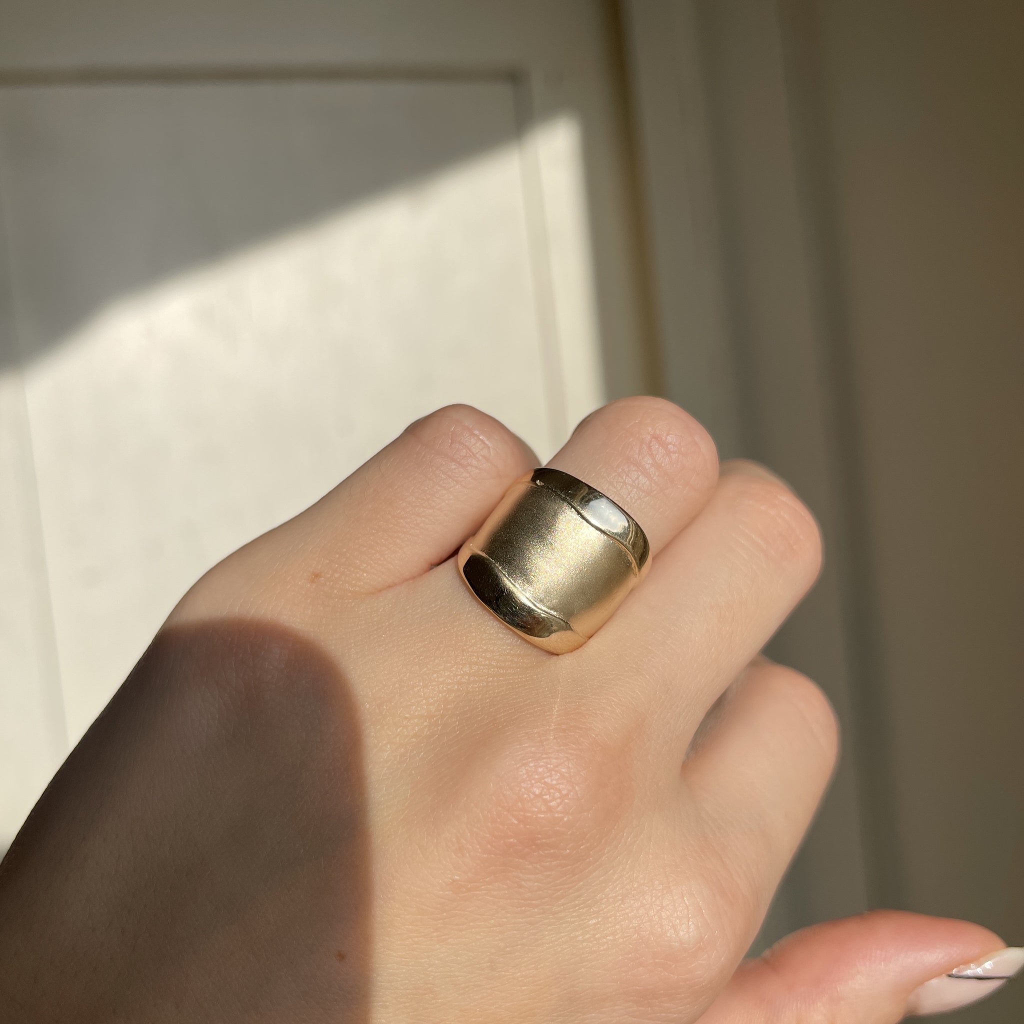 Custom designed 14KT yellow gold wide cigar band artistic matte + shiny ring. Really beautiful, chunky statement ring with contrasting shiny + matte/satin finishing. Ring tends to run small/snug.