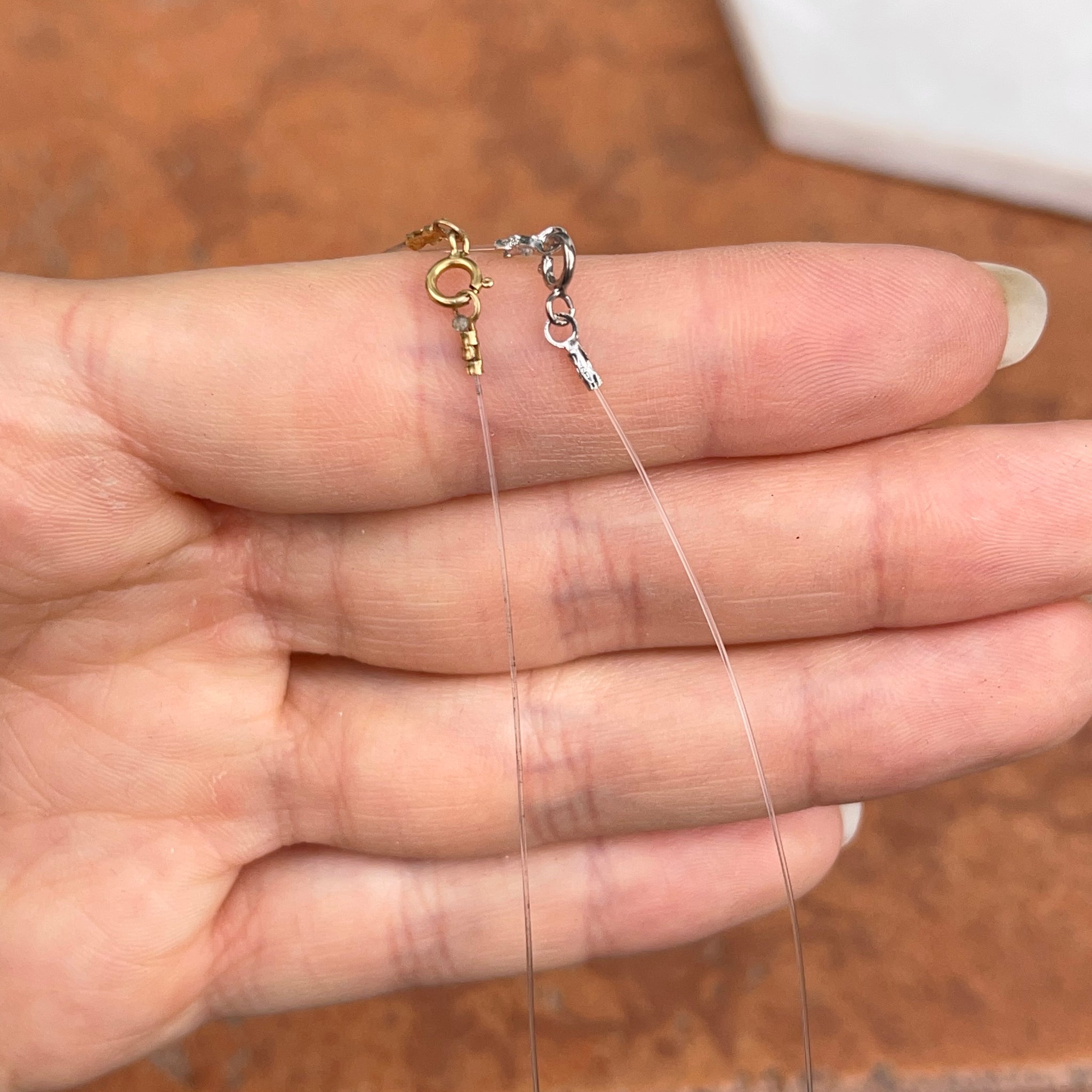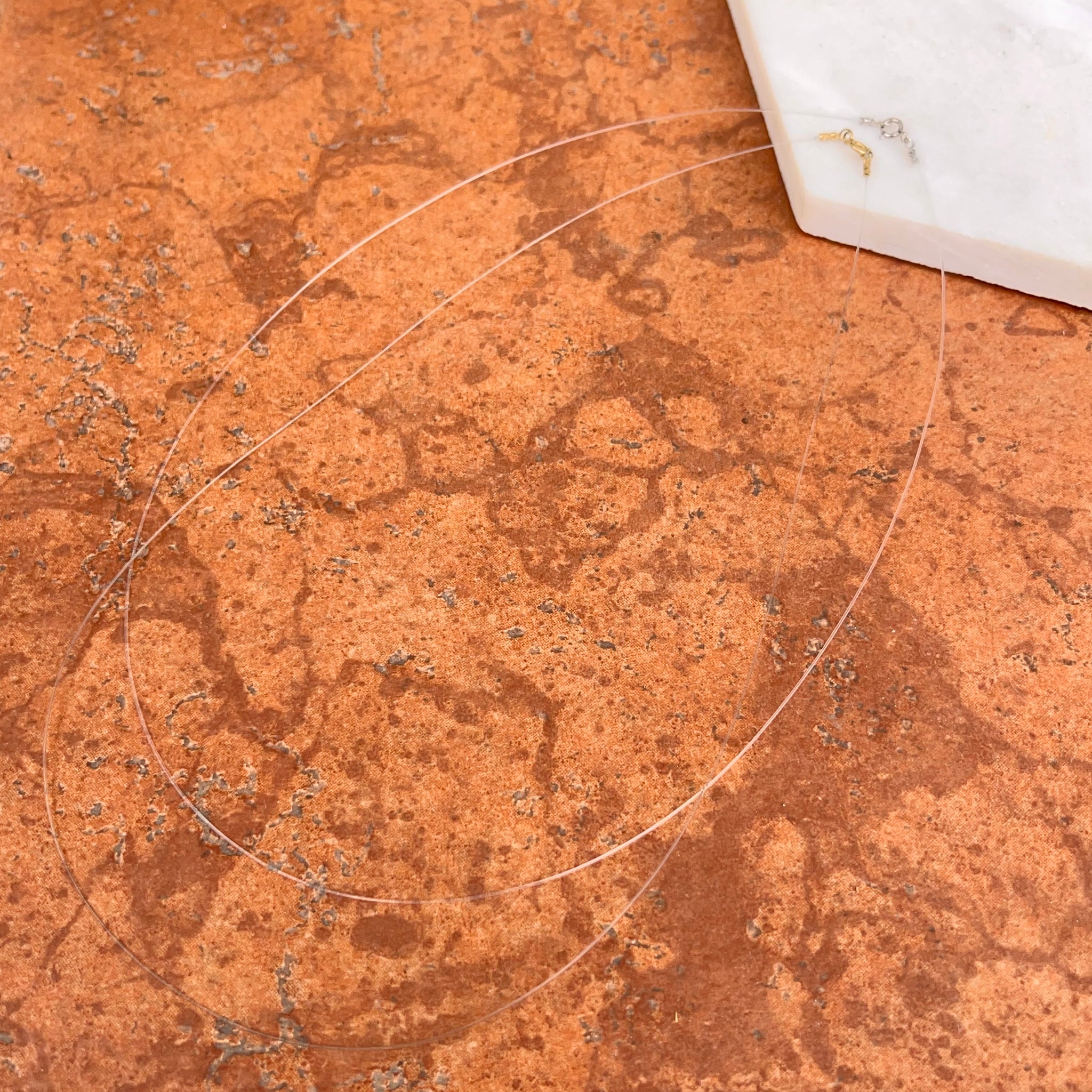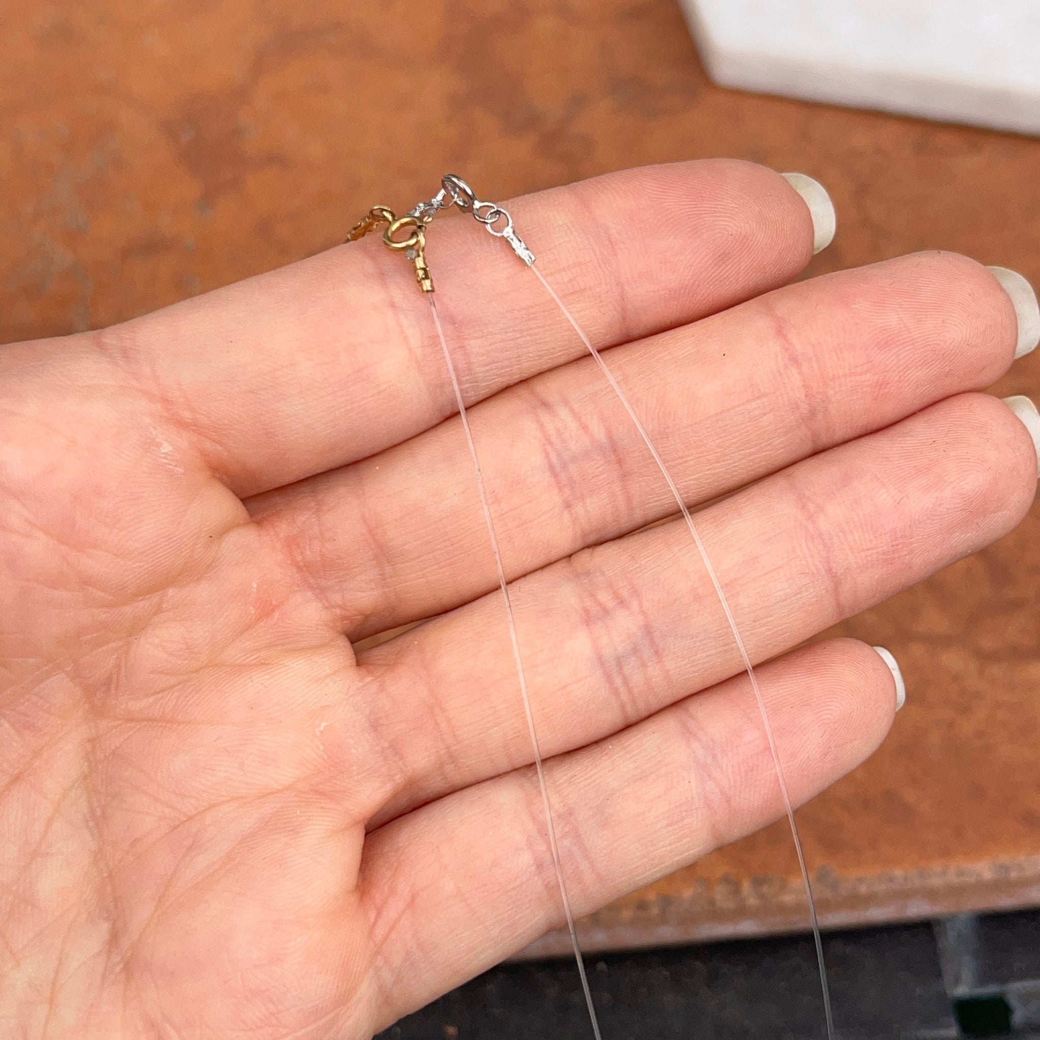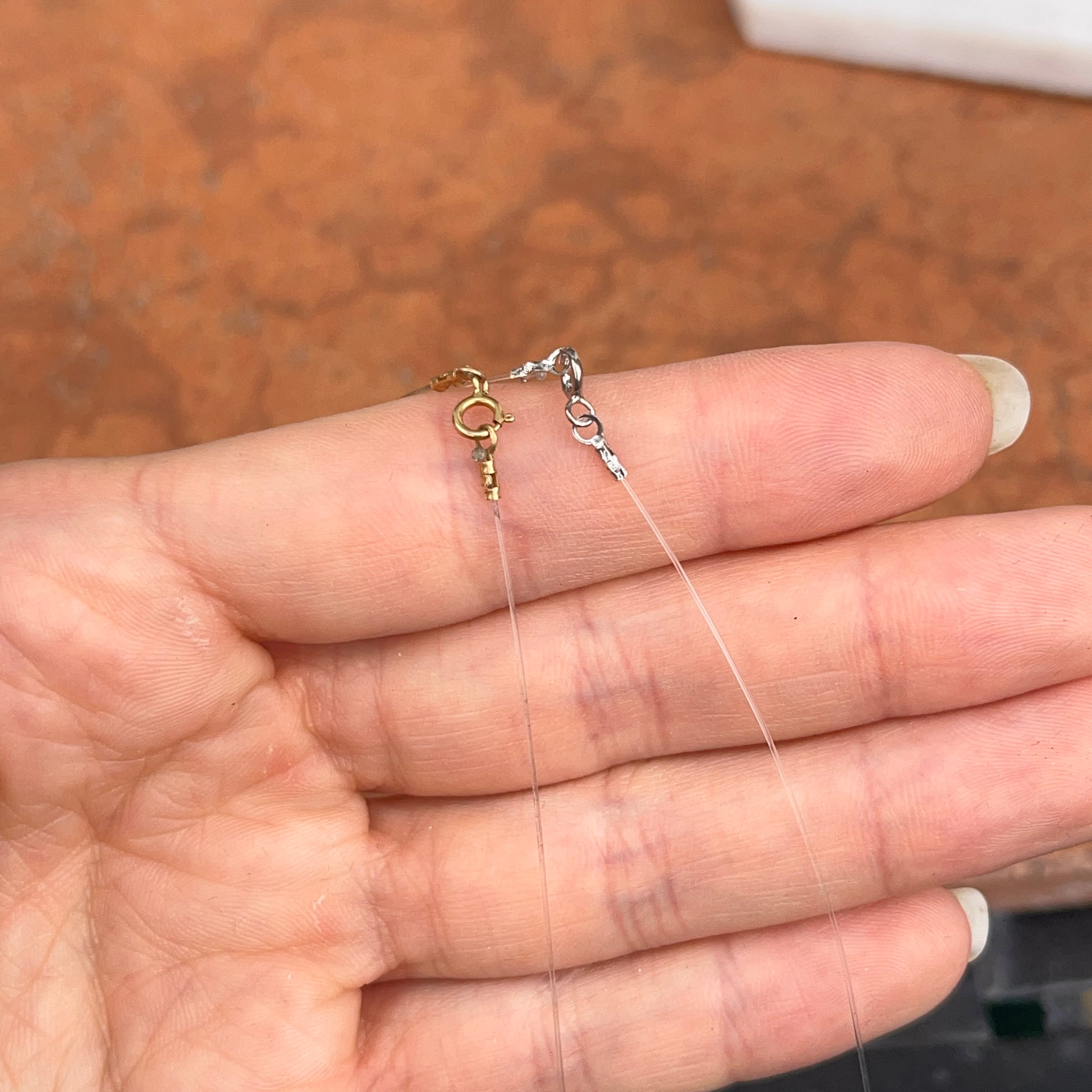 14KT gold + single strand nylon fish wire clear necklace. Choose from either a 14k yellow gold or white gold clasp. Gives a pendant the illusion that it is floating on your neck!