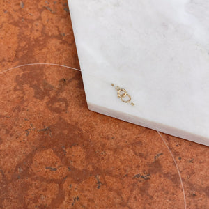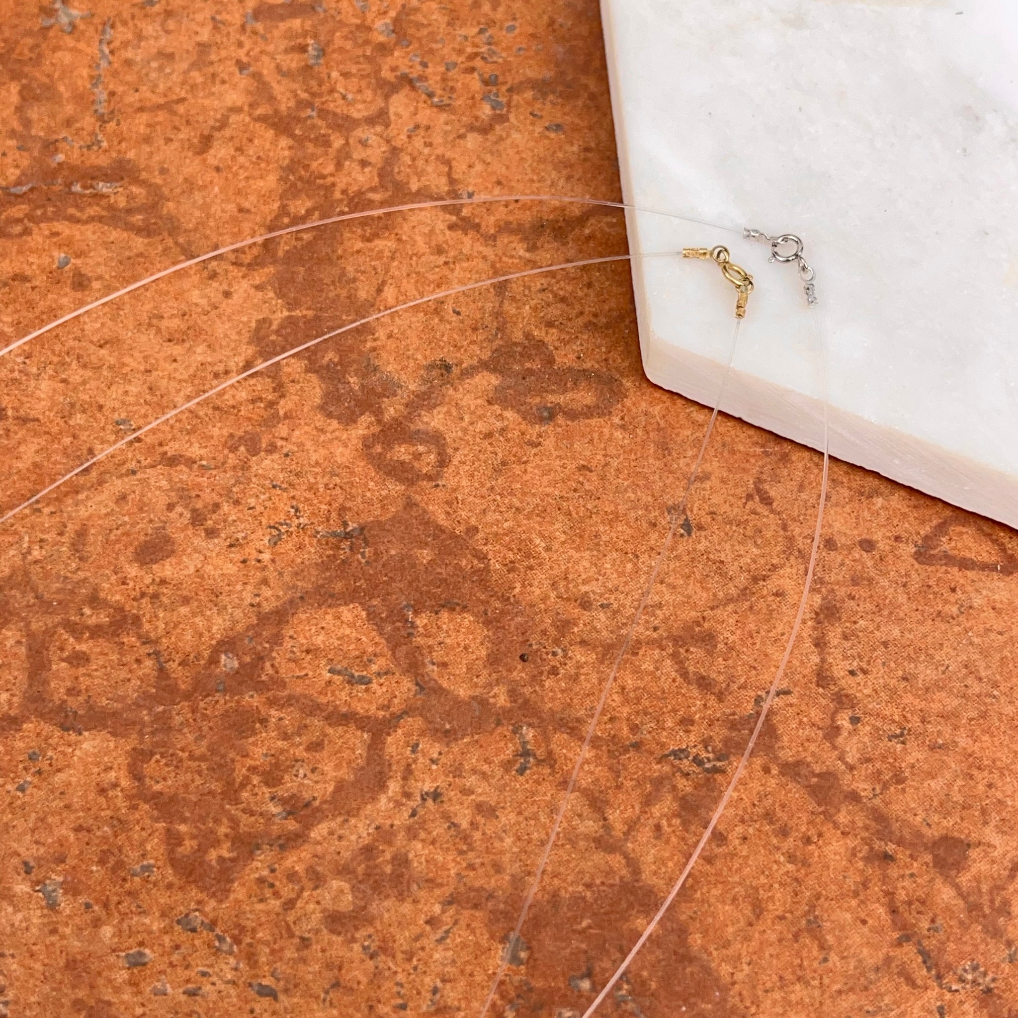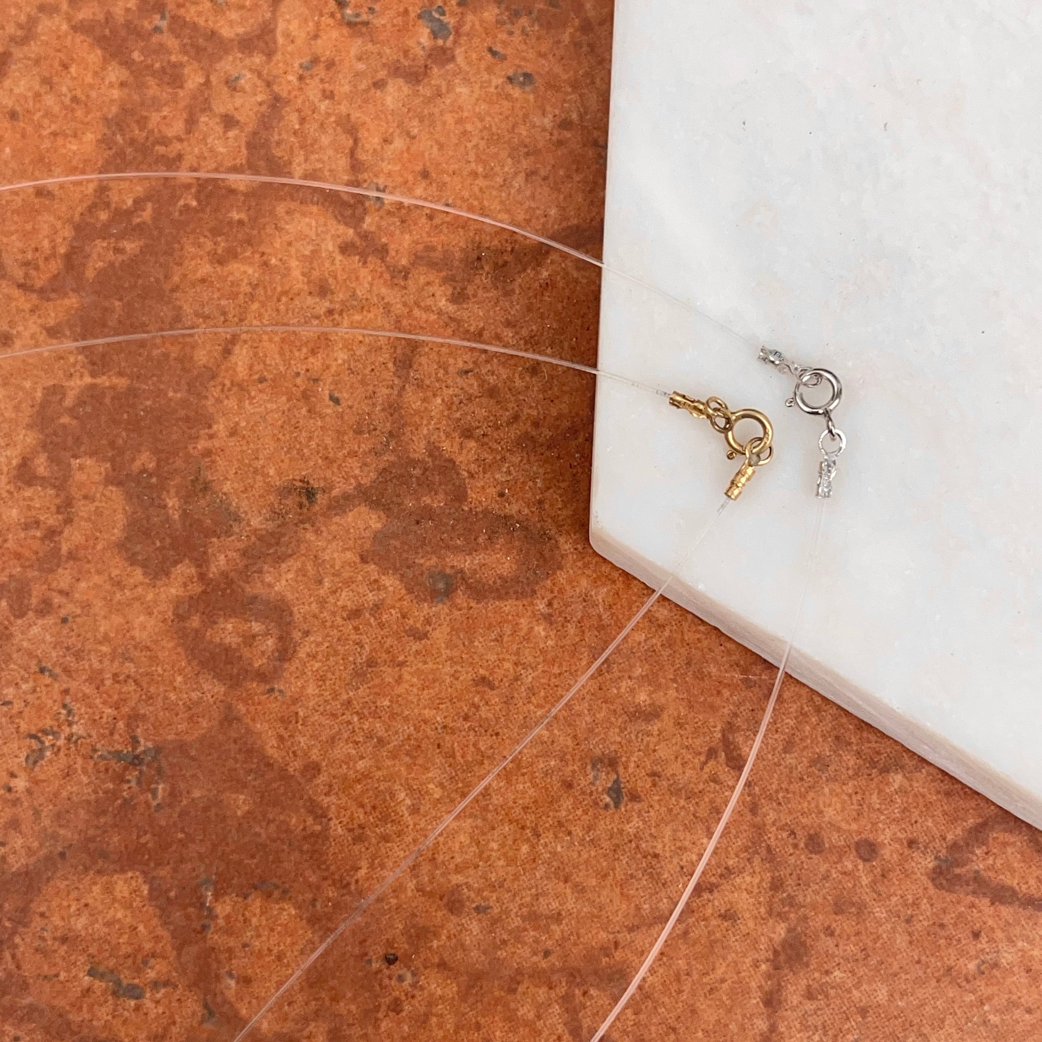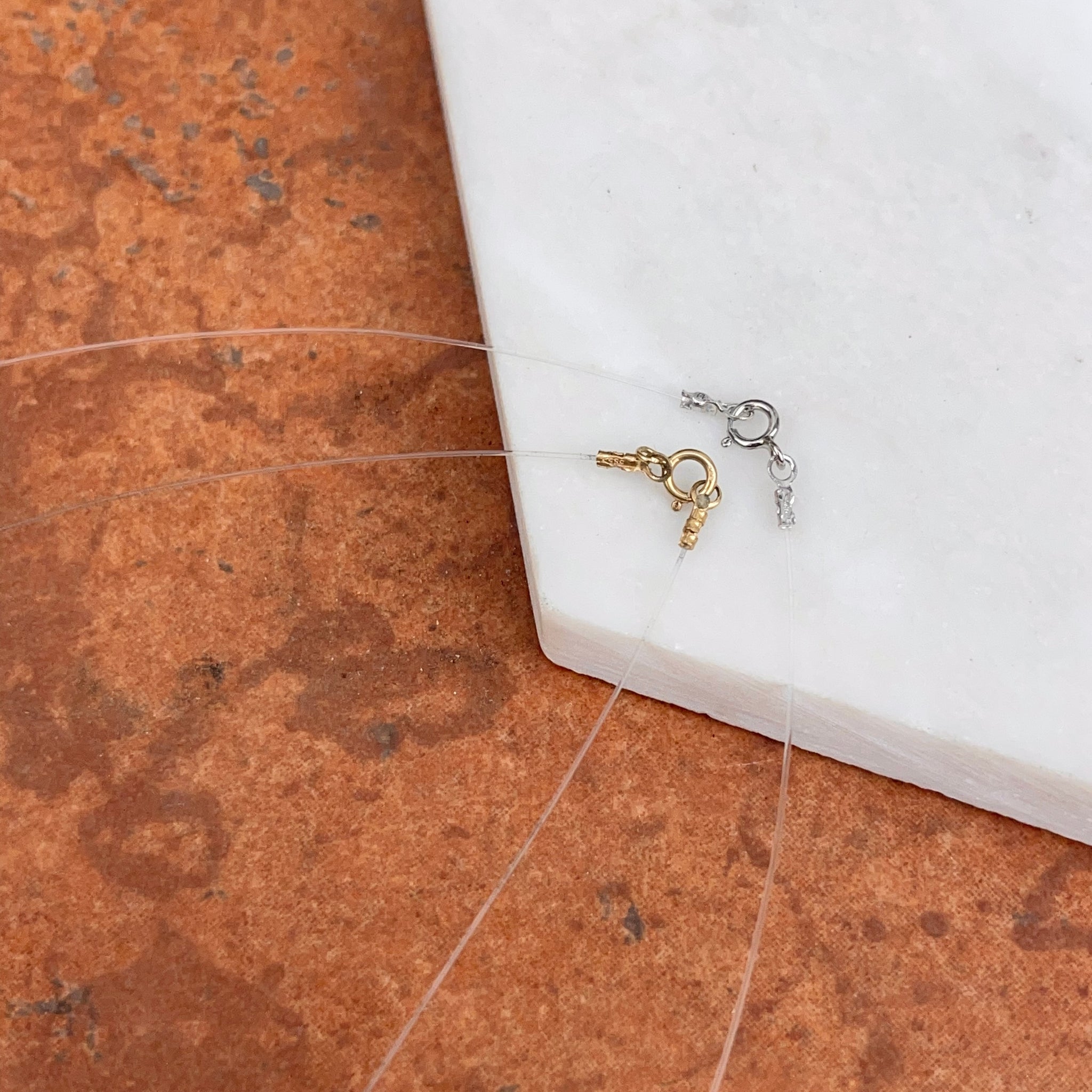14KT gold + single strand nylon fish wire clear necklace. Choose from either a 14k yellow gold or white gold clasp. Gives a pendant the illusion that it is floating on your neck!