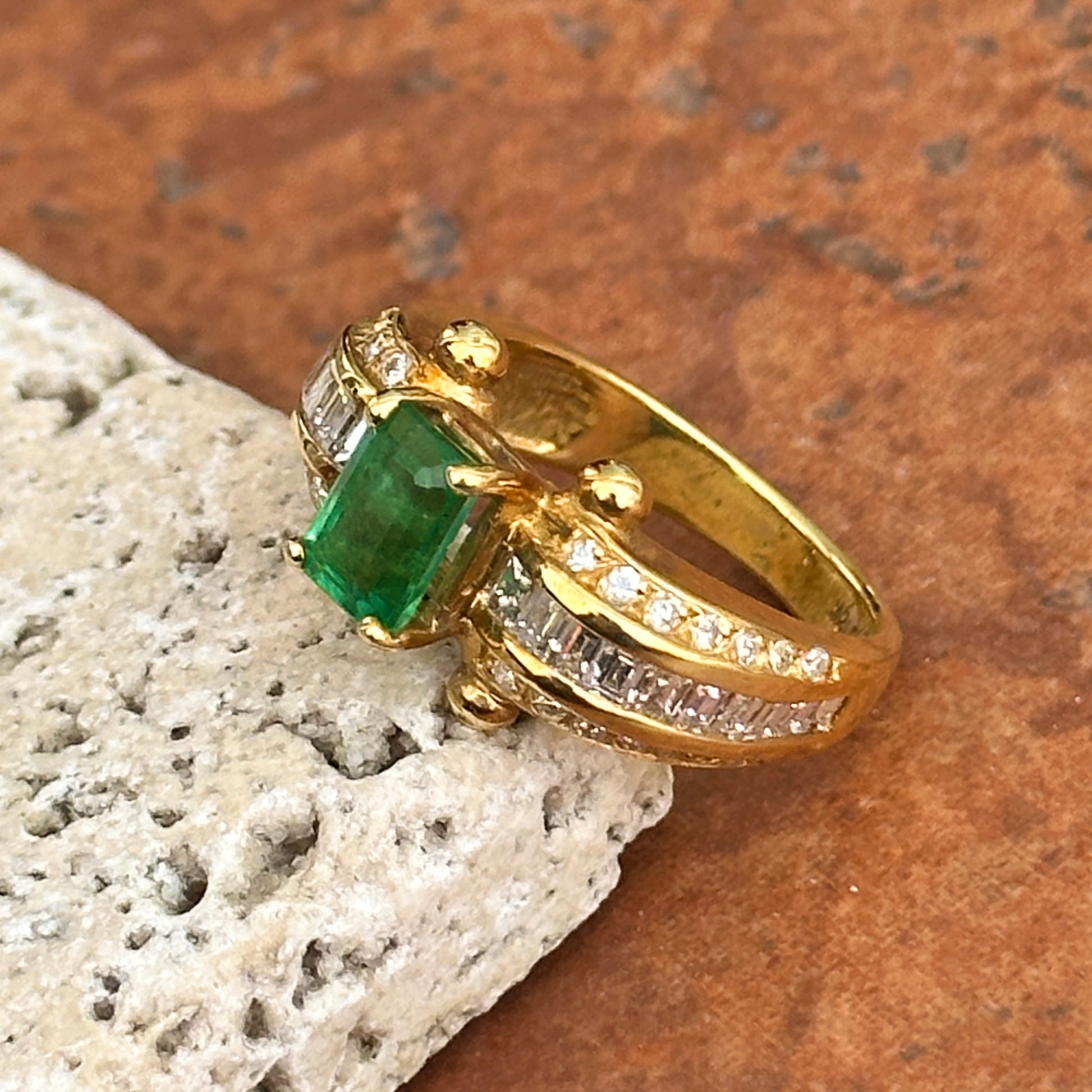 18KT Yellow Gold Emerald Cut Green Emerald + Round and Baguette Diamond Ring
